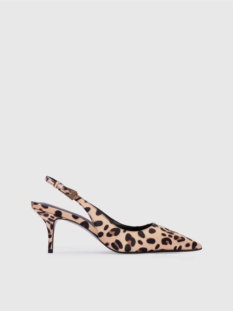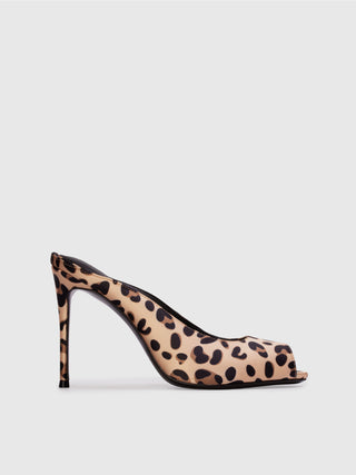 Almond peep toe mule, set on a c-curve mid heel. made with smooth buffed leather.
