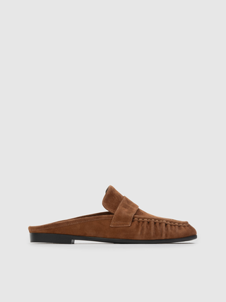 Round toe slip on loafer mule. Made with brushed kid suede.