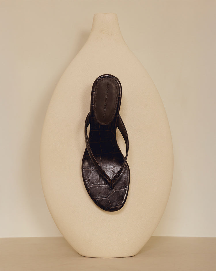 Micro wedge thong mule, set on minimalist curved wedge. Made with croc printed leather.