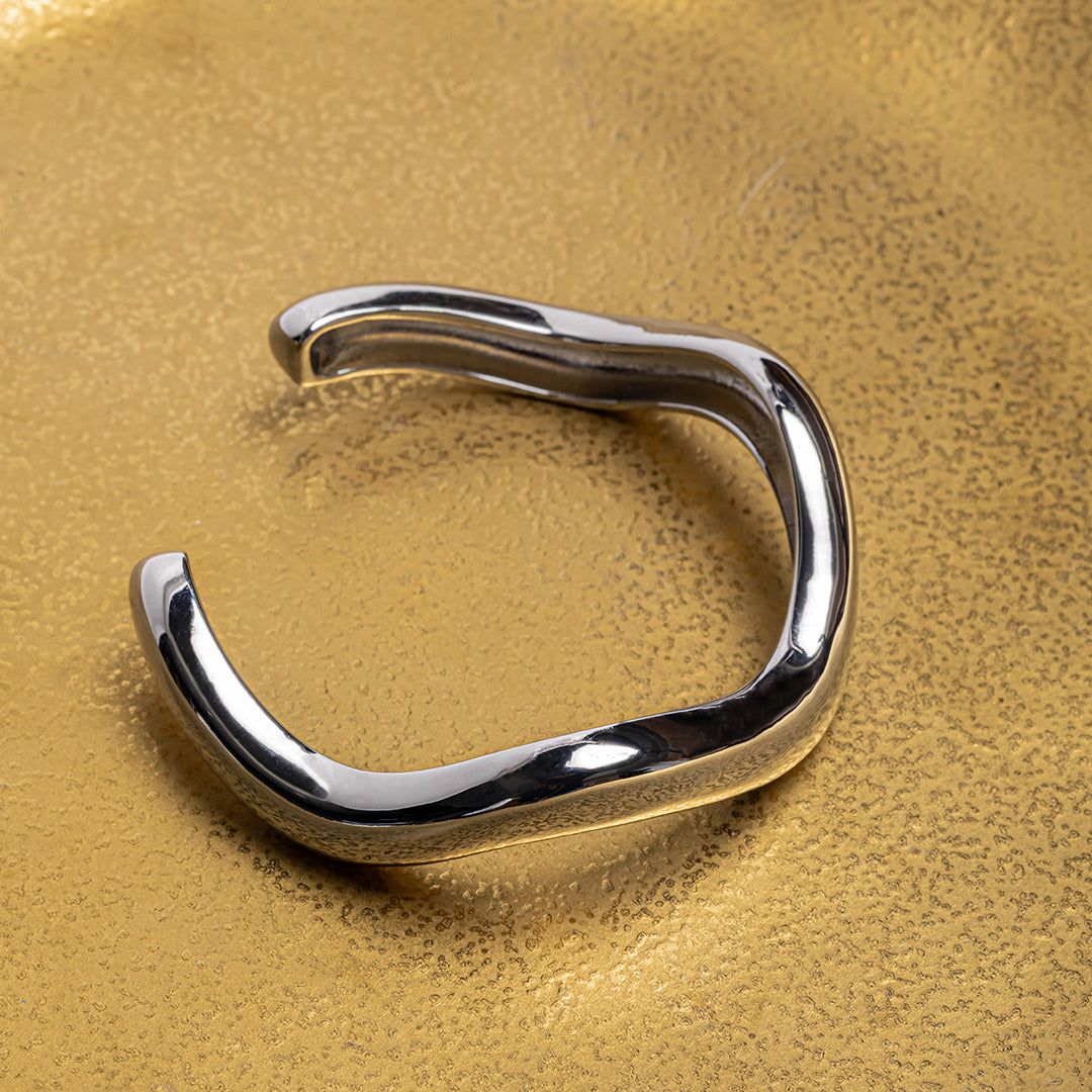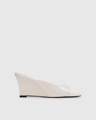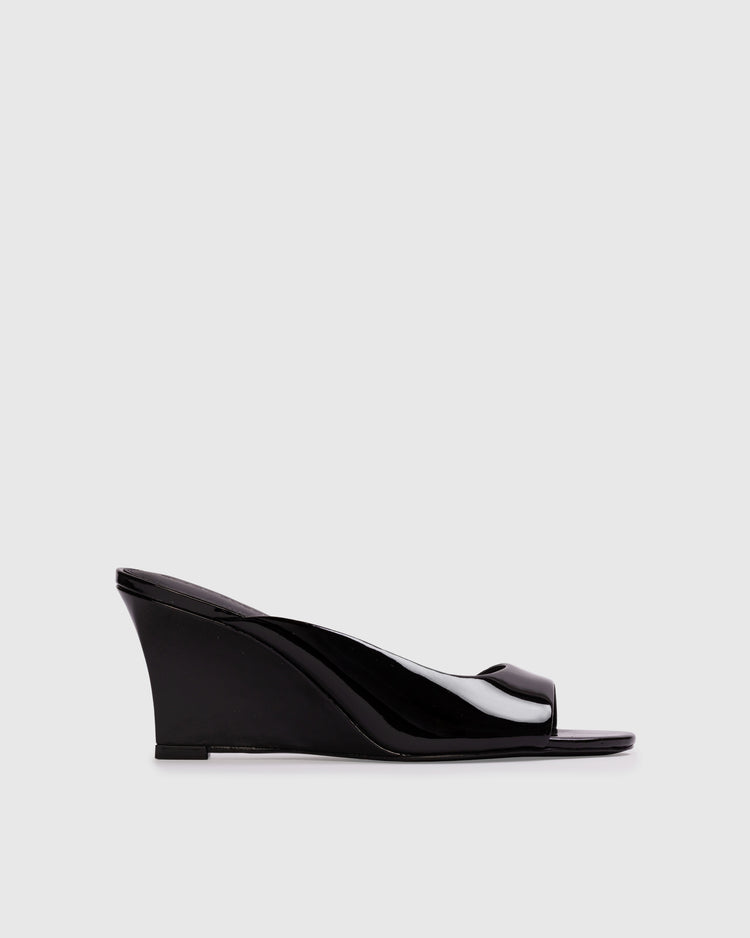Round toe slip on mule with a asymmetrical upper design, set on a mid-height sleek wedge. Made with smooth patent leather.