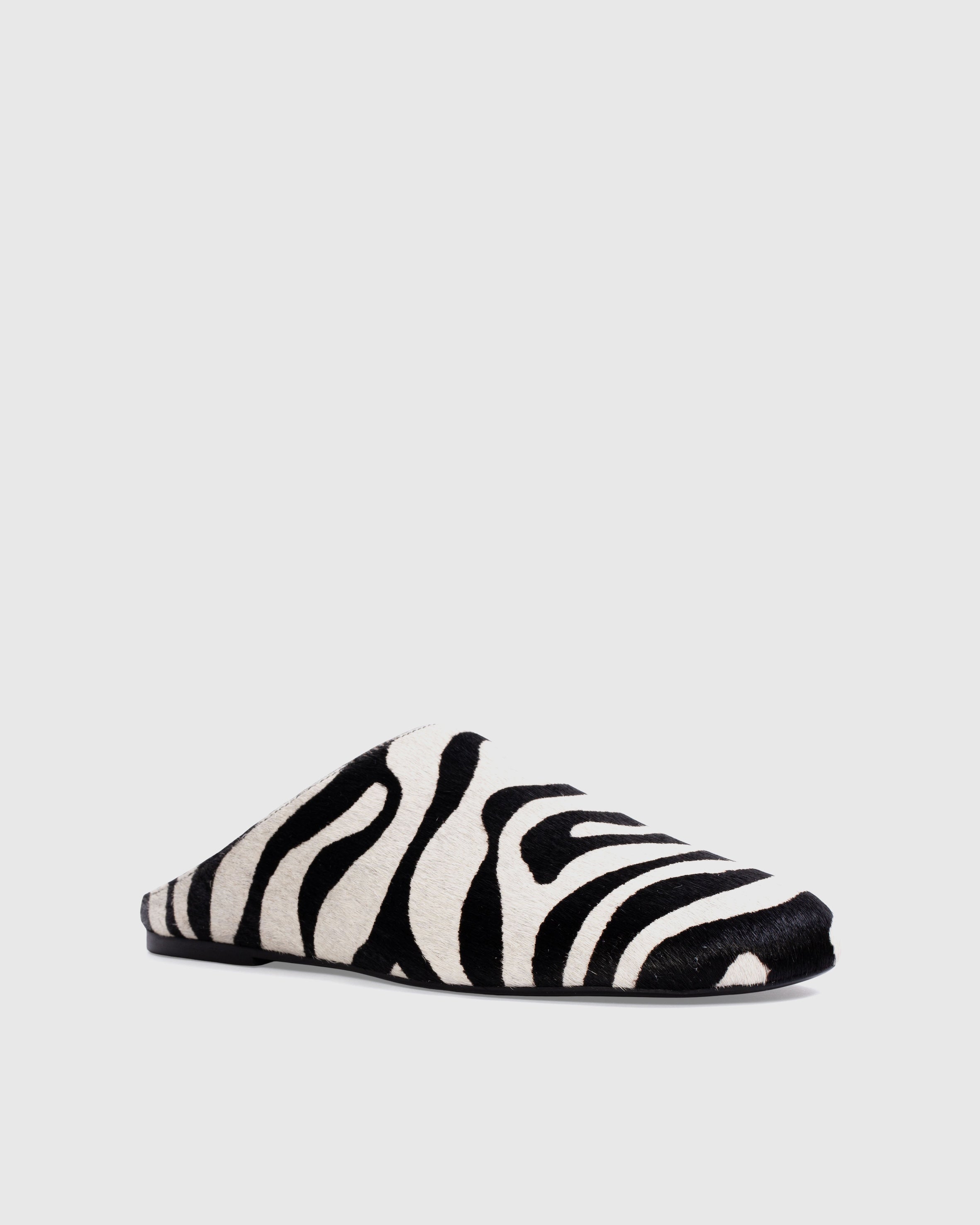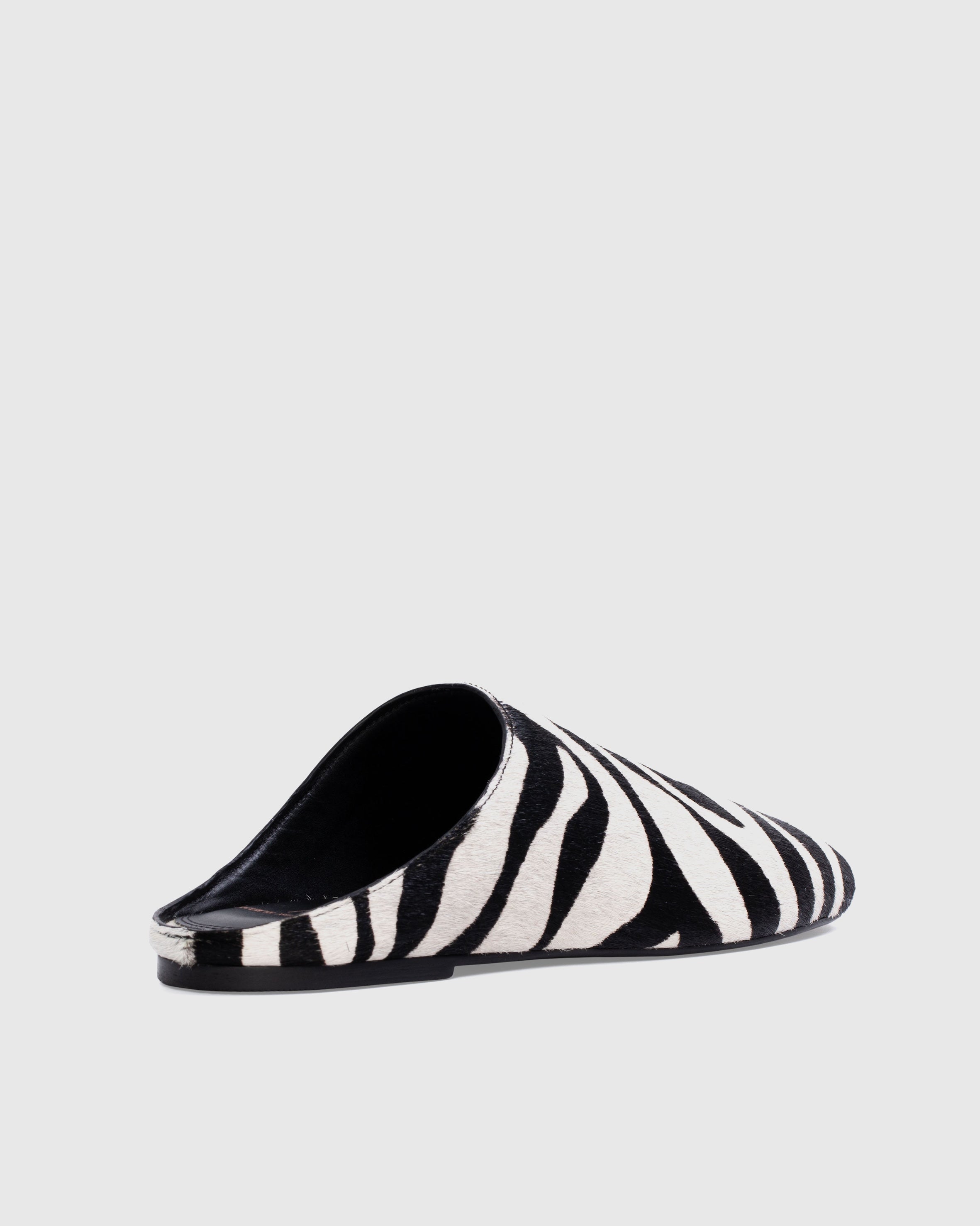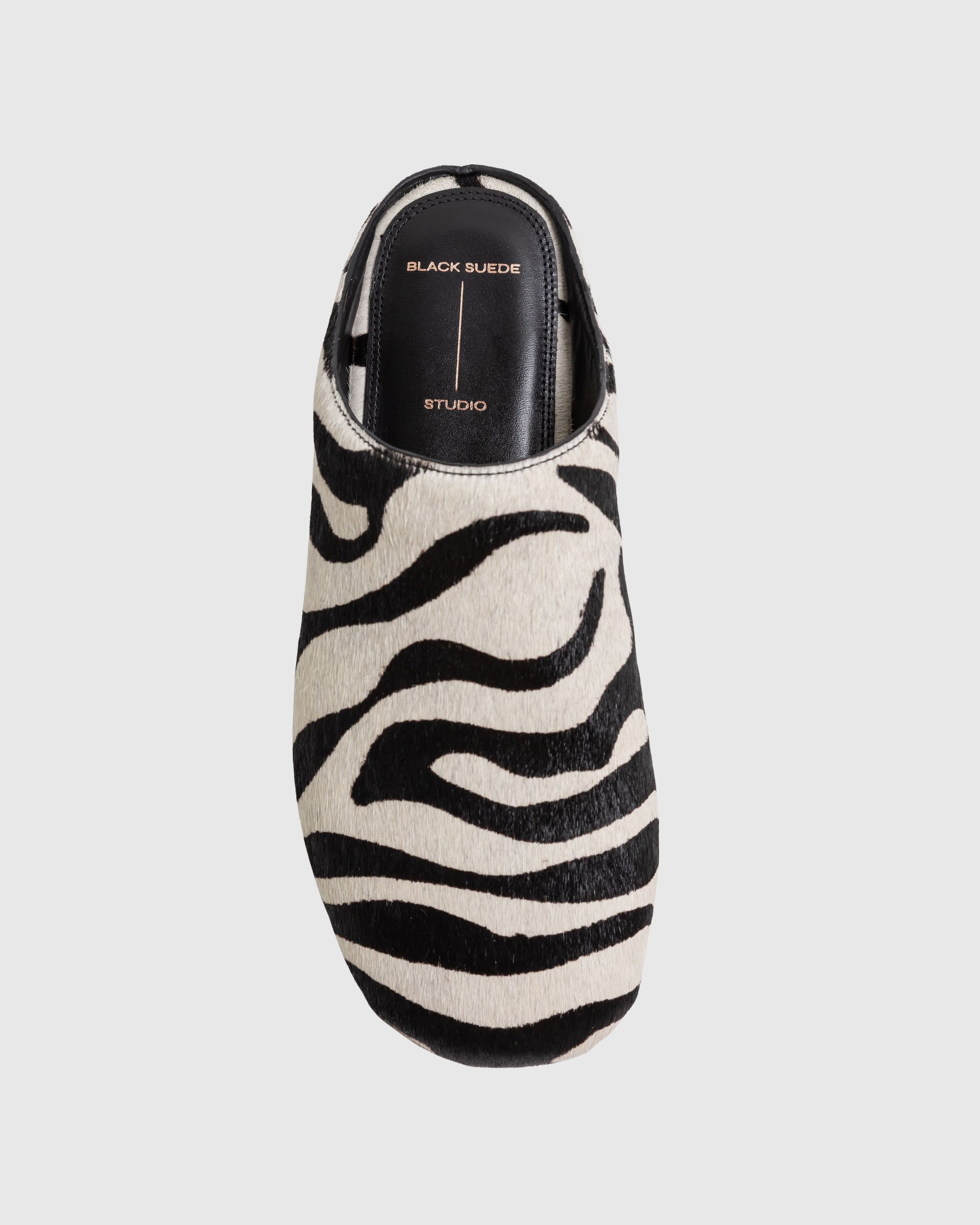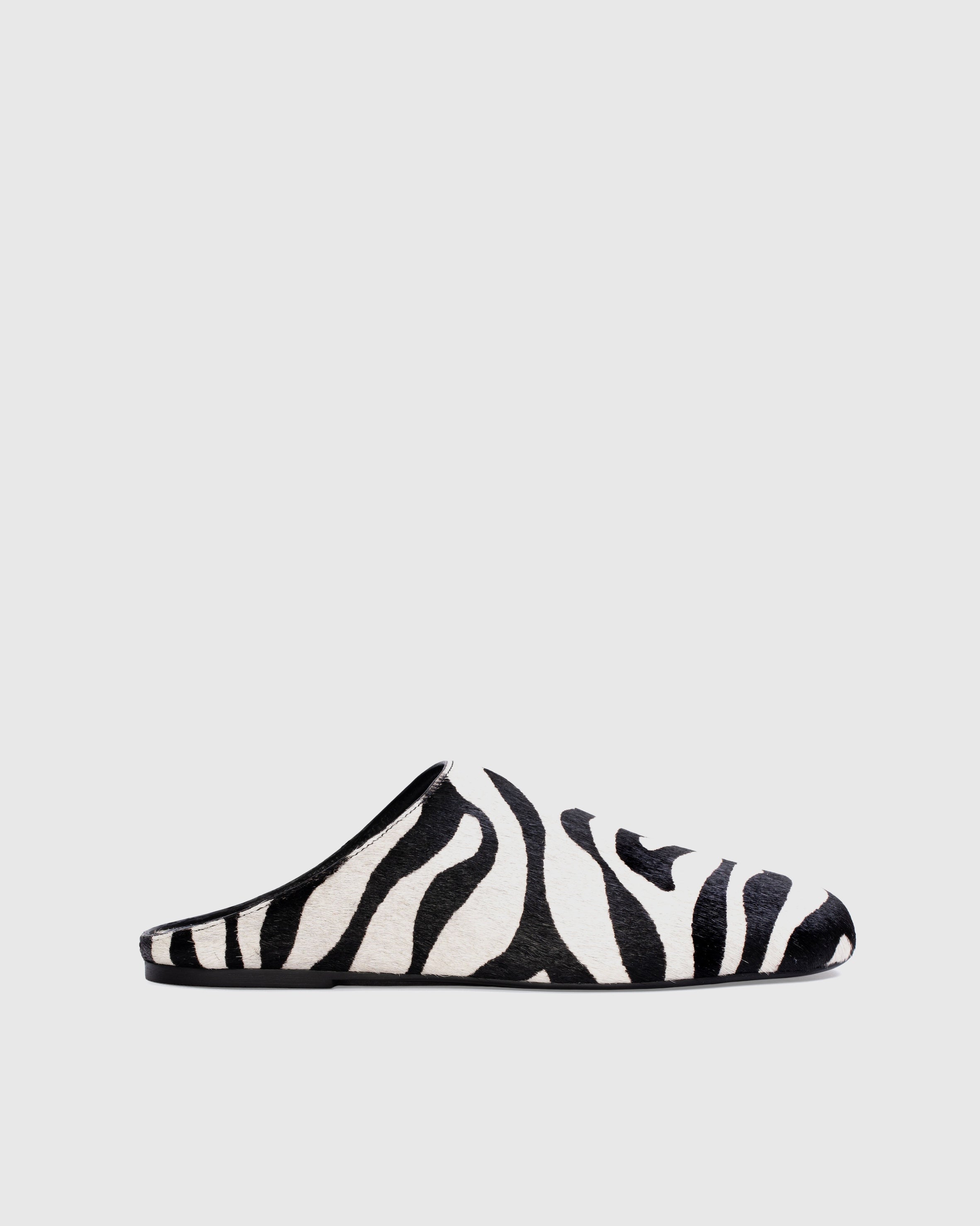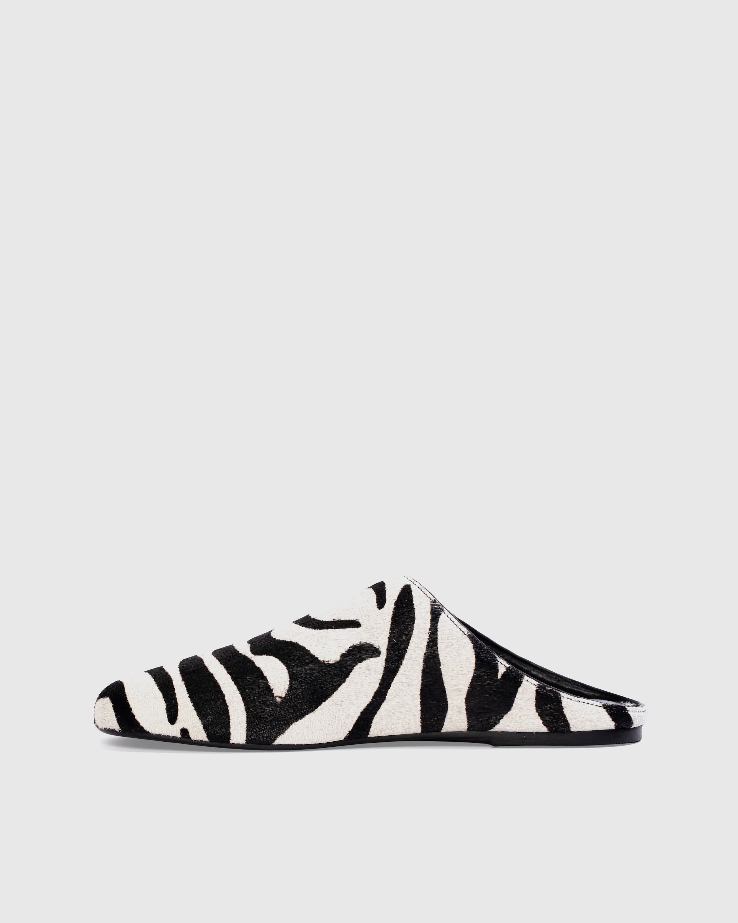 Round toe outdoor slip on mule. Made with brushed zebra printed pony hair.