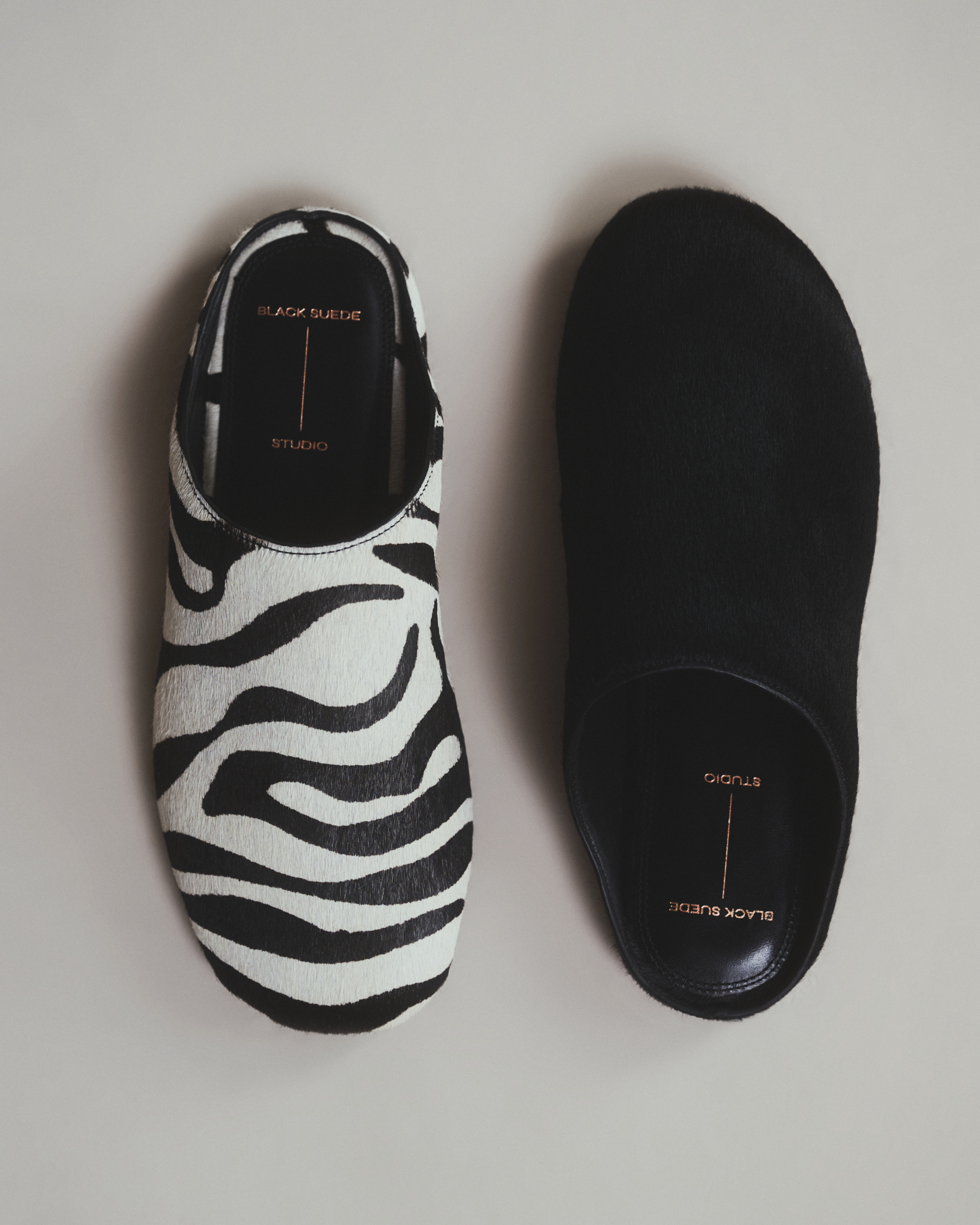 round toe slip on flat mule. Made with brushed pony hair.