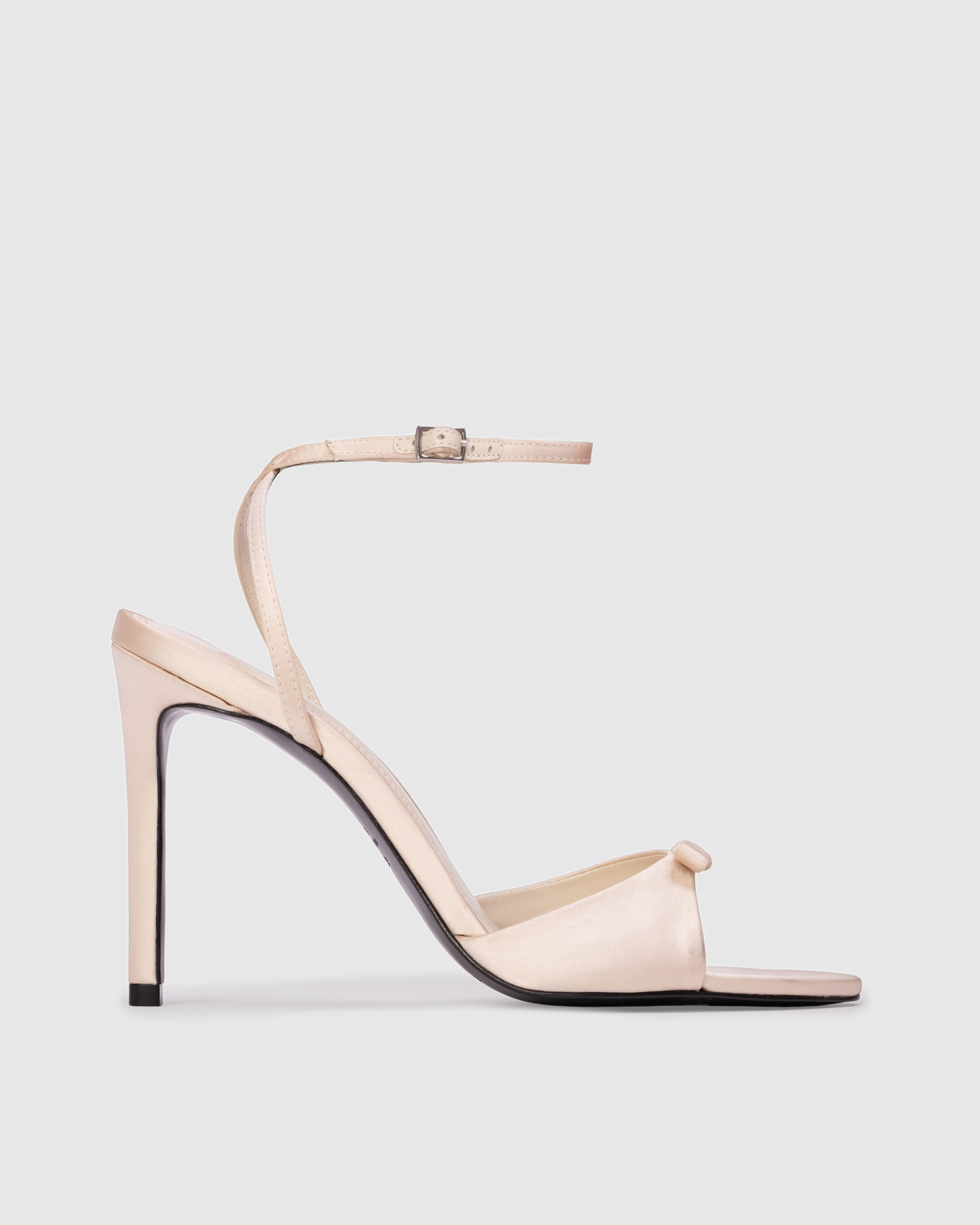 round toe sandal with bow detail, set on a straight stiletto heel. Made with satin crepe.