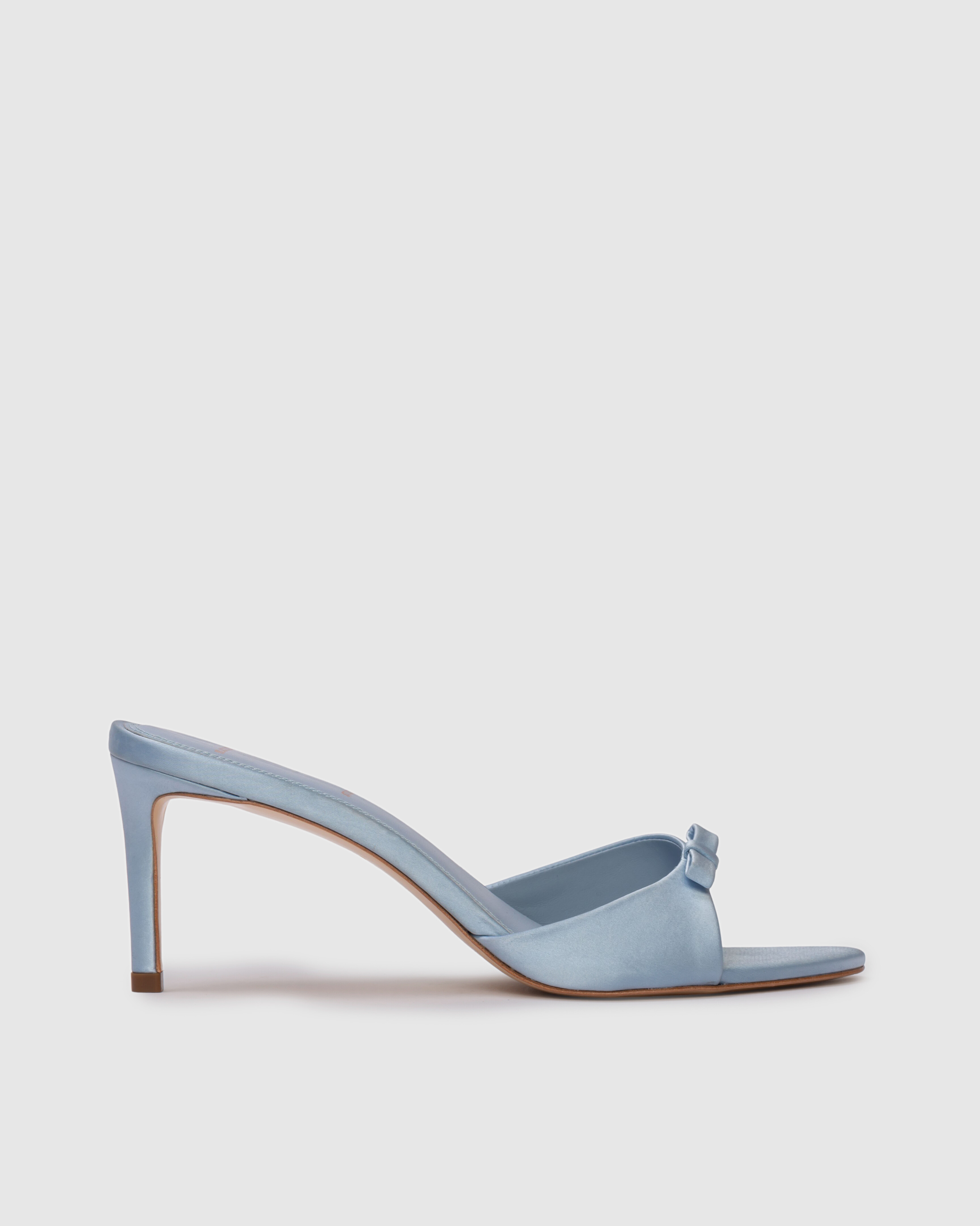round toe slipper mule with bow detail, set on a straight mid heel. Made with satin crepe.