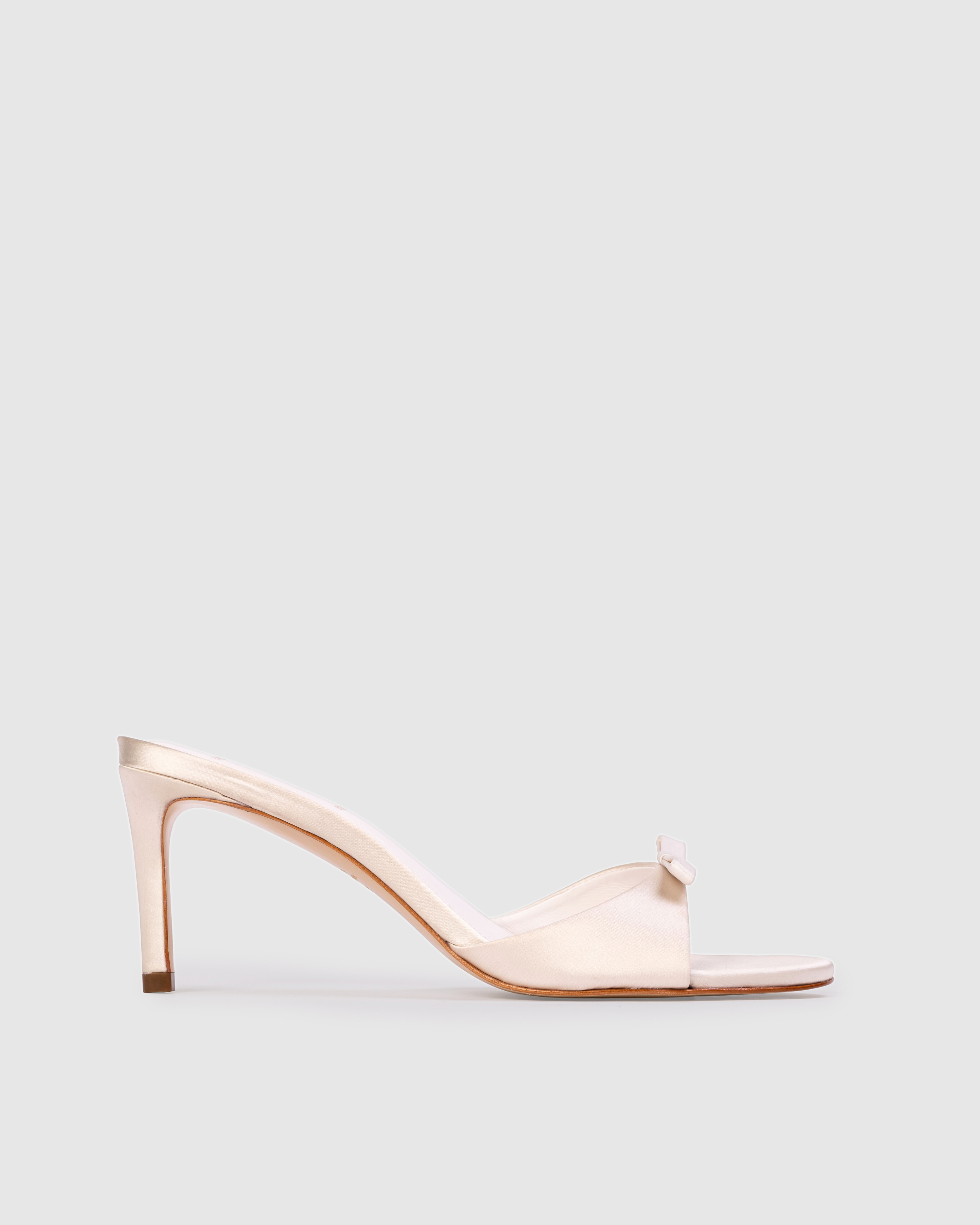 round toe slipper mule with bow detail, set on a straight mid heel. Made with satin crepe.