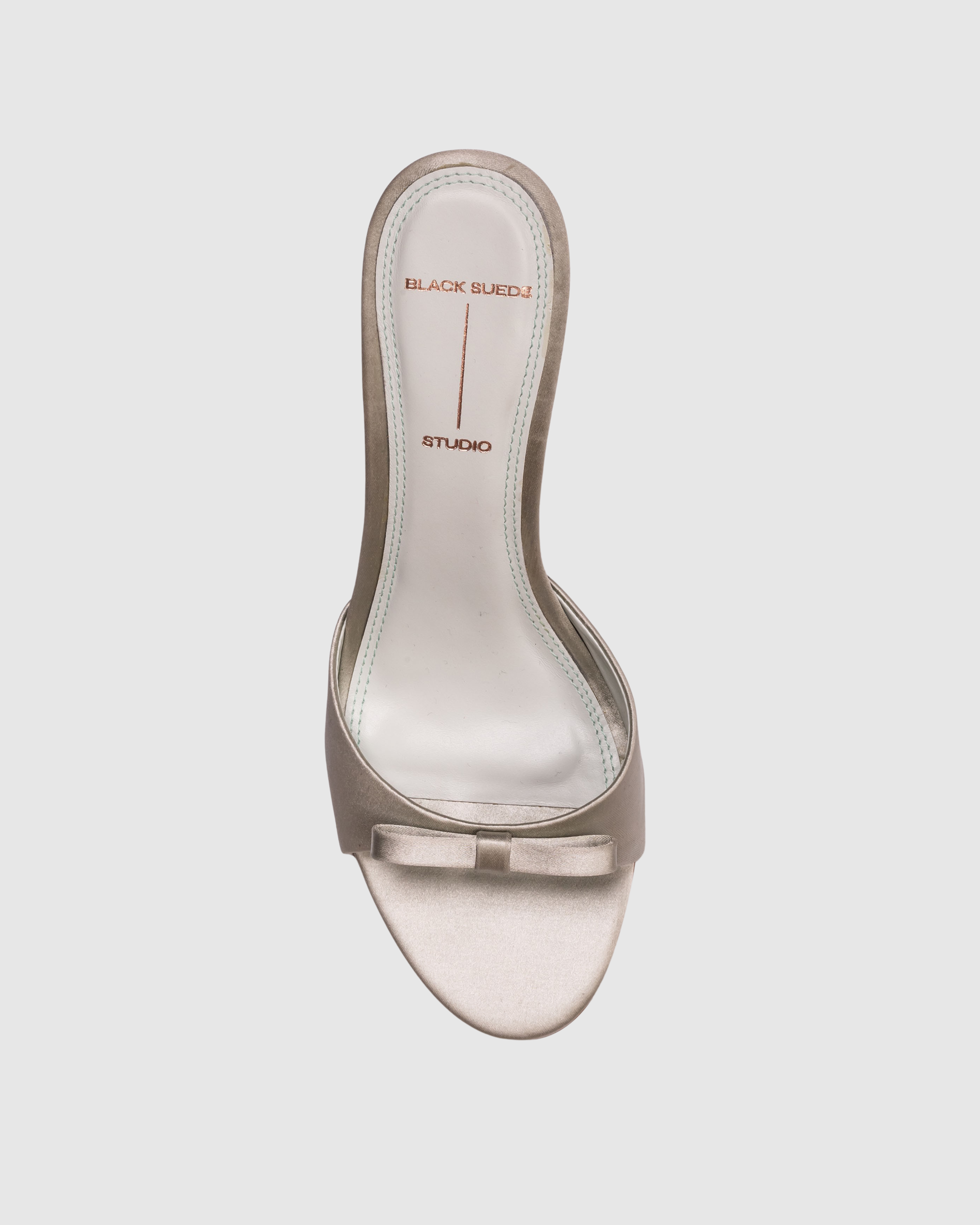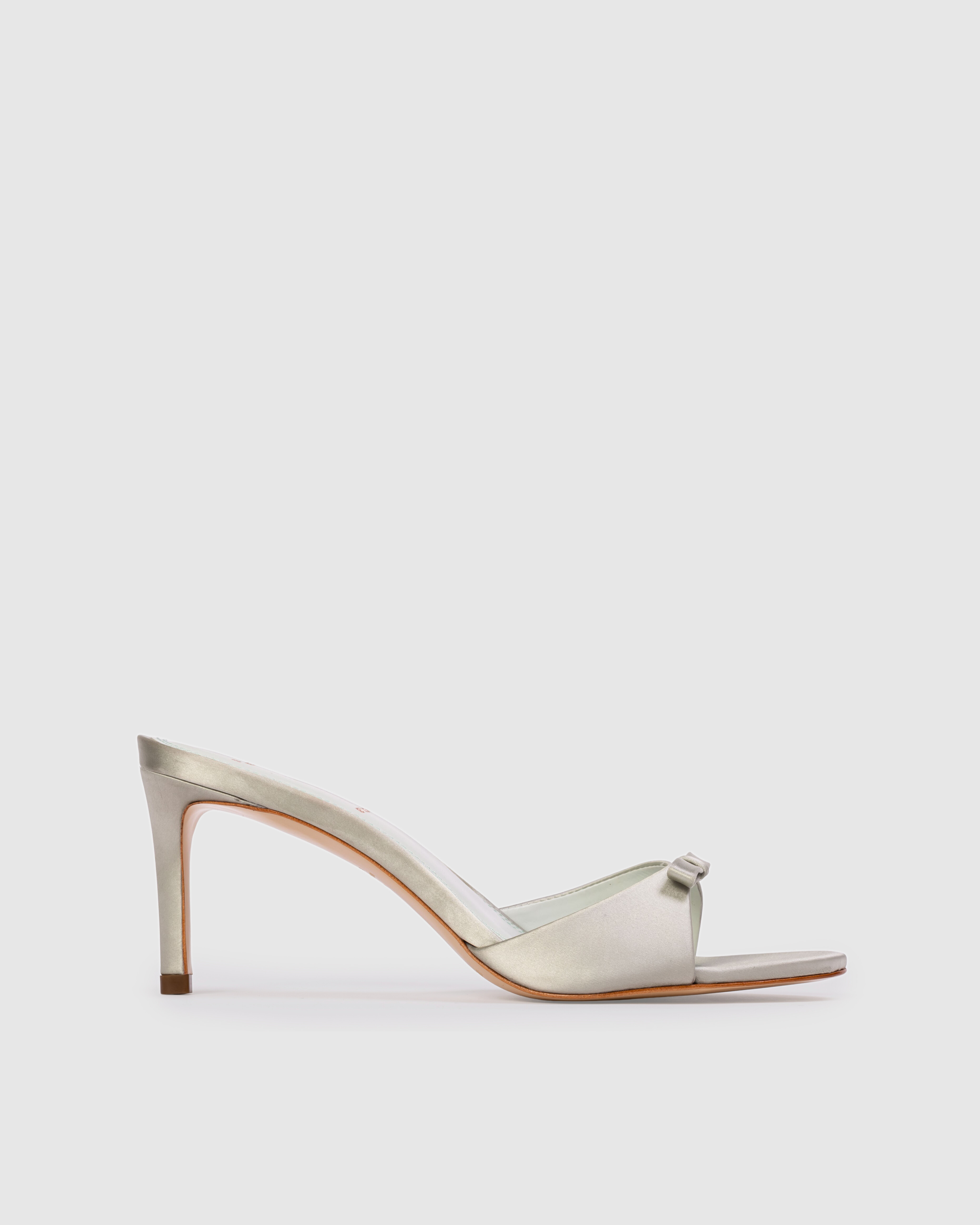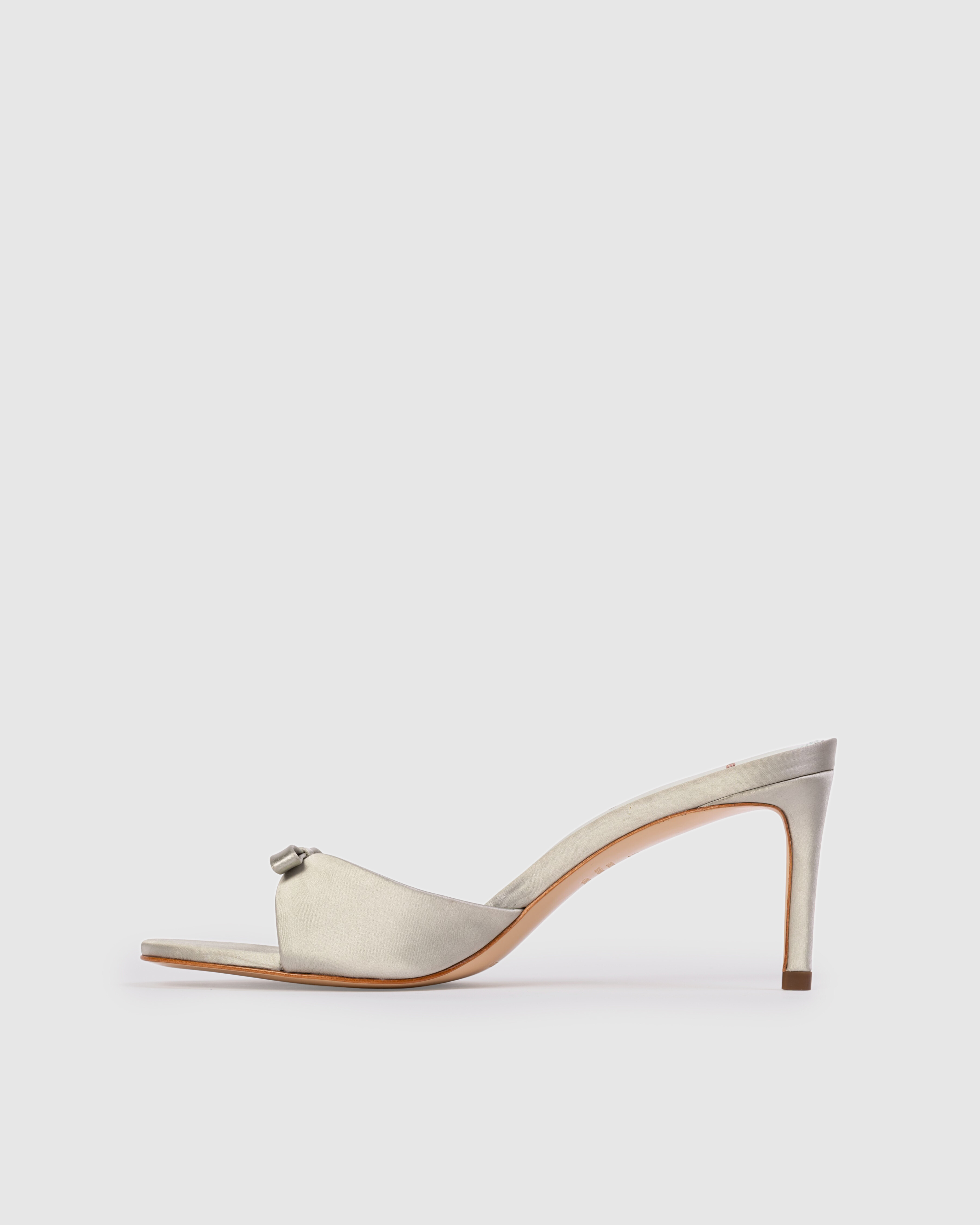 round toe slipper mule with bow detail, set on a straight mid heel. Made with satin crepe.