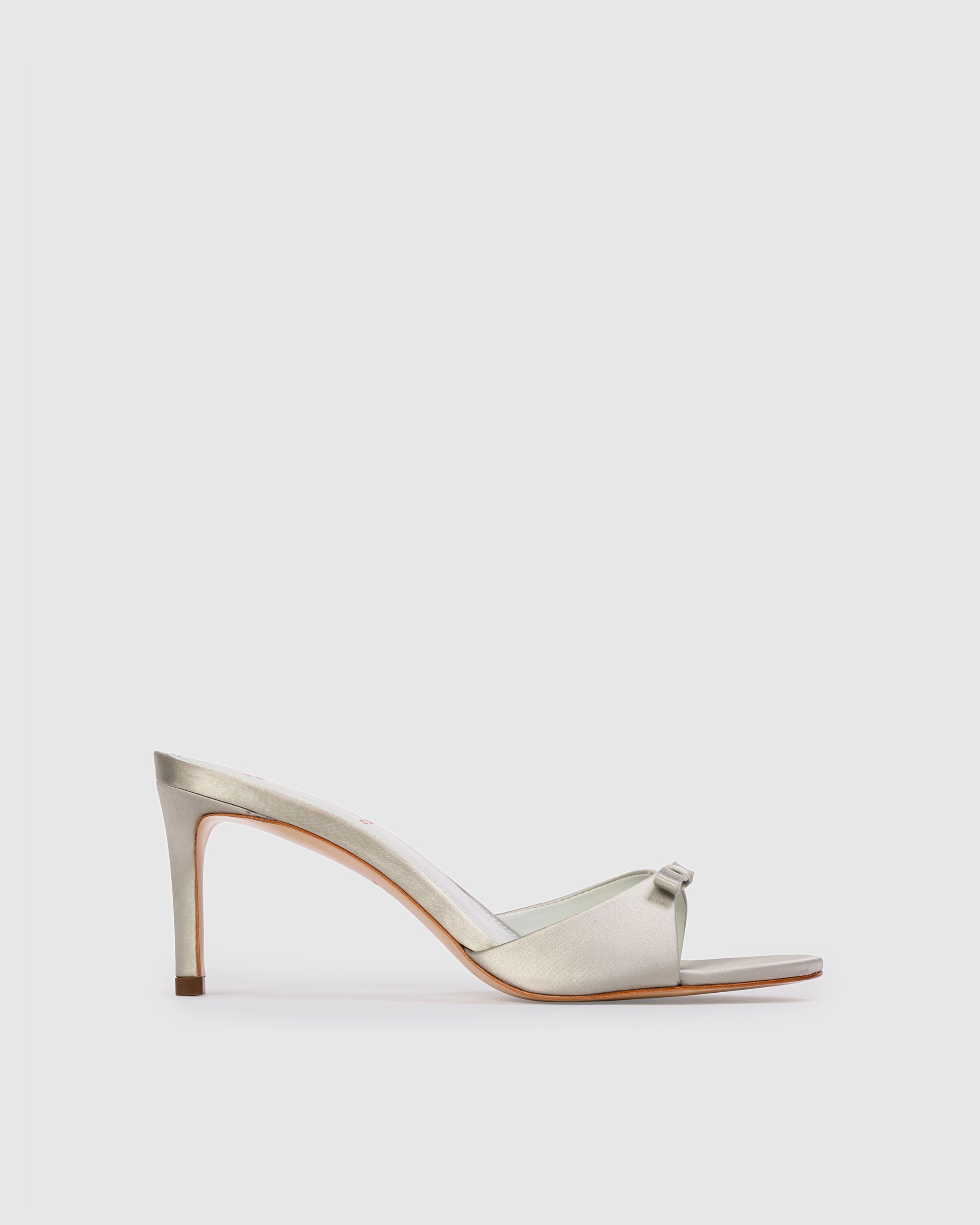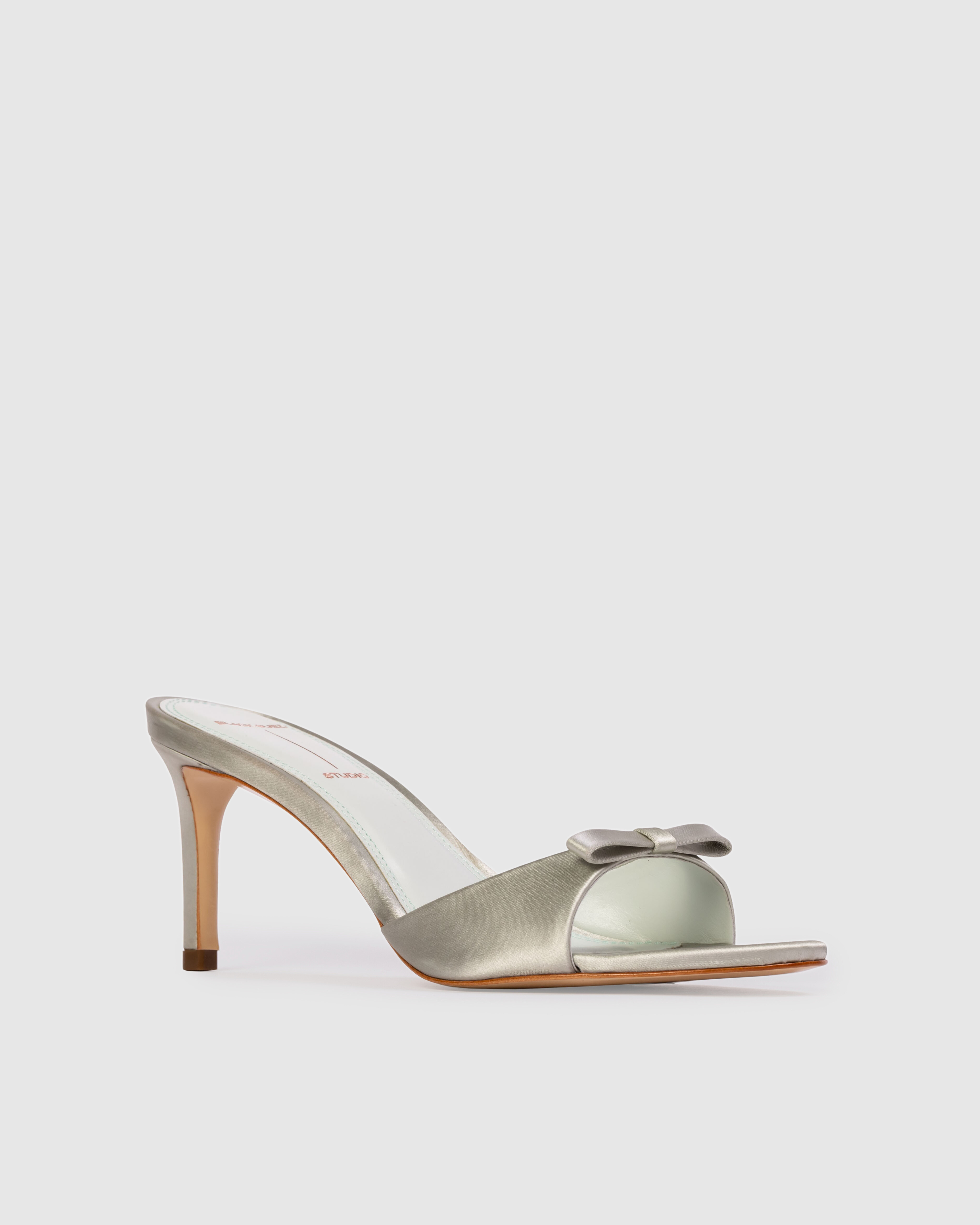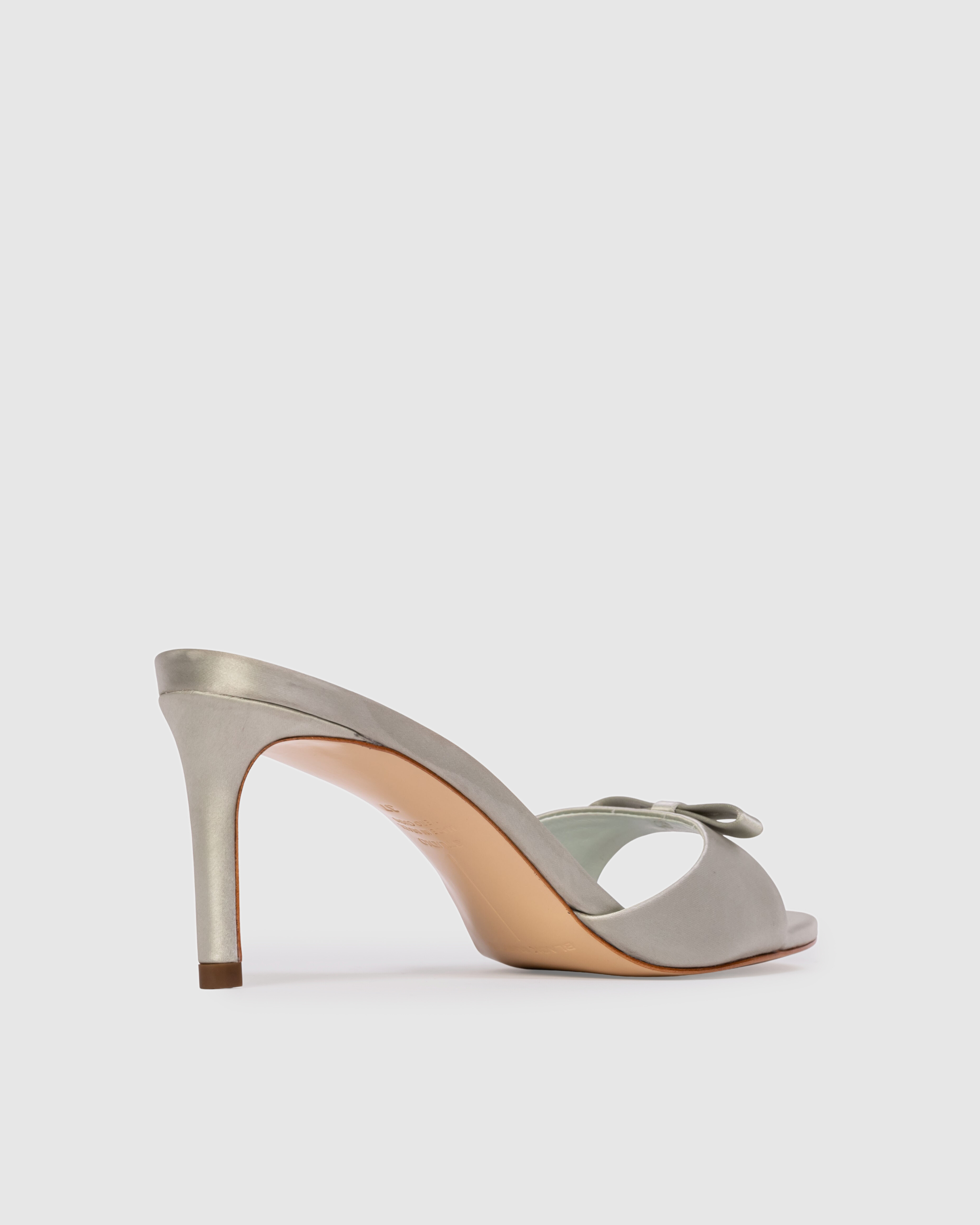 round toe slipper mule with bow detail, set on a straight mid heel. Made with satin crepe.