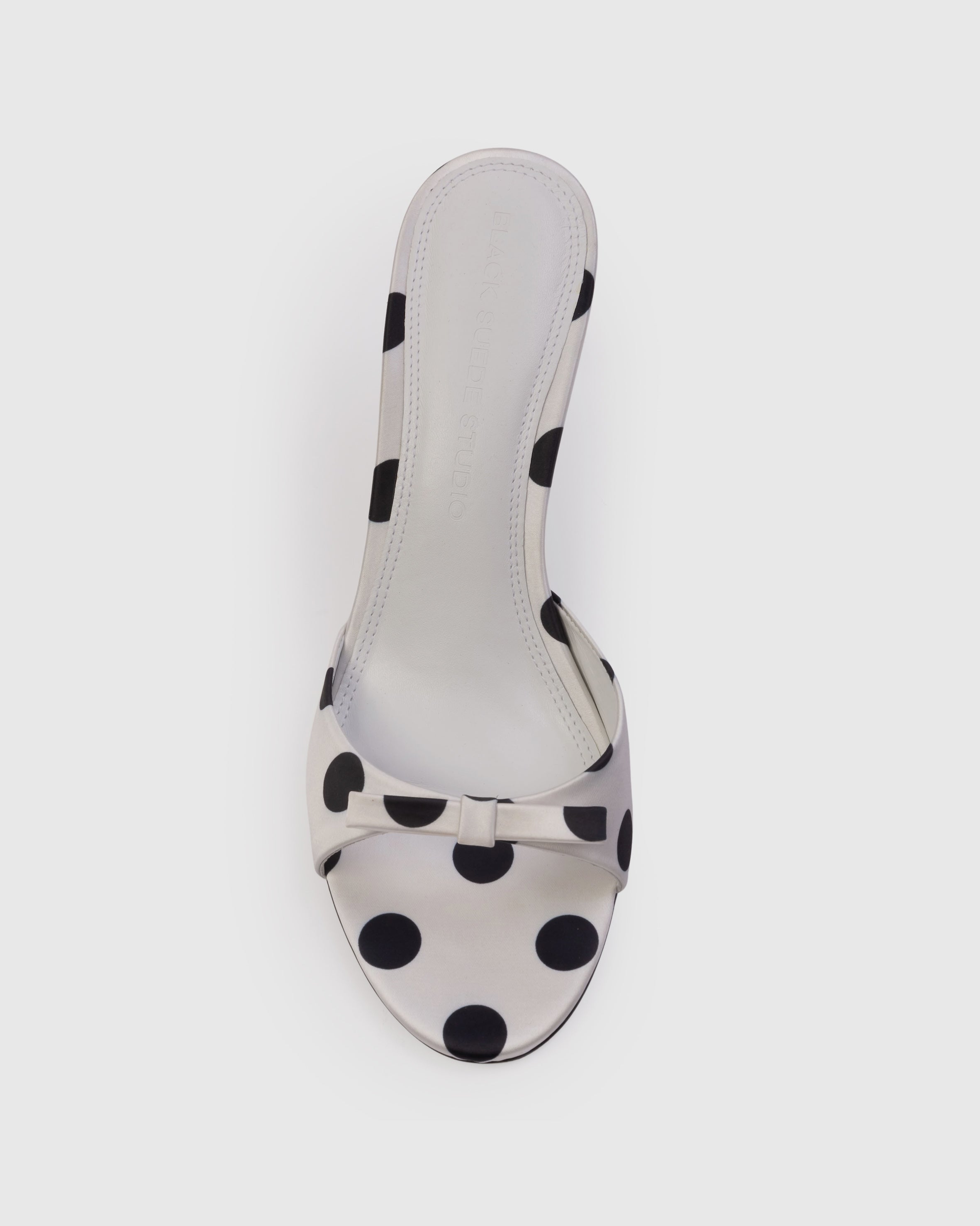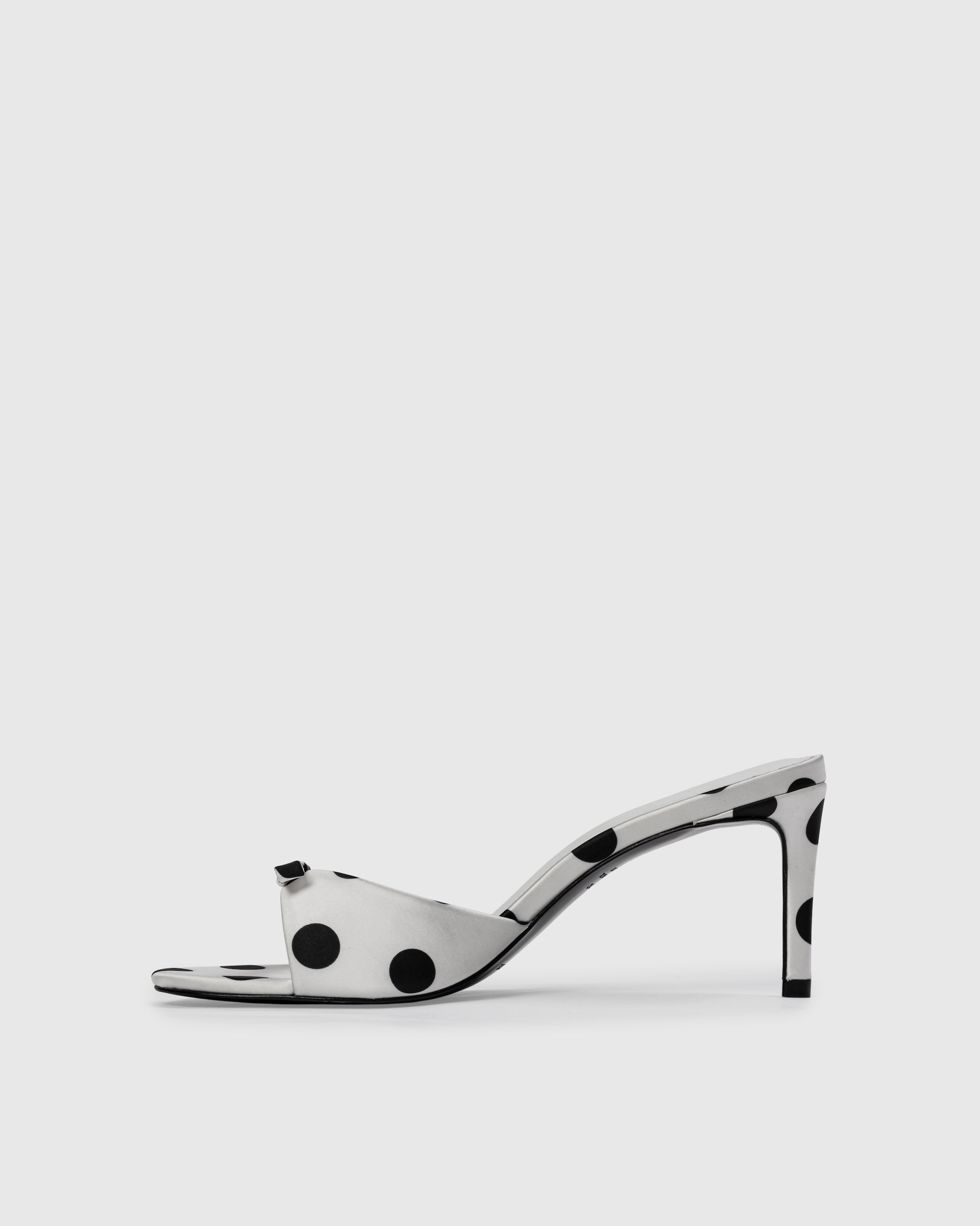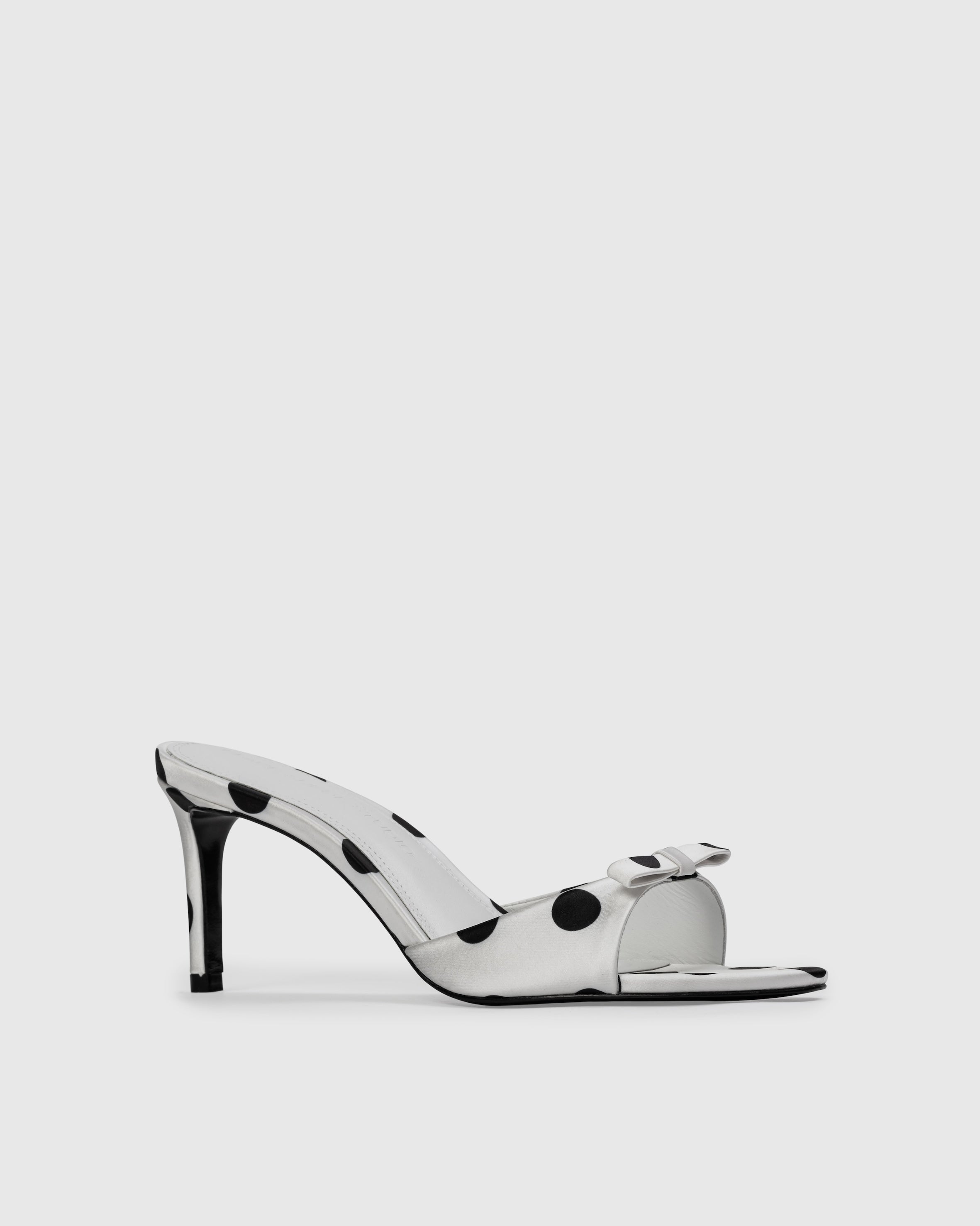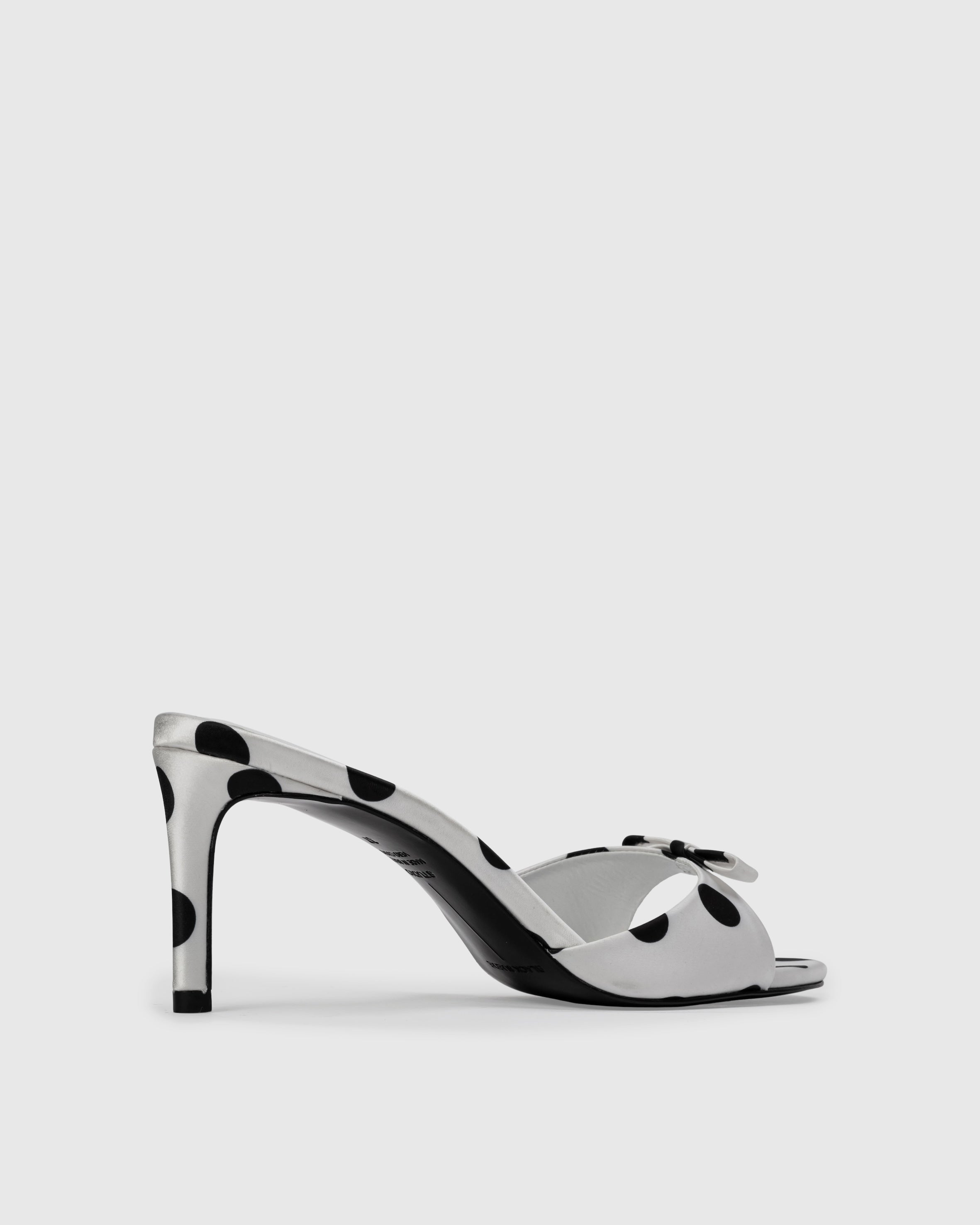 round toe slipper mule with bow detail, set on a straight mid heel. Made with satin crepe.