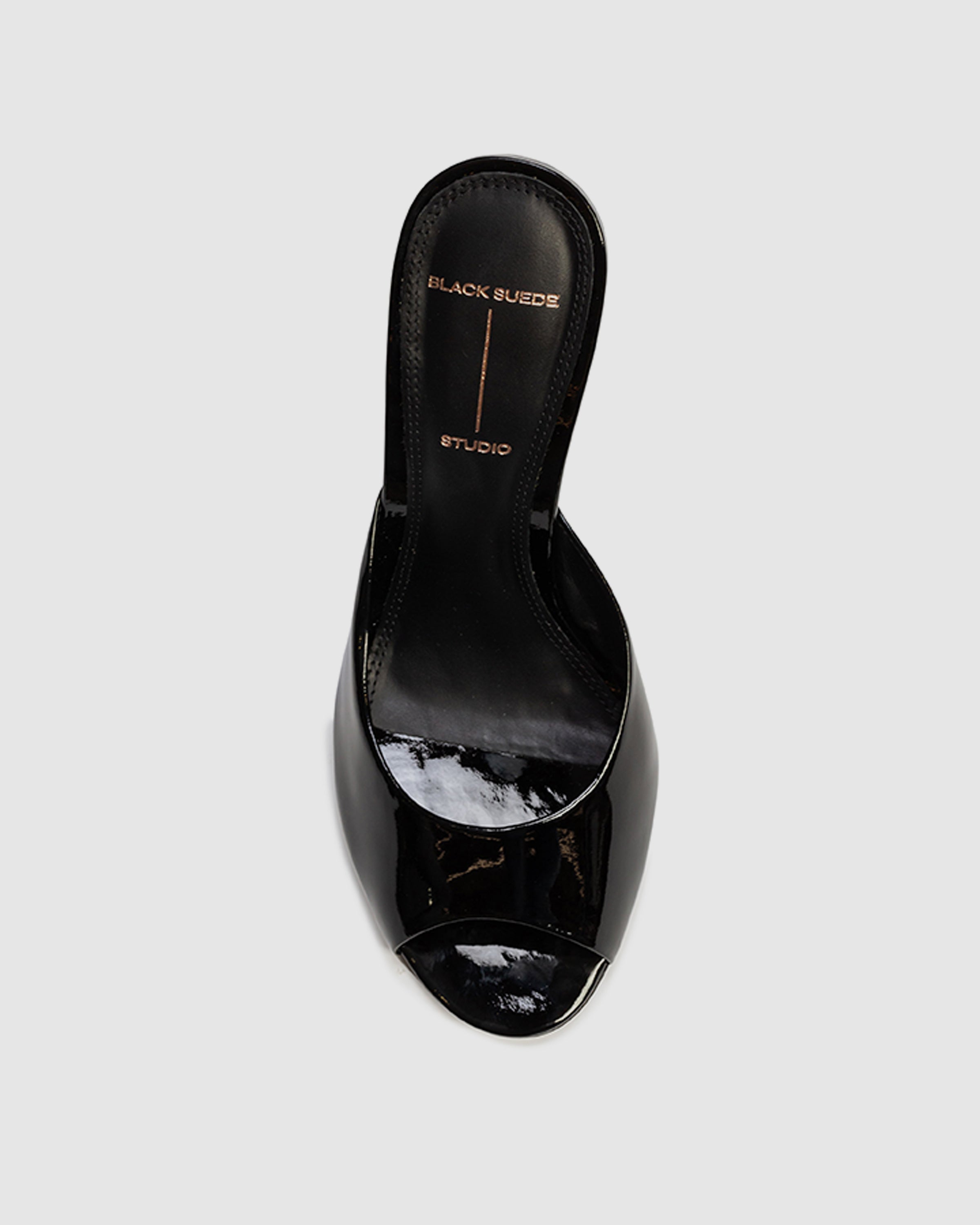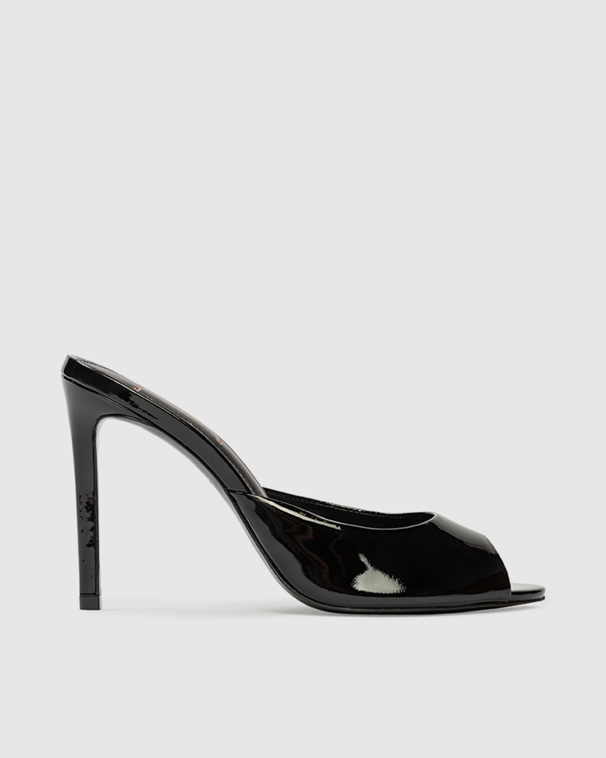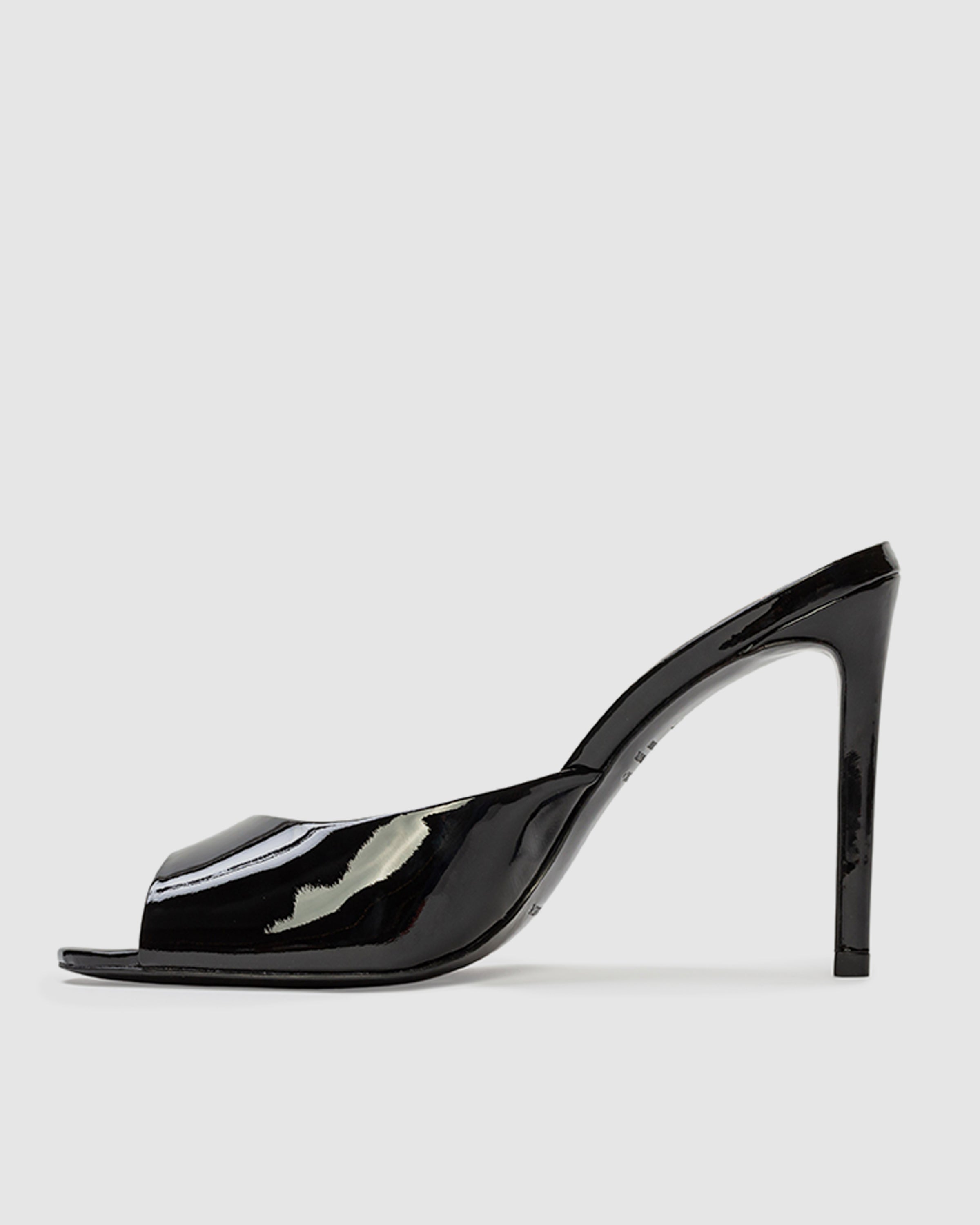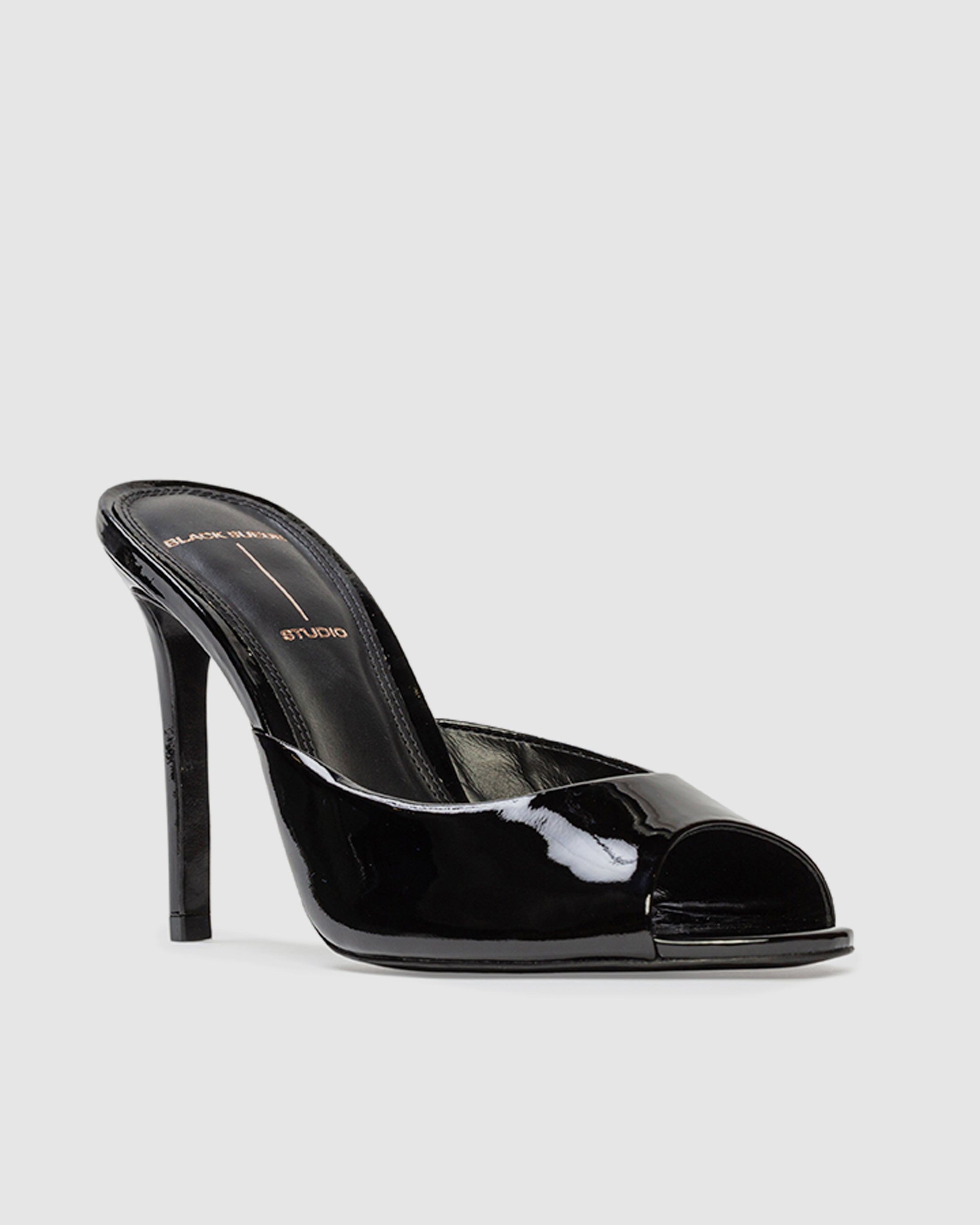 Round toe slipper mule, set on a straight stiletto heel. Made with patent finished leather.