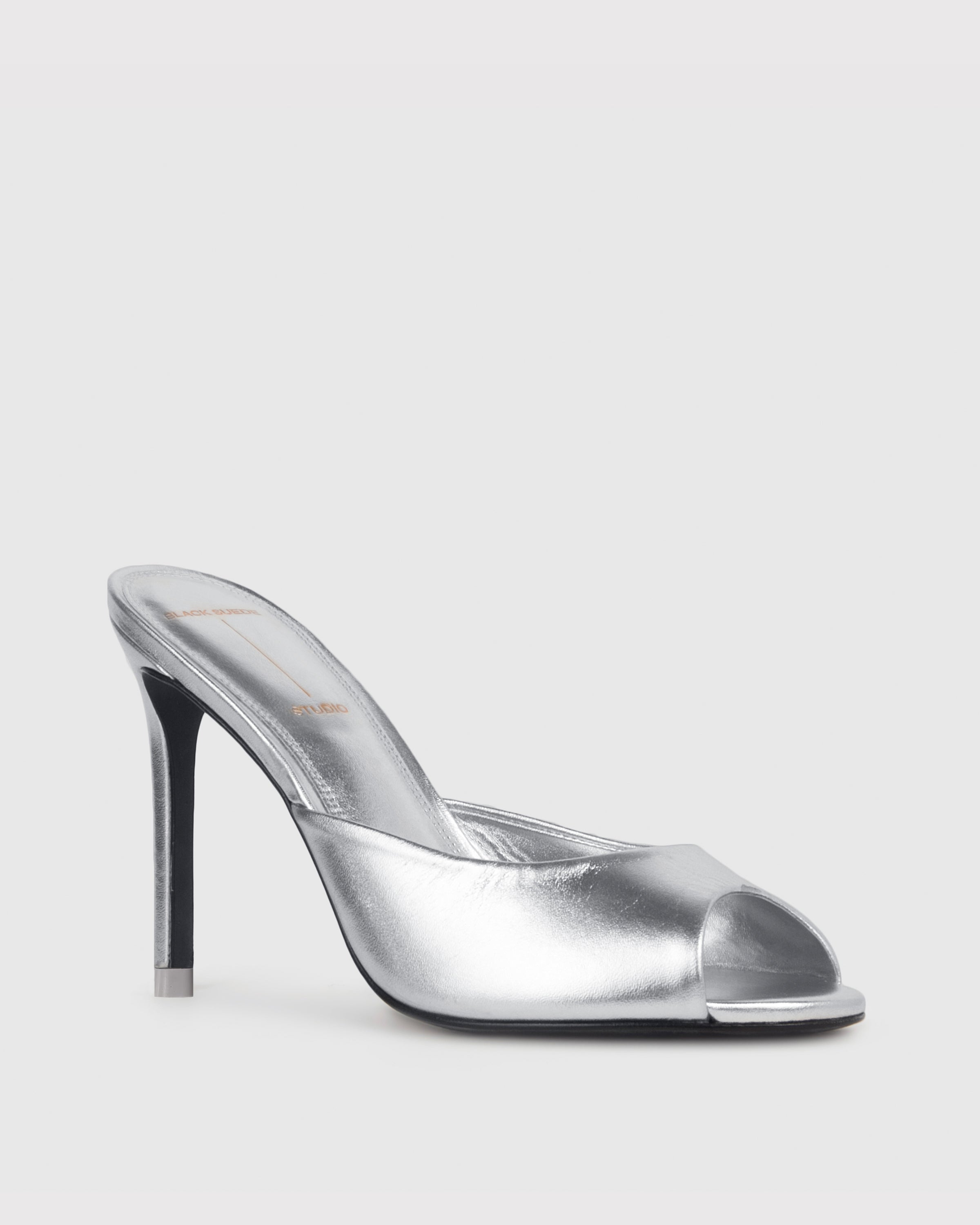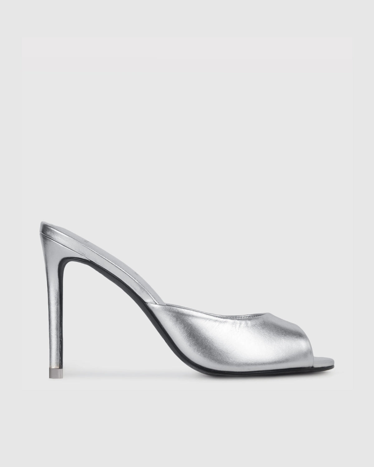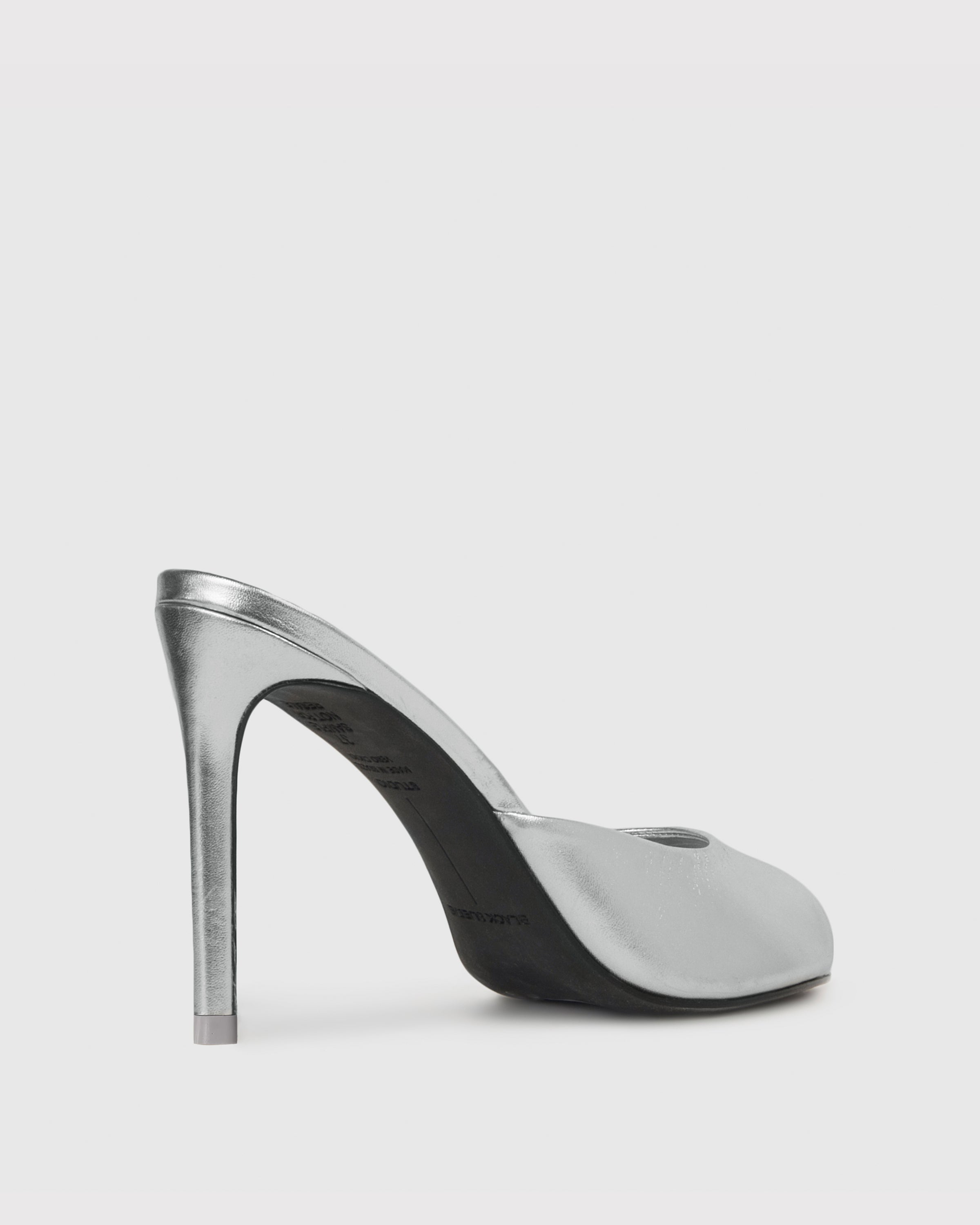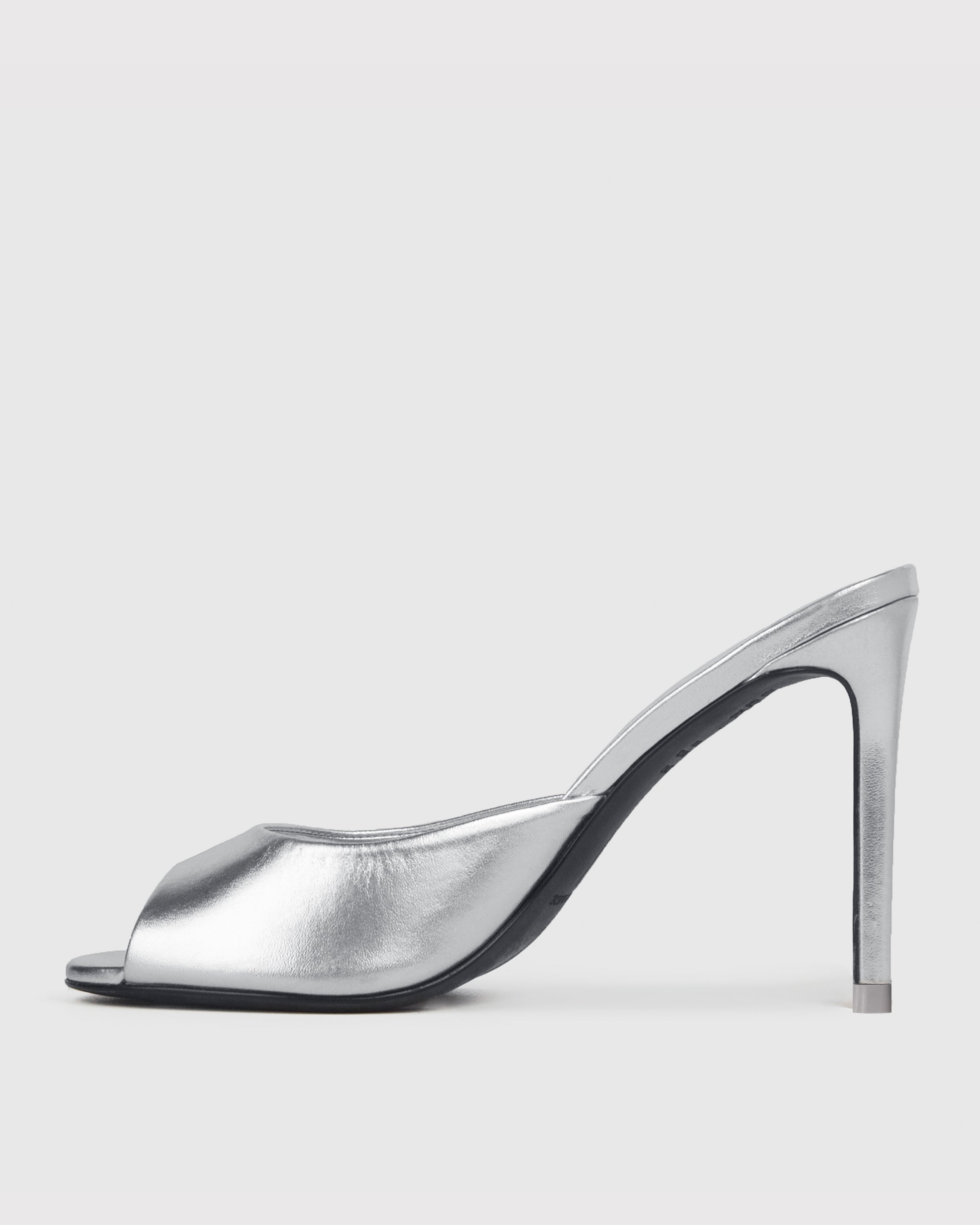 Round toe slipper mule, set on a straight stiletto heel. Made with smooth metallic finished leather.