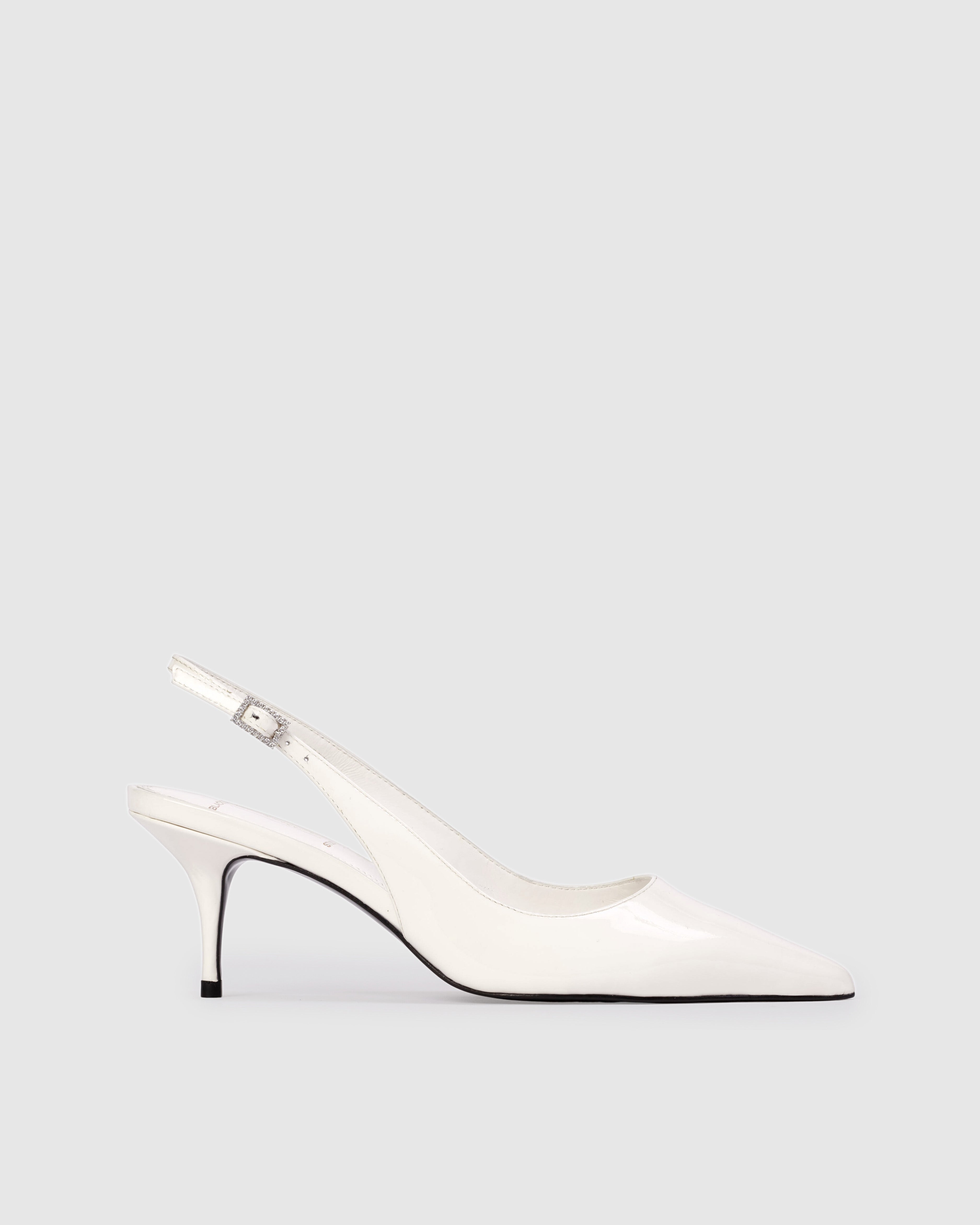 Pointy toe sling back pump, set on a curved mid heel. Made with patent finished leather.