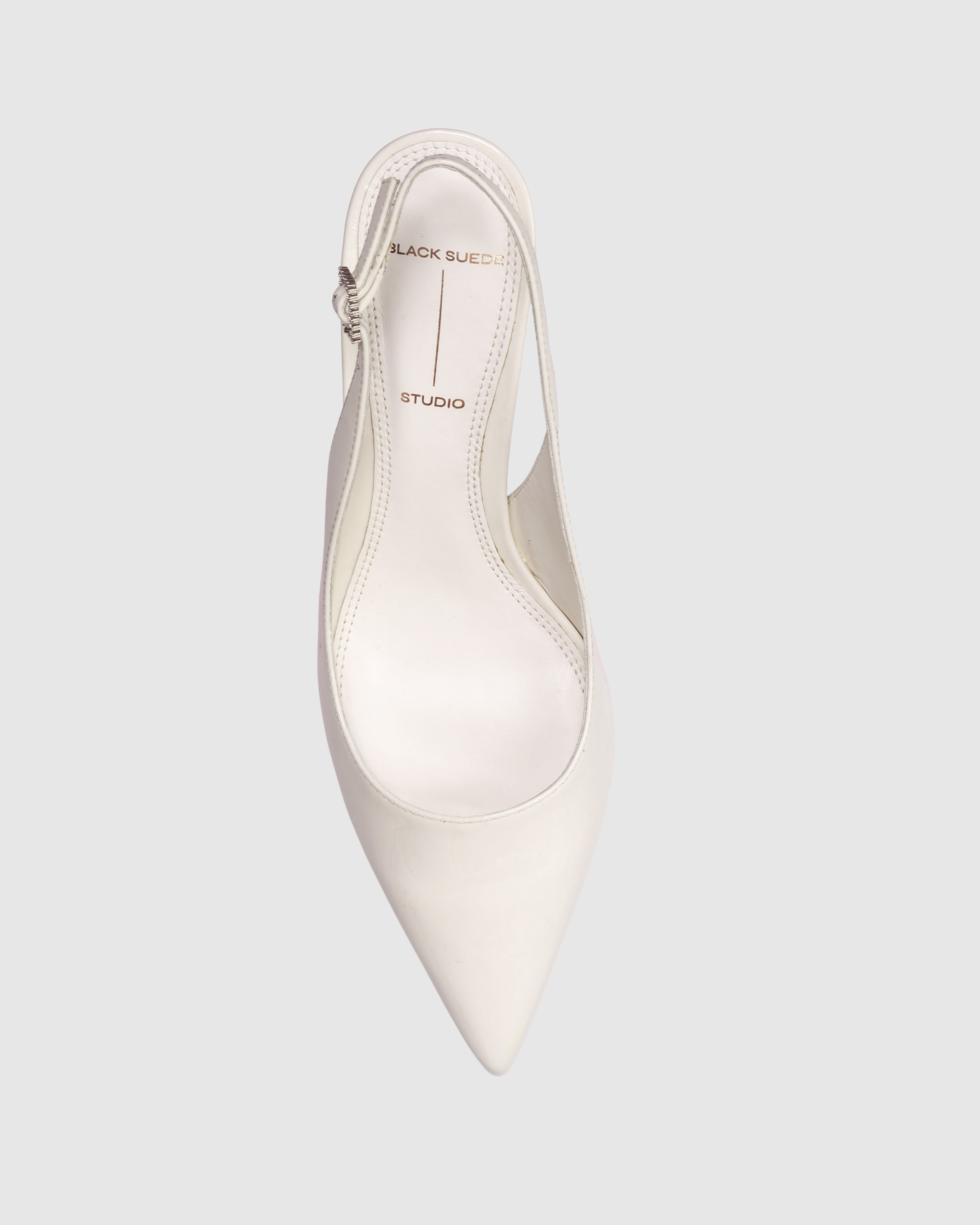 Pointy toe sling back pump, set on a curved kitten heel.