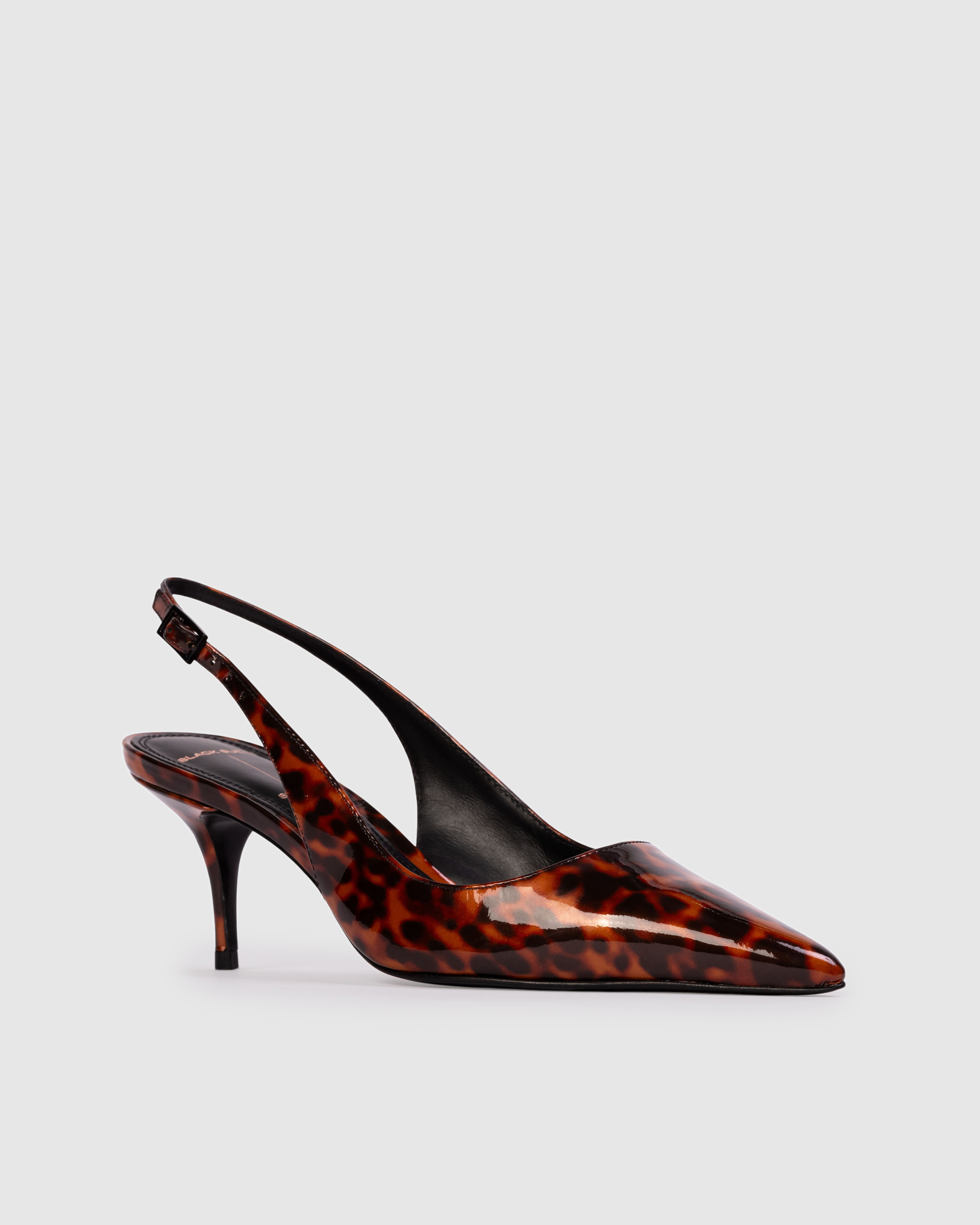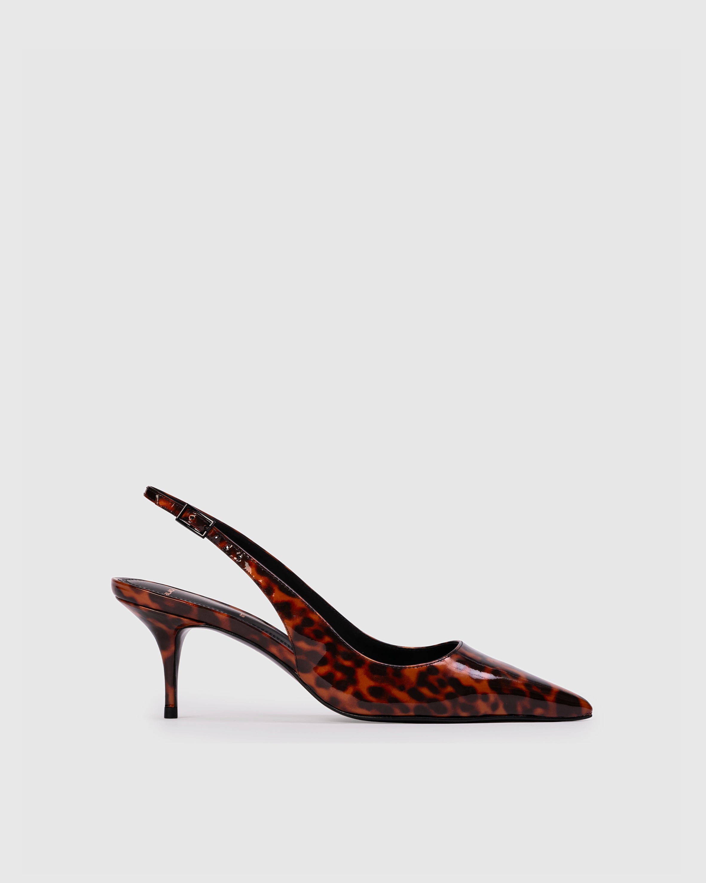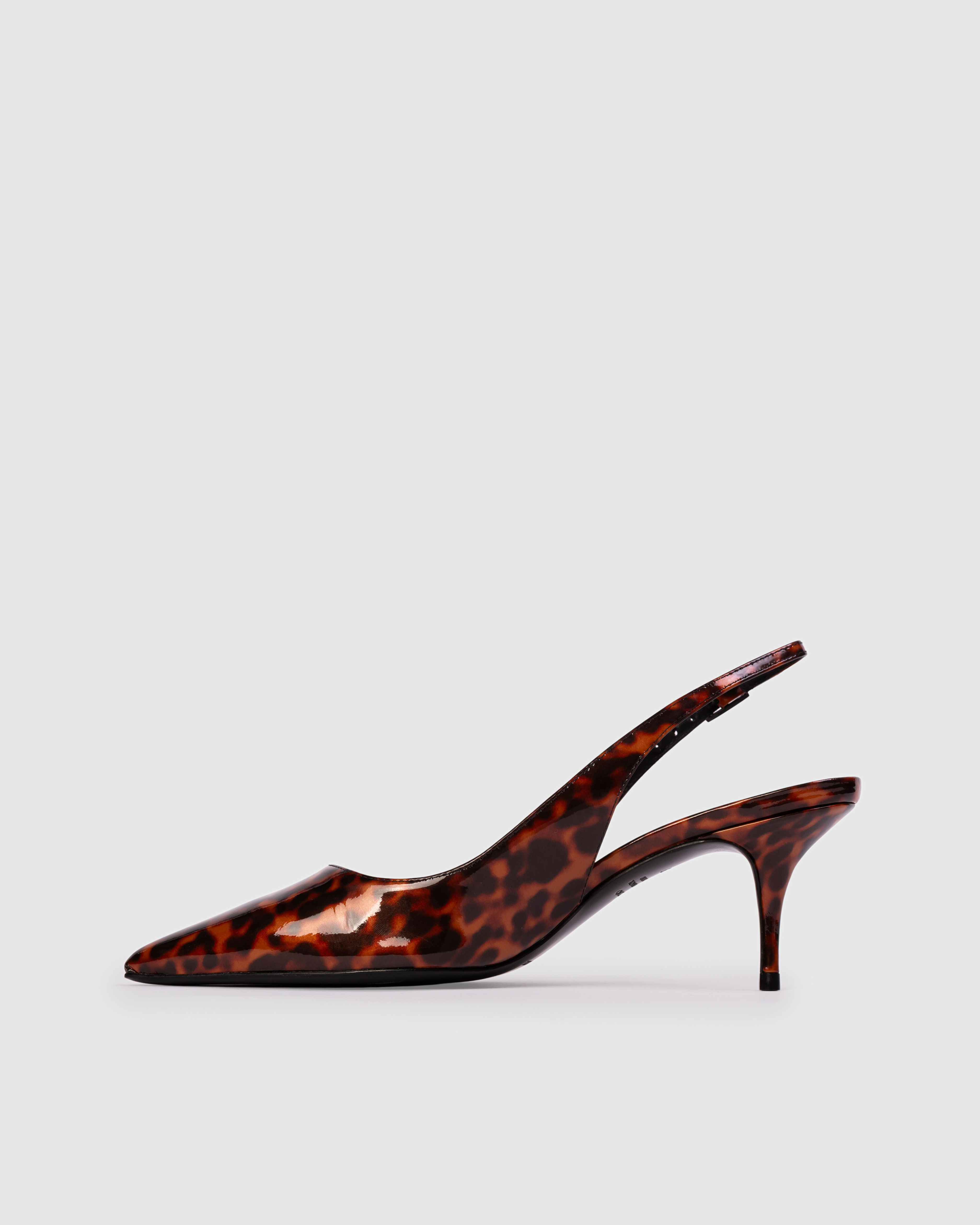 Pointy toe sling back pump, set on a curved mid heel. Made with patent finished leather.