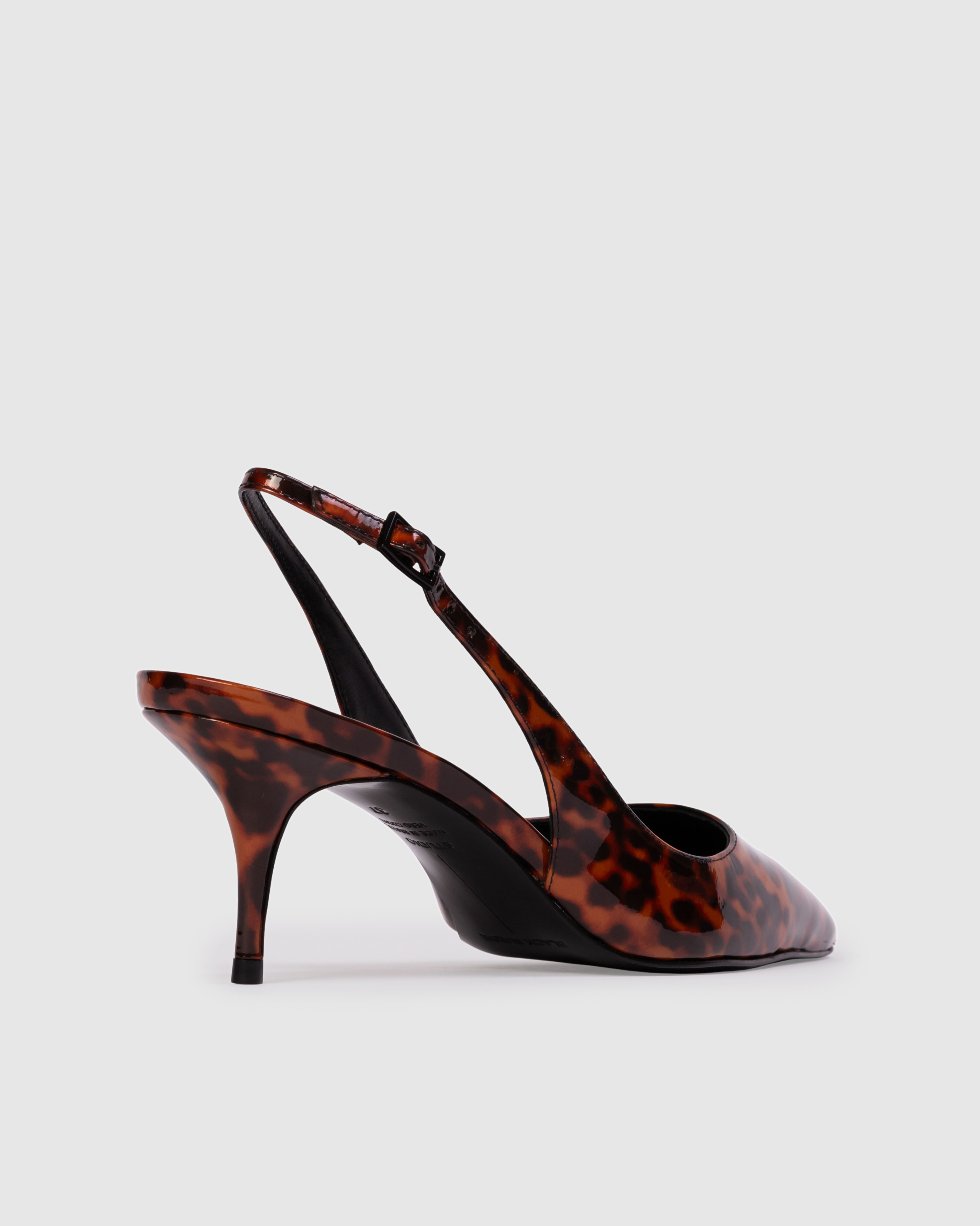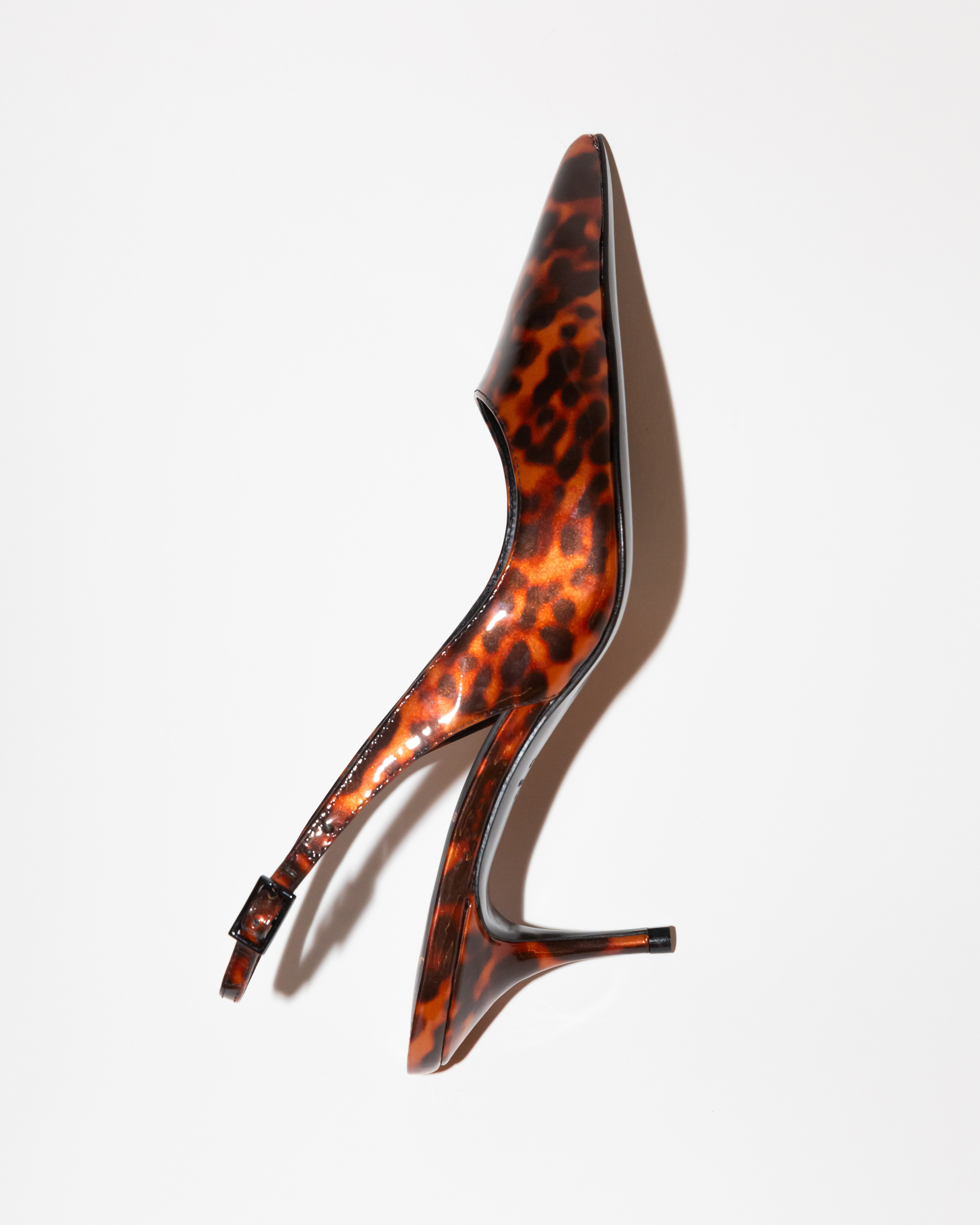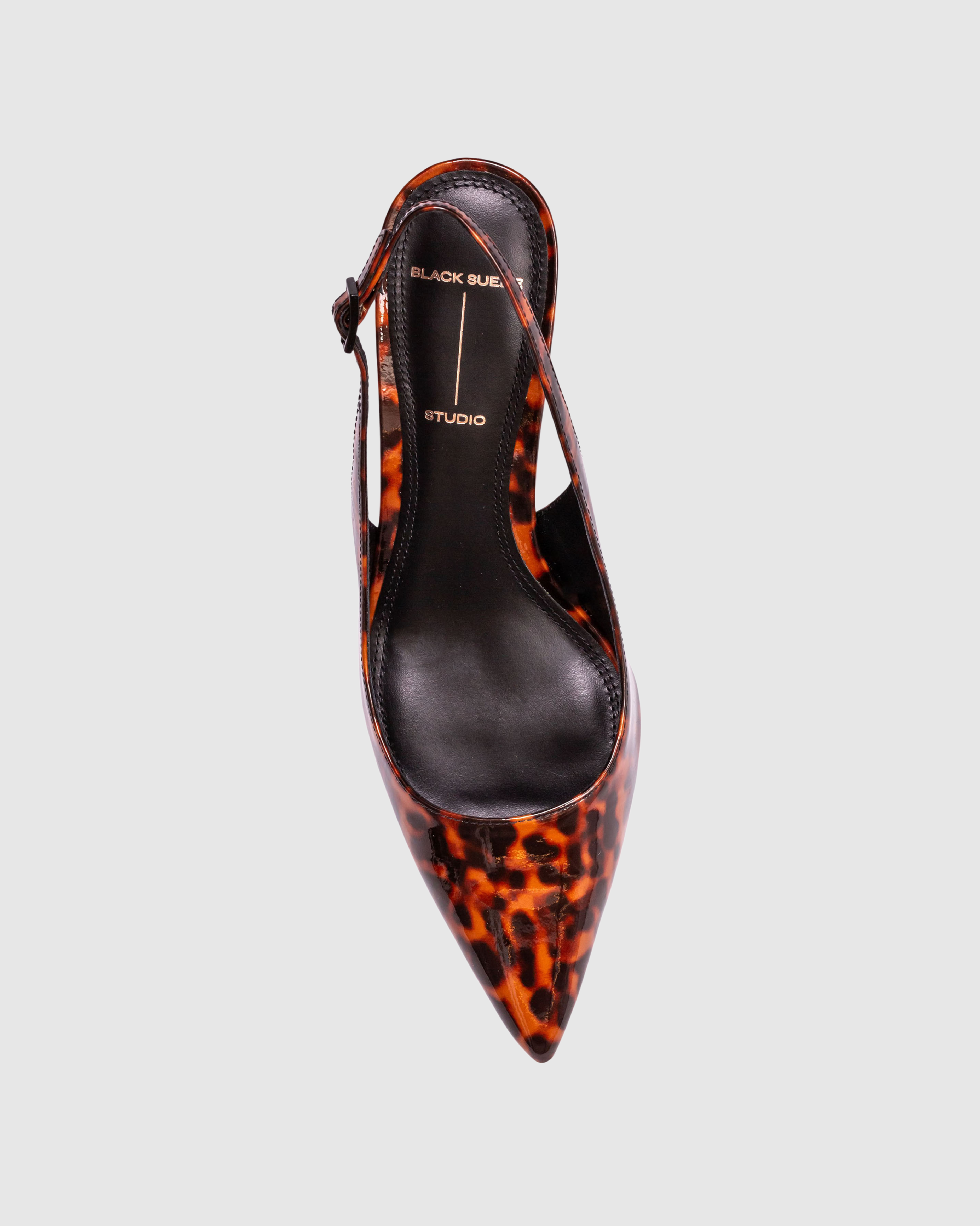 Pointy toe sling back pump, set on a curved mid heel. Made with patent finished leather.