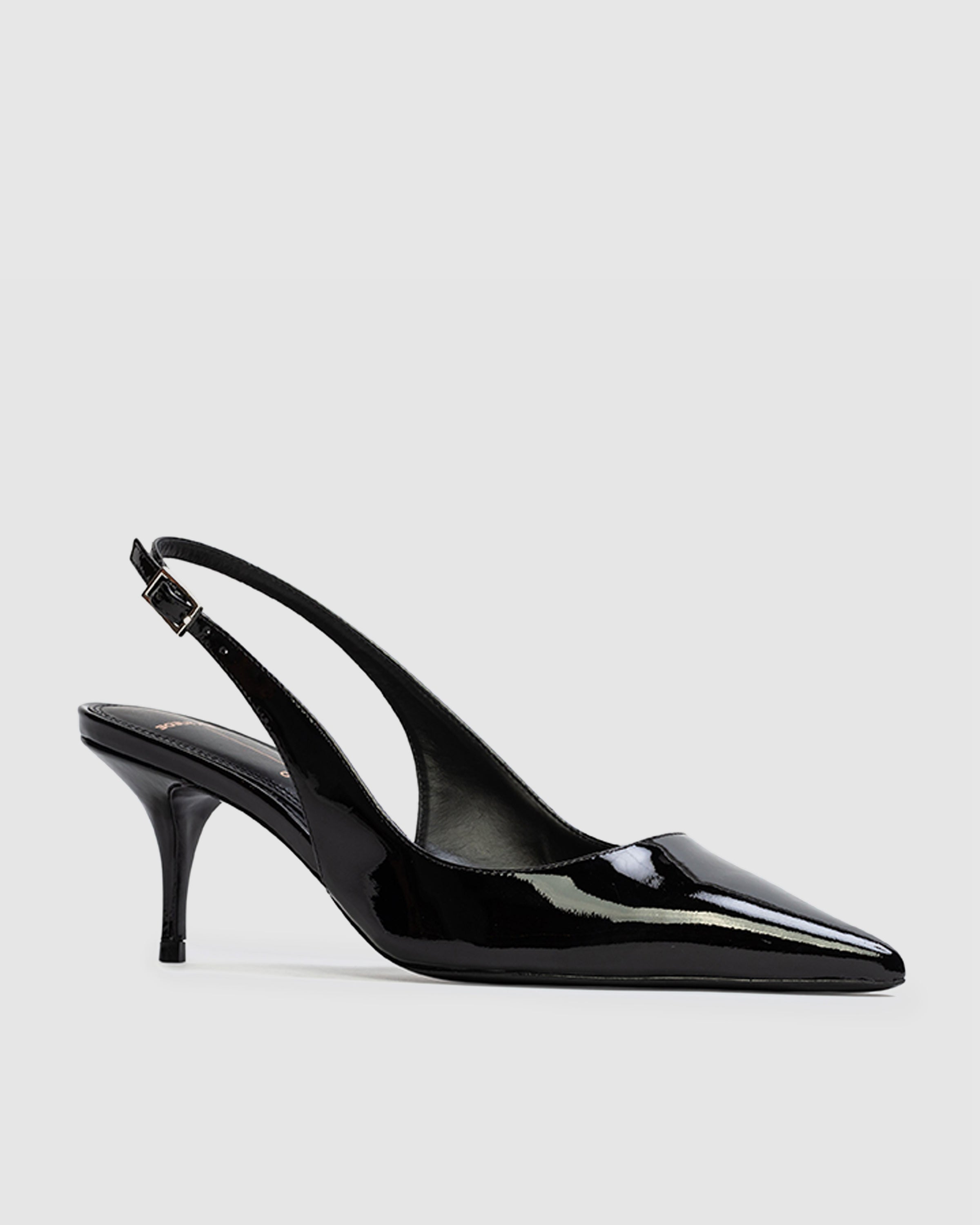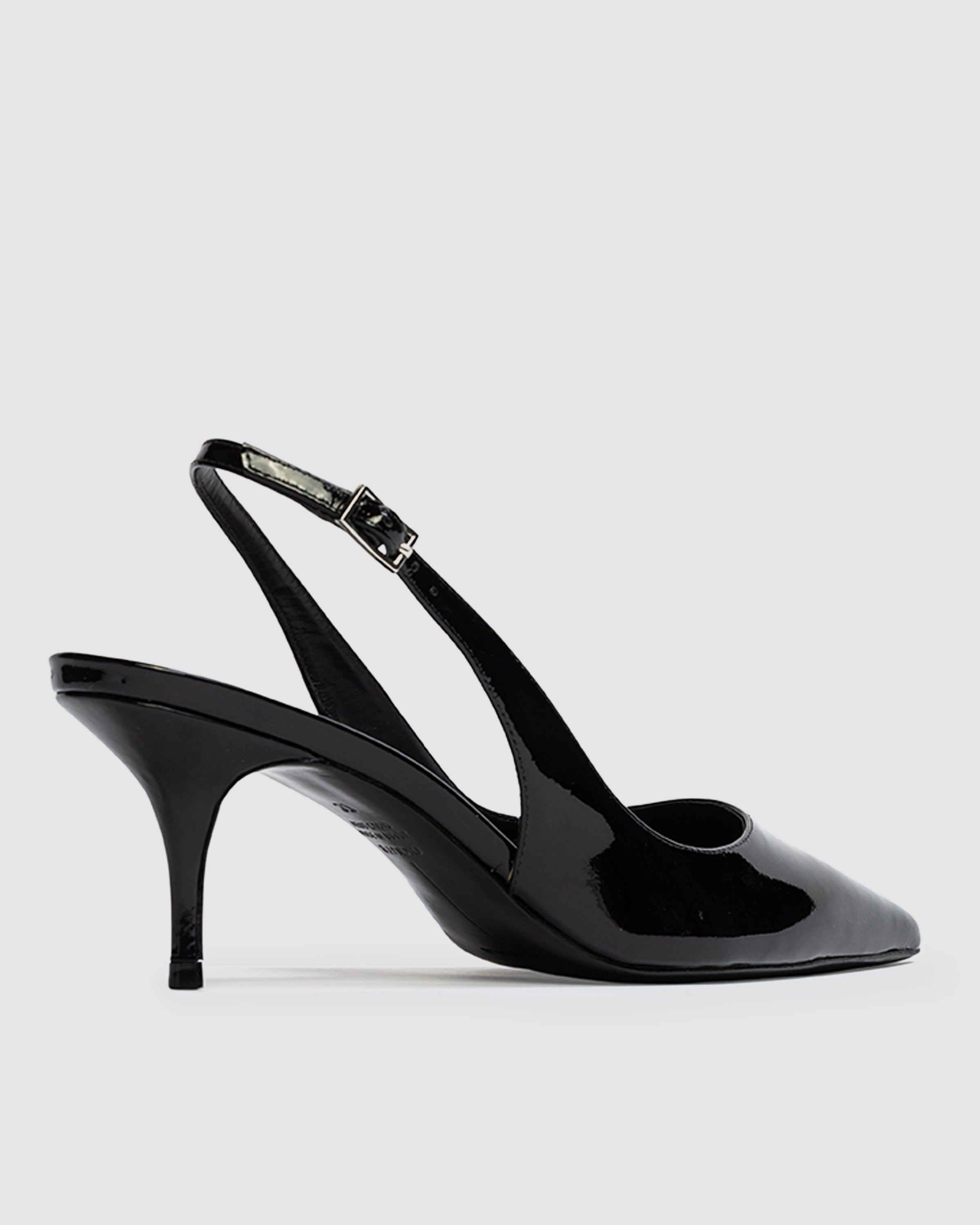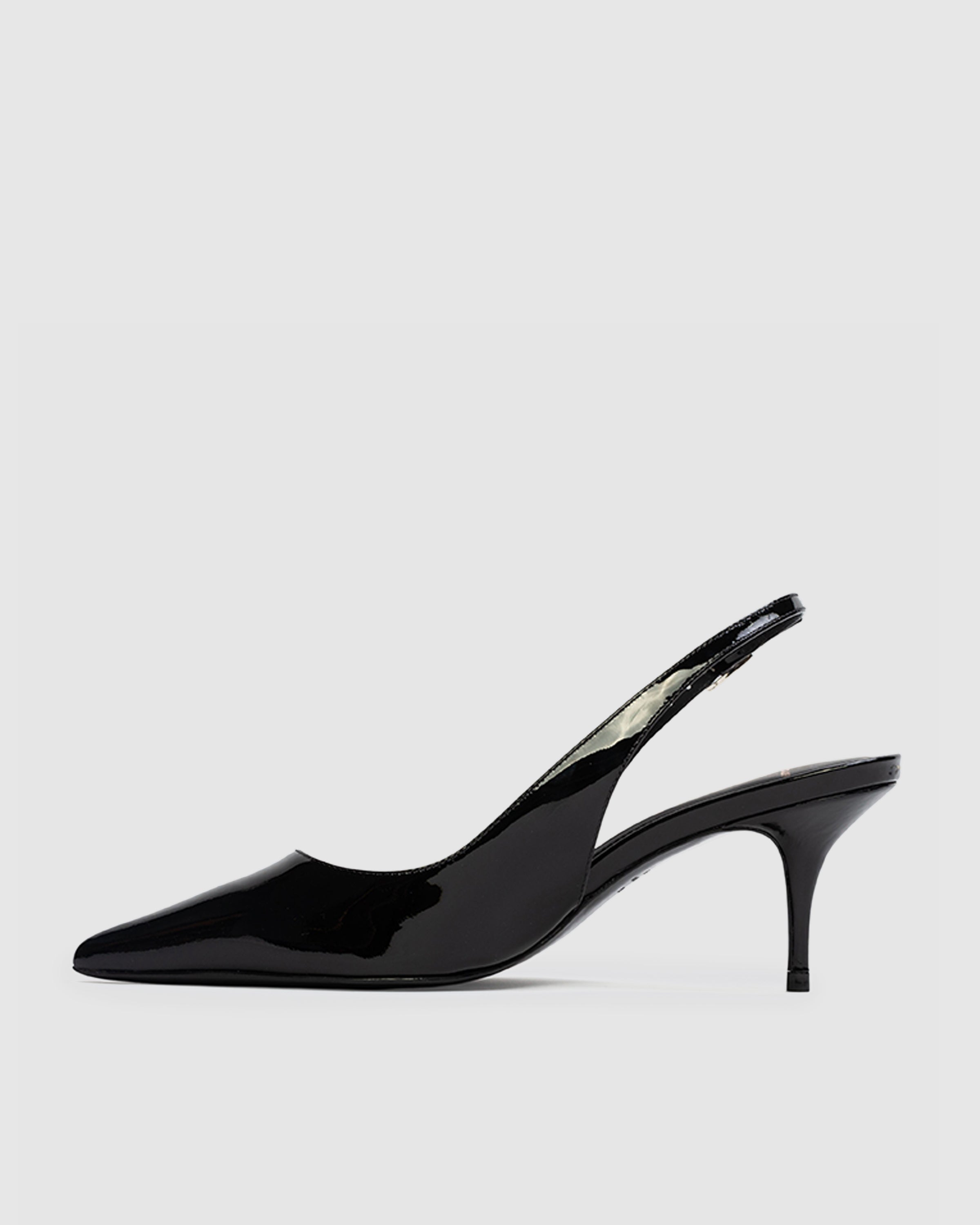 Pointy toe sling back pump, set on a curved mid heel. Made with patent finished leather.