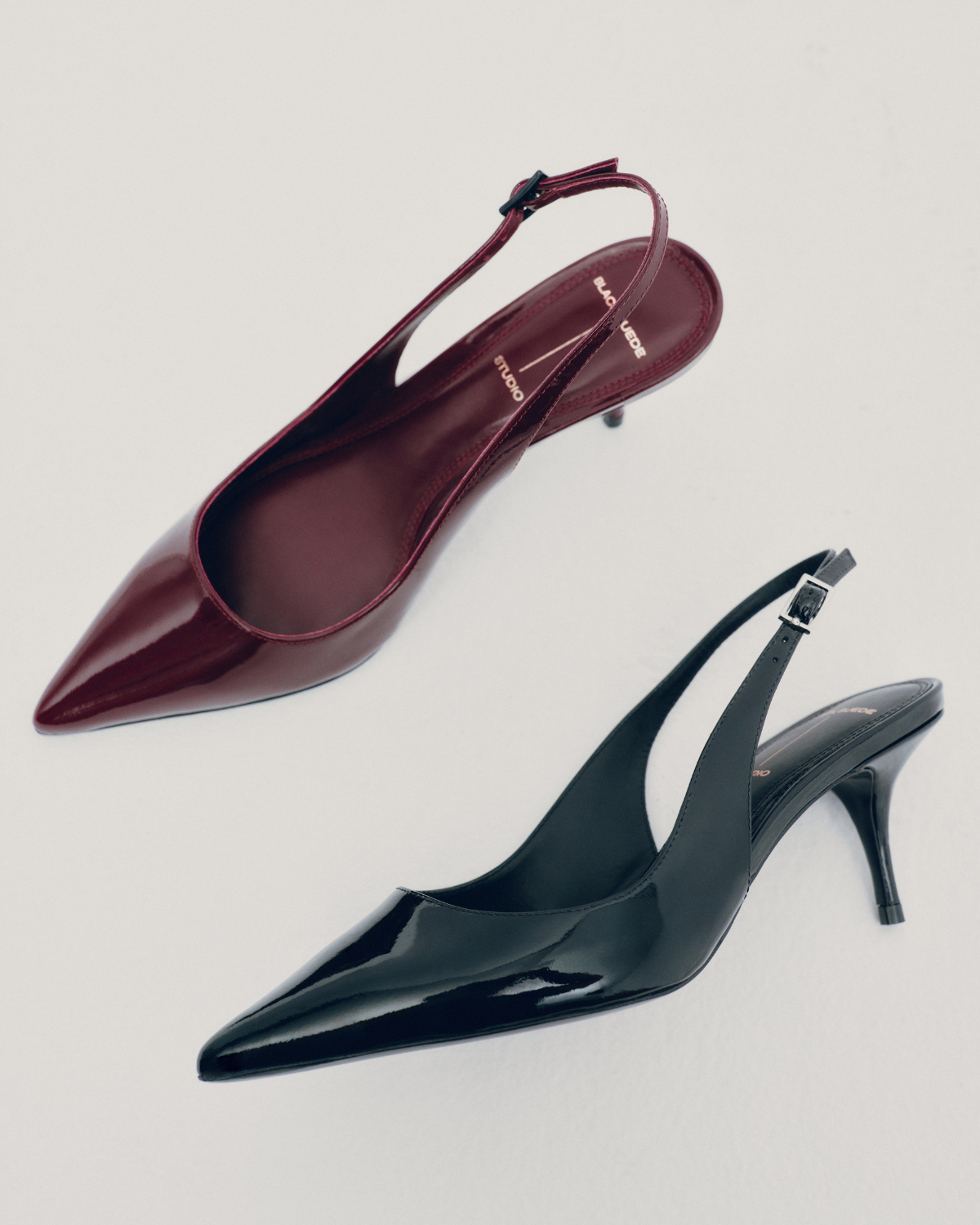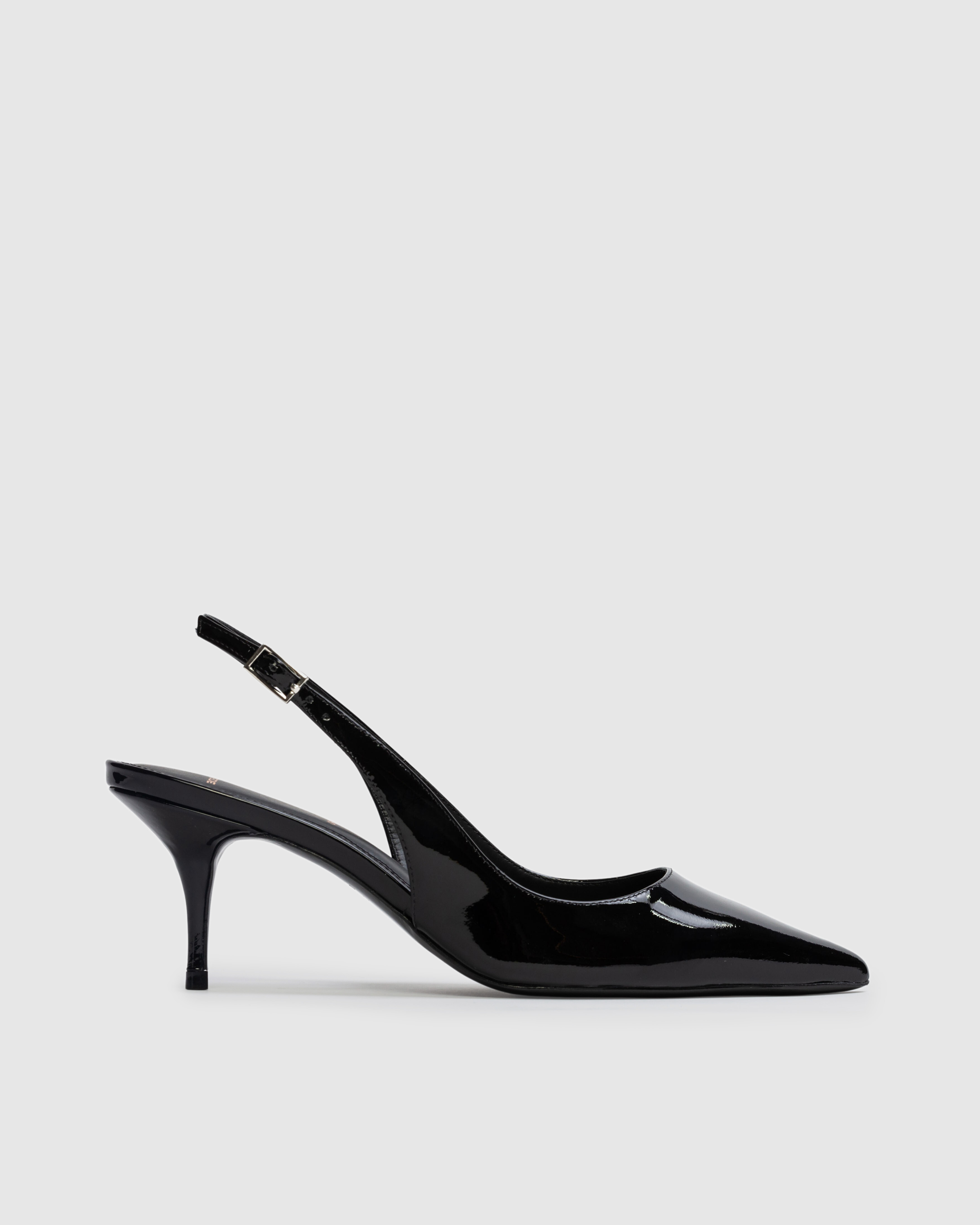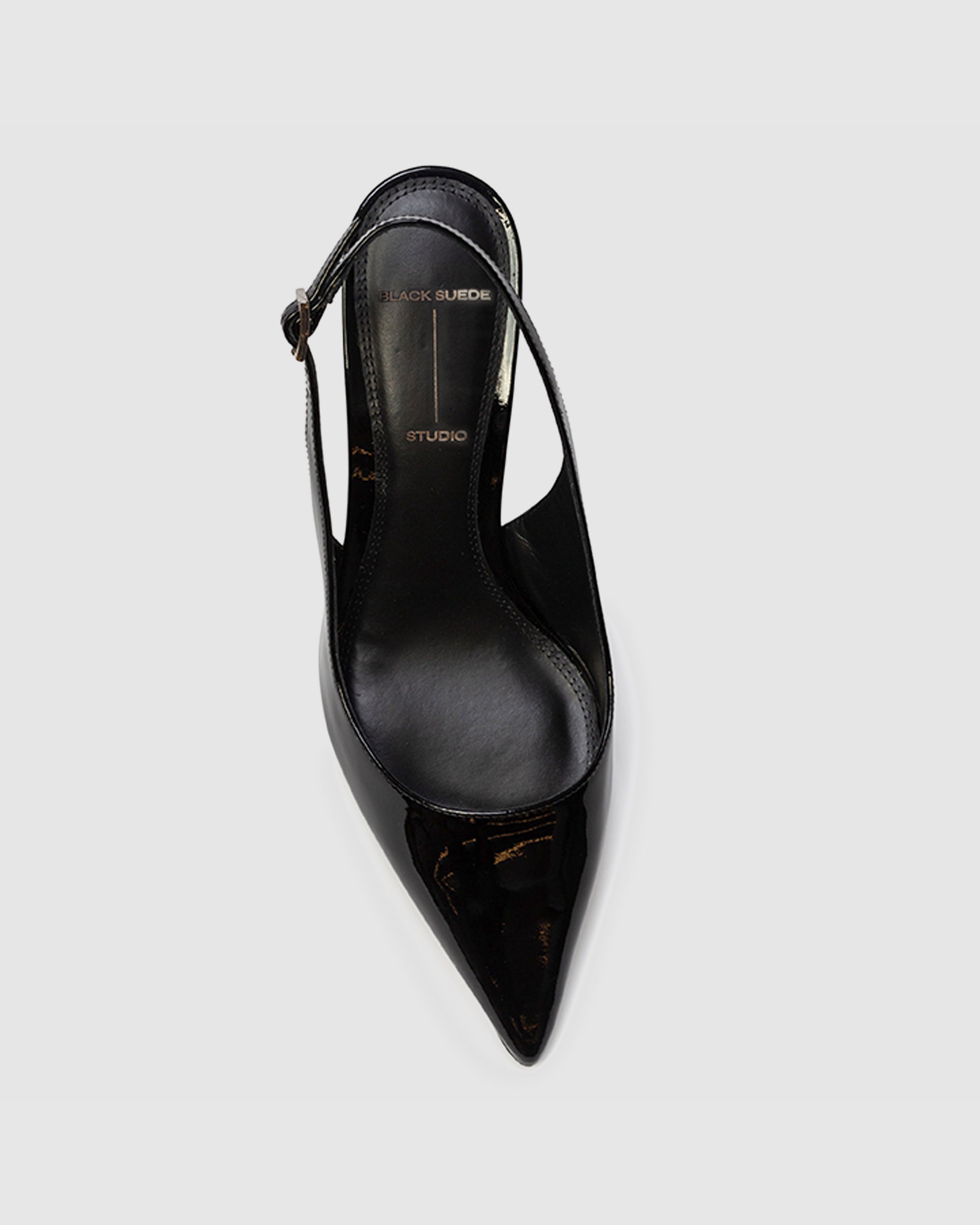 Pointy toe sling back pump, set on a curved mid heel. Made with patent finished leather.