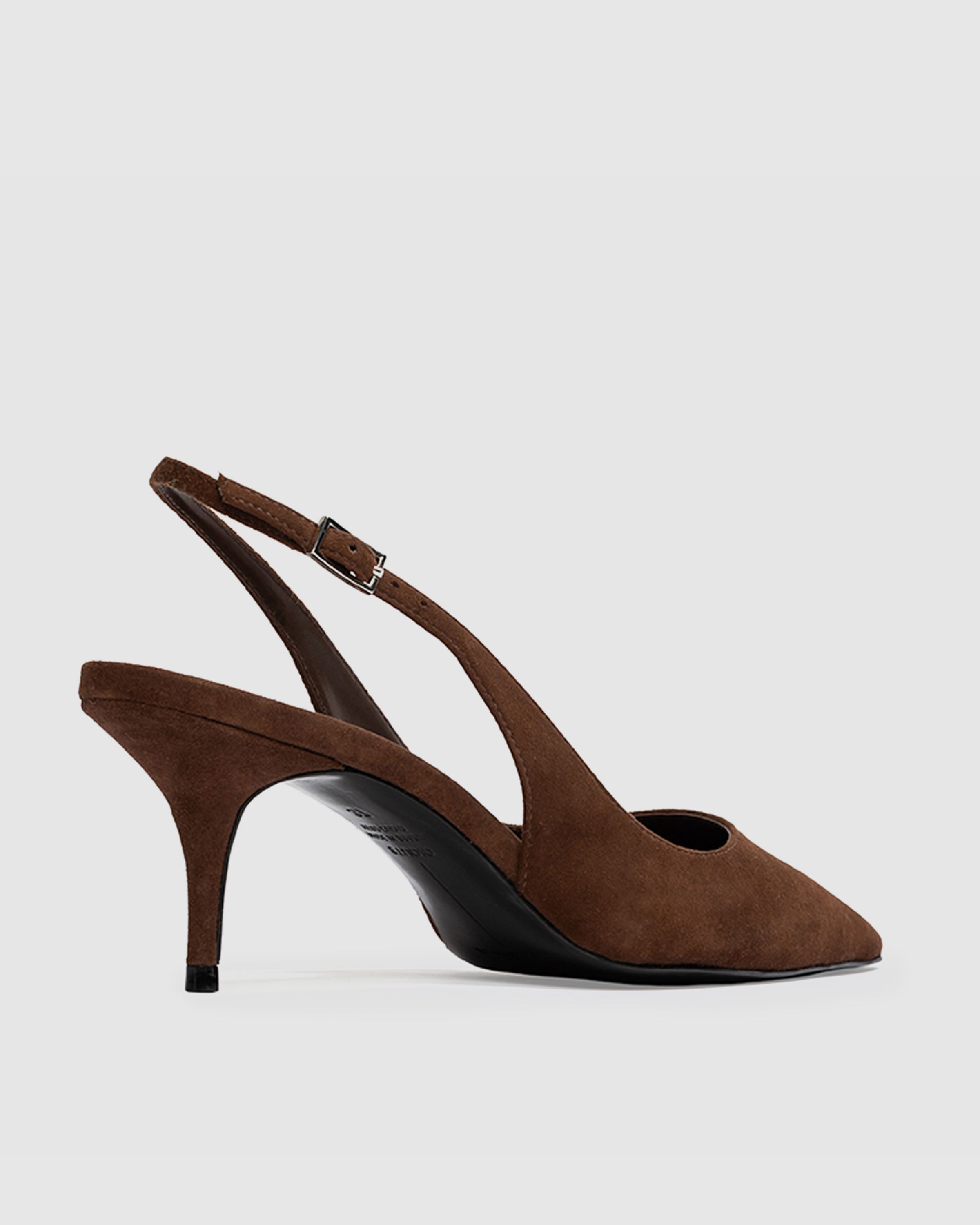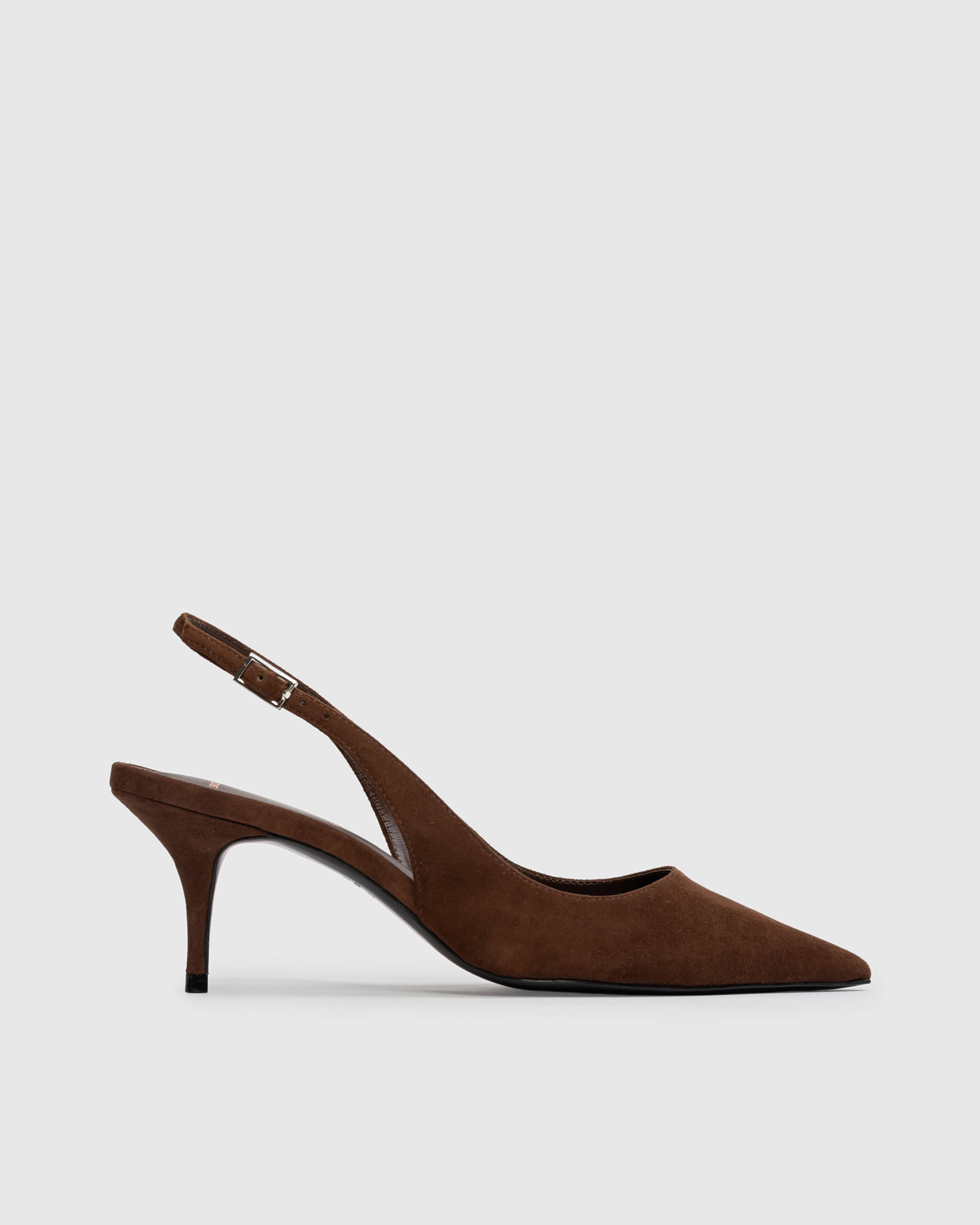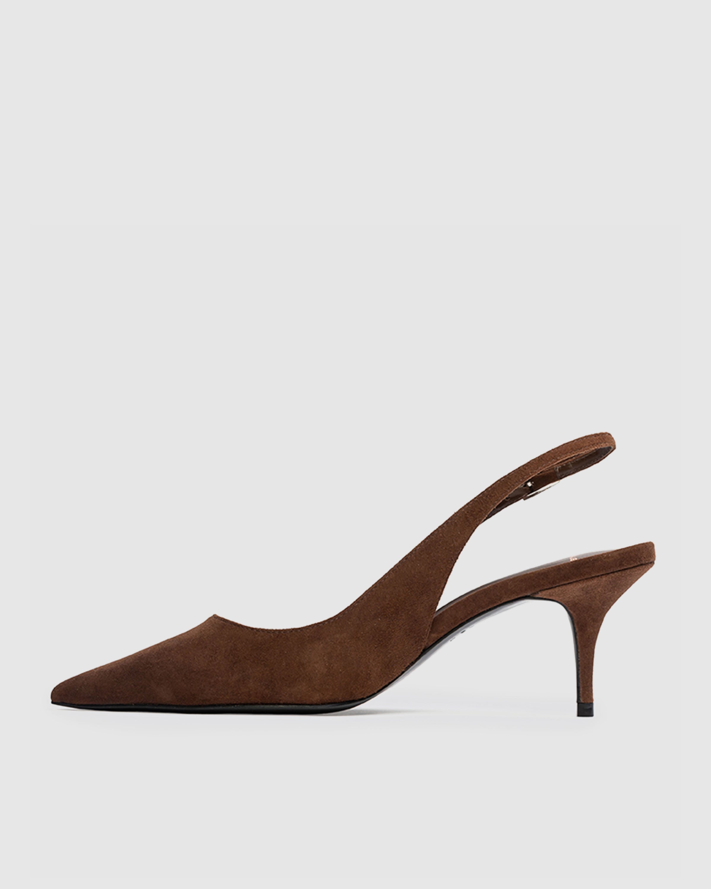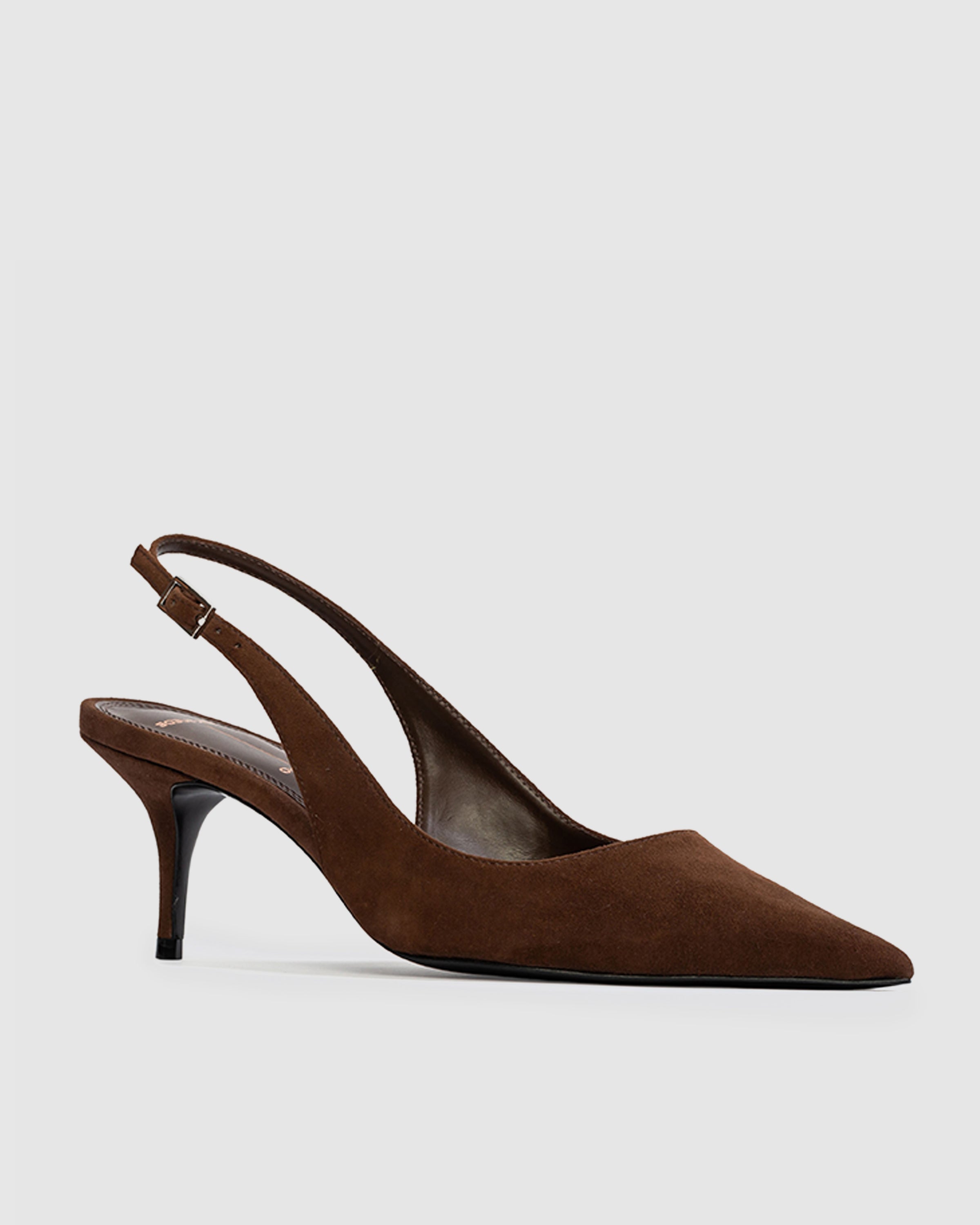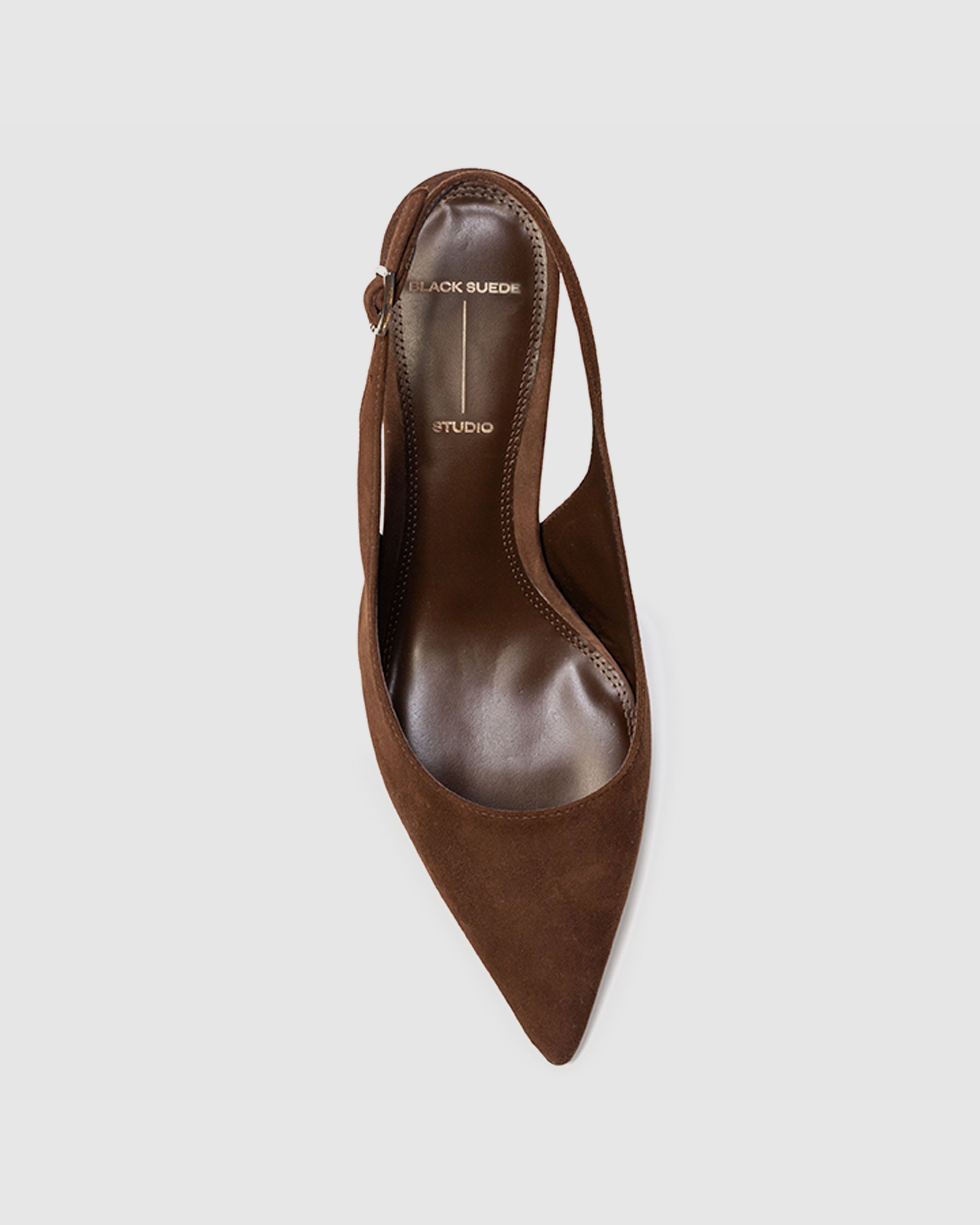Pointy toe sling back pump, set on a curved mid heel. Made with brushed kid suede.