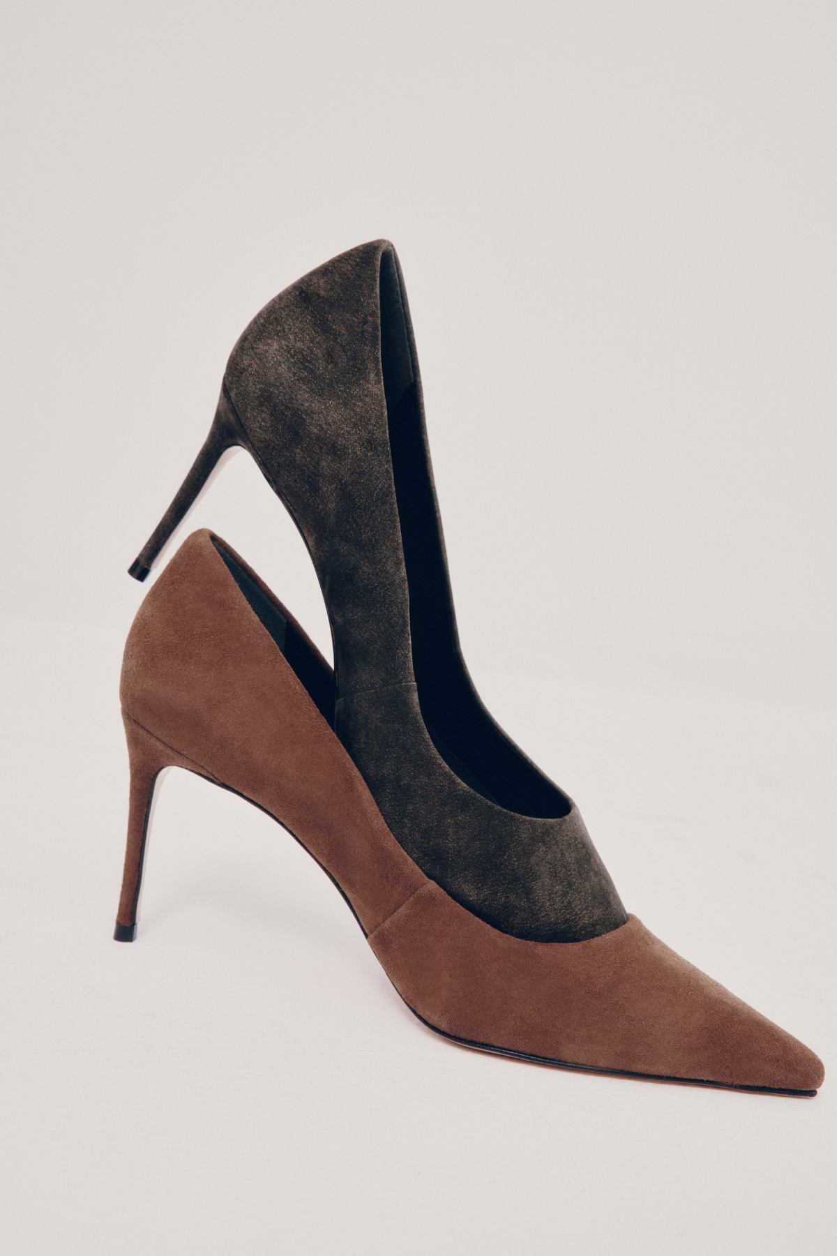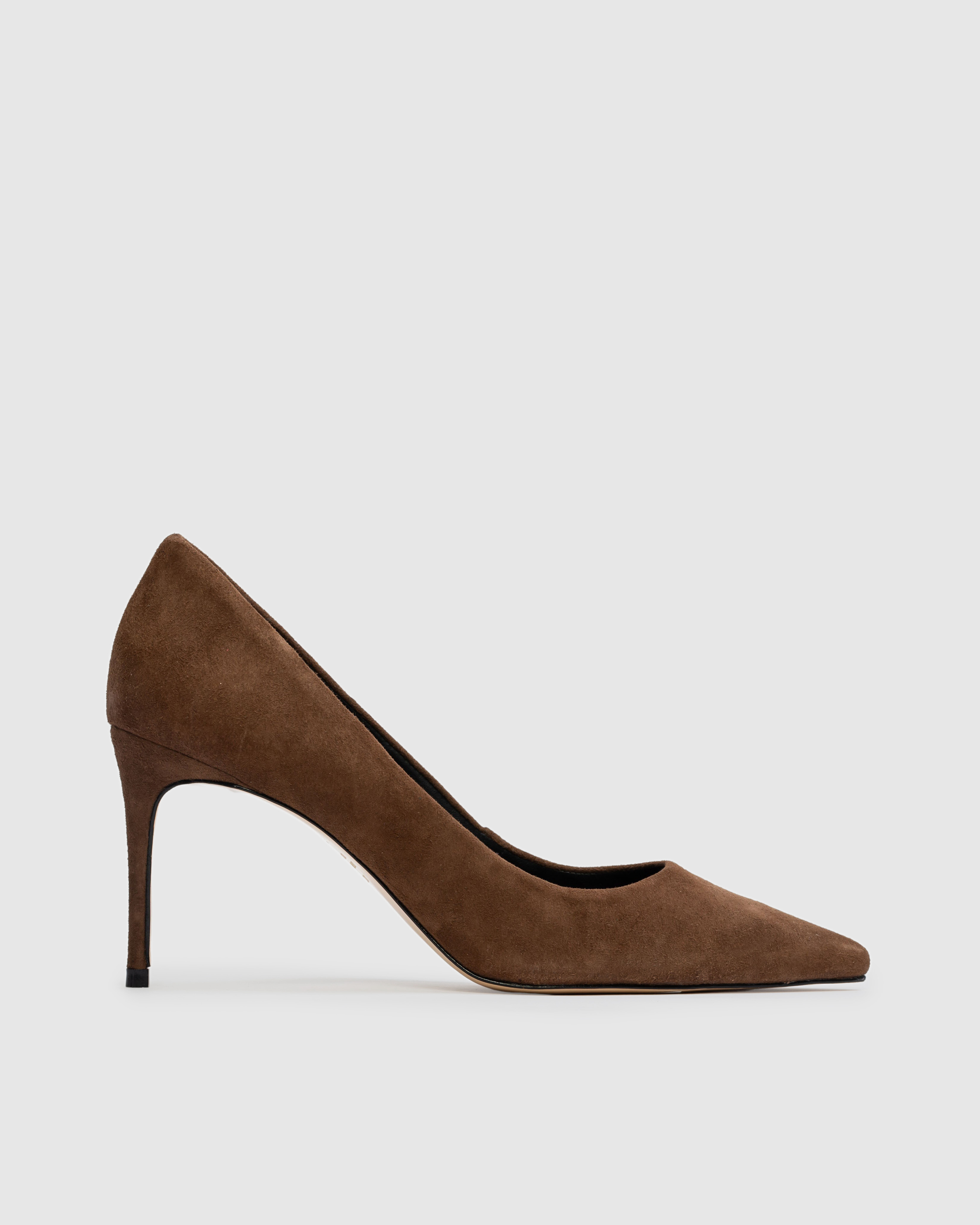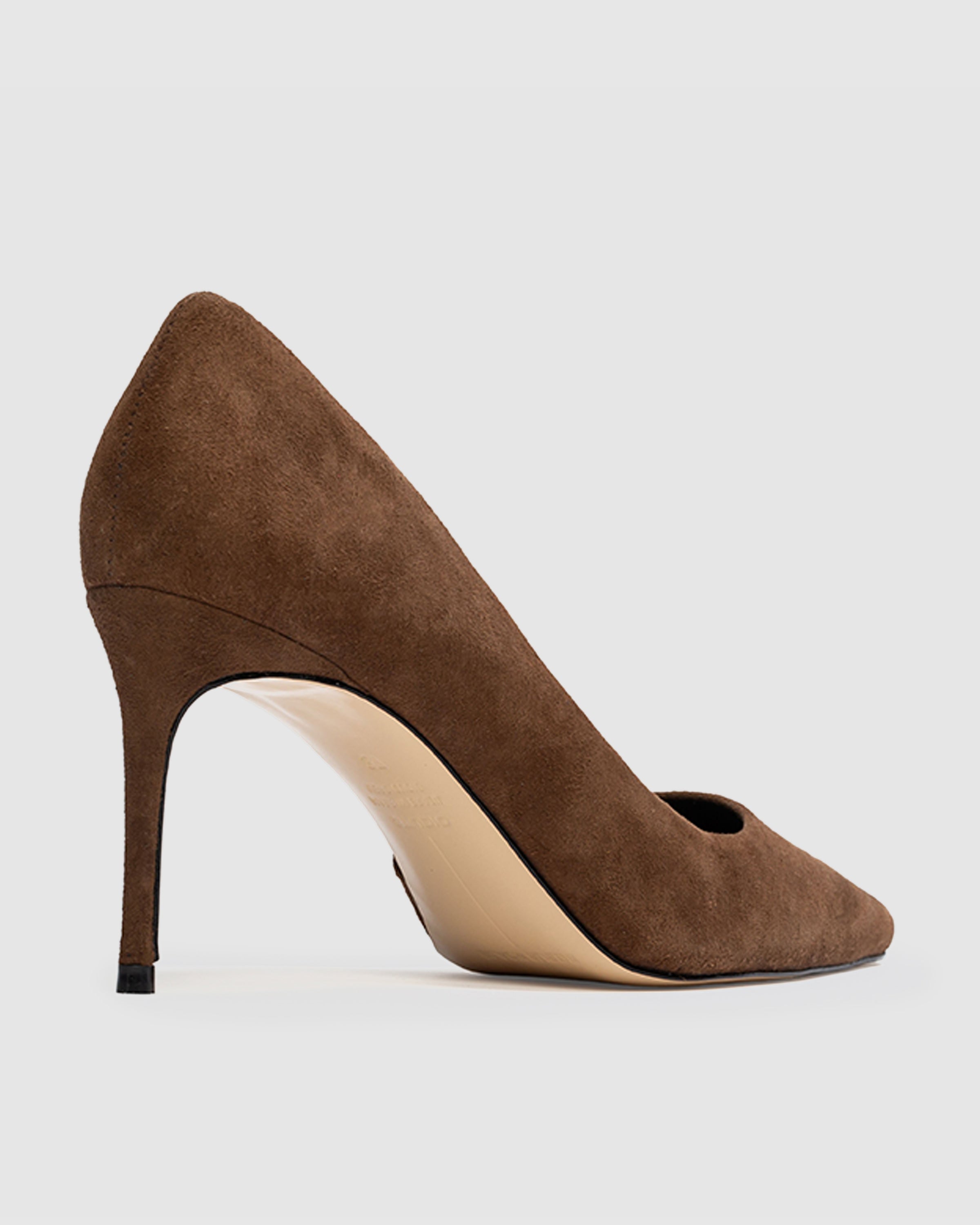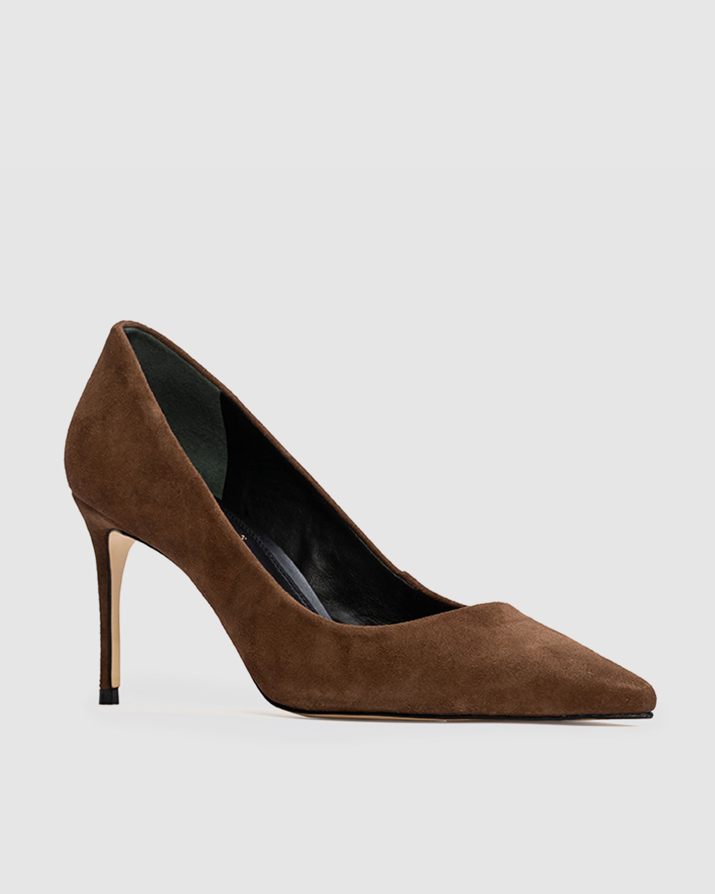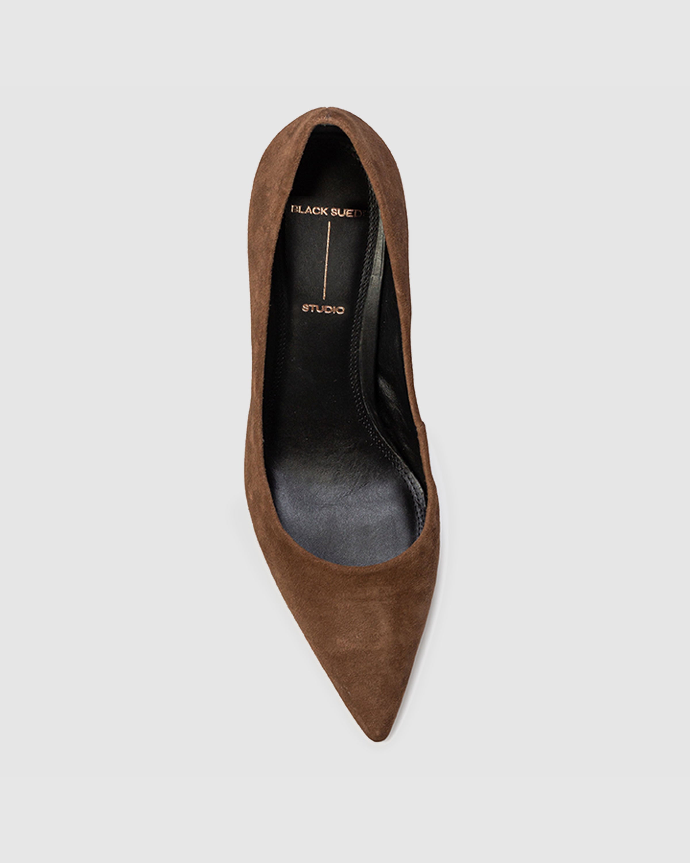 Pointy toe classic pump, set on a high pin heel. Made with brushed kid suede.
