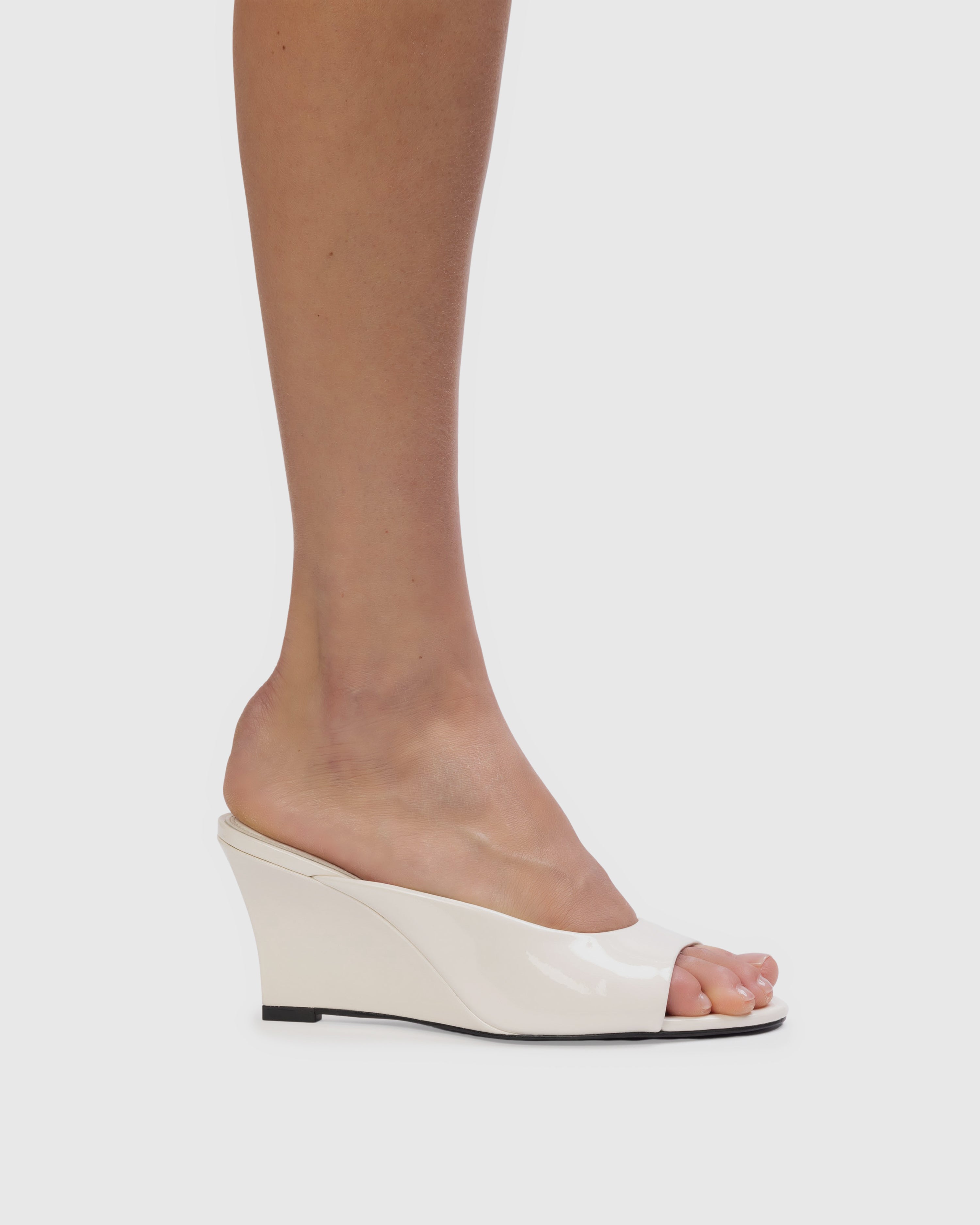 Round toe slip on mule with a asymmetrical upper design, set on a mid-height sleek wedge. Made with smooth patent leather.