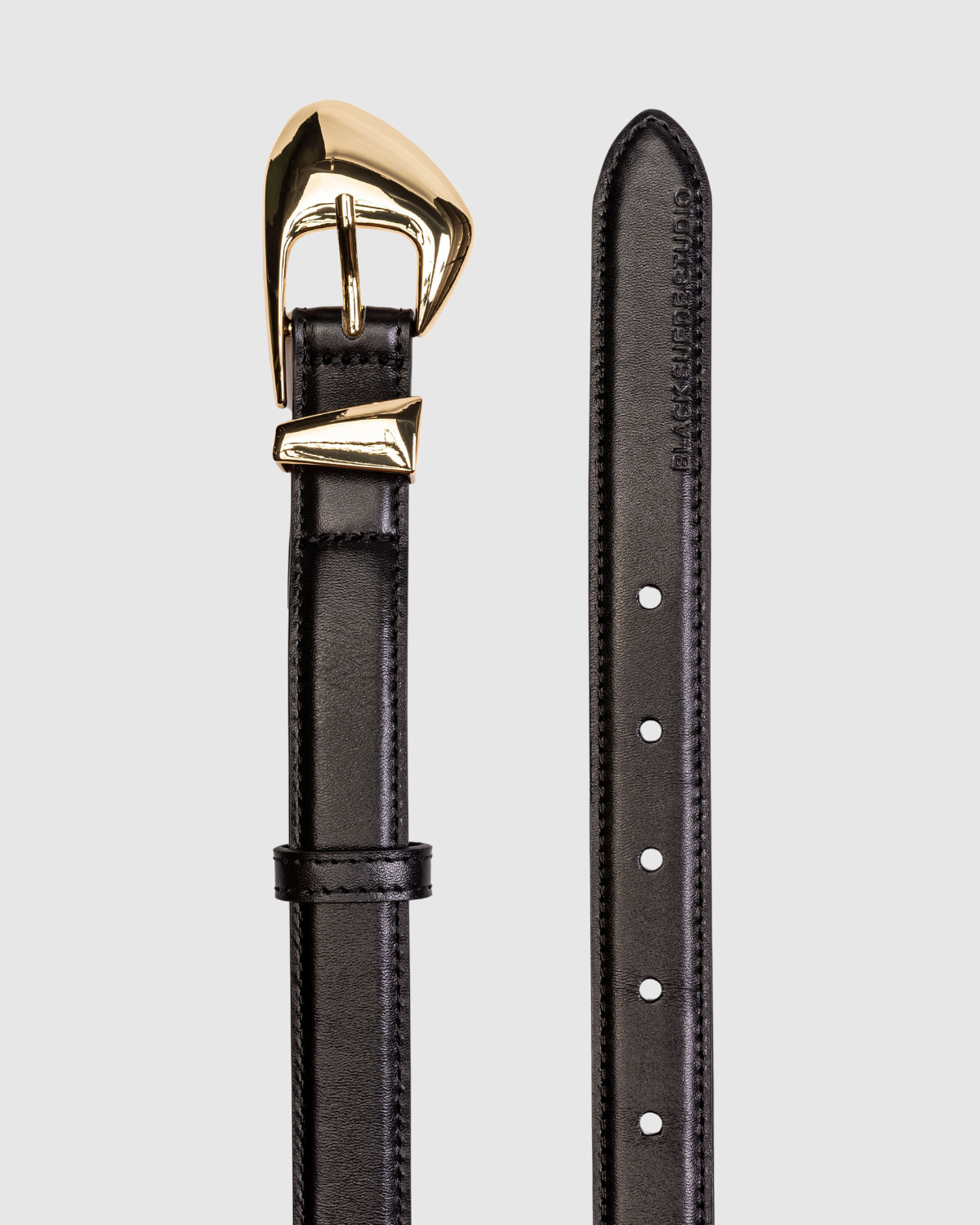 gold plated brass arrow shaped buckle with irregularly shaped belt loop. Secured on a smooth buffed leather strap.