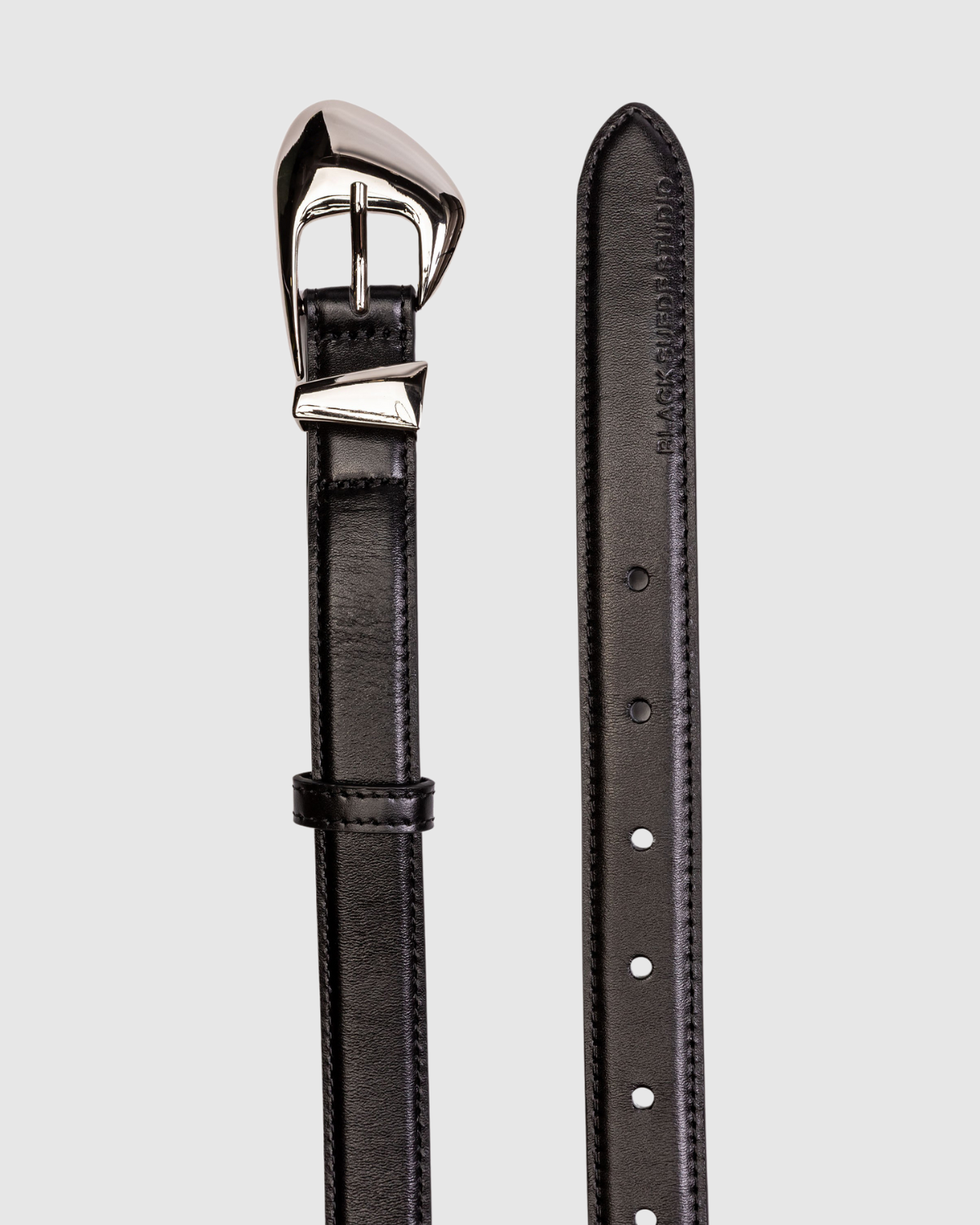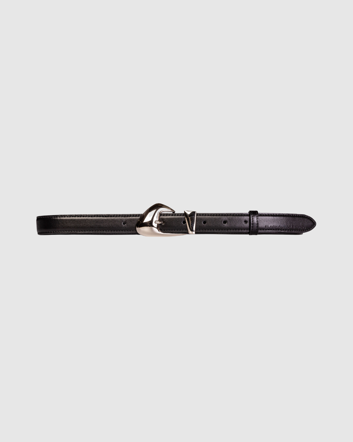 Silver plated brass arrow shaped buckle with irregularly shaped belt loop. Secured on a smooth buffed leather strap.