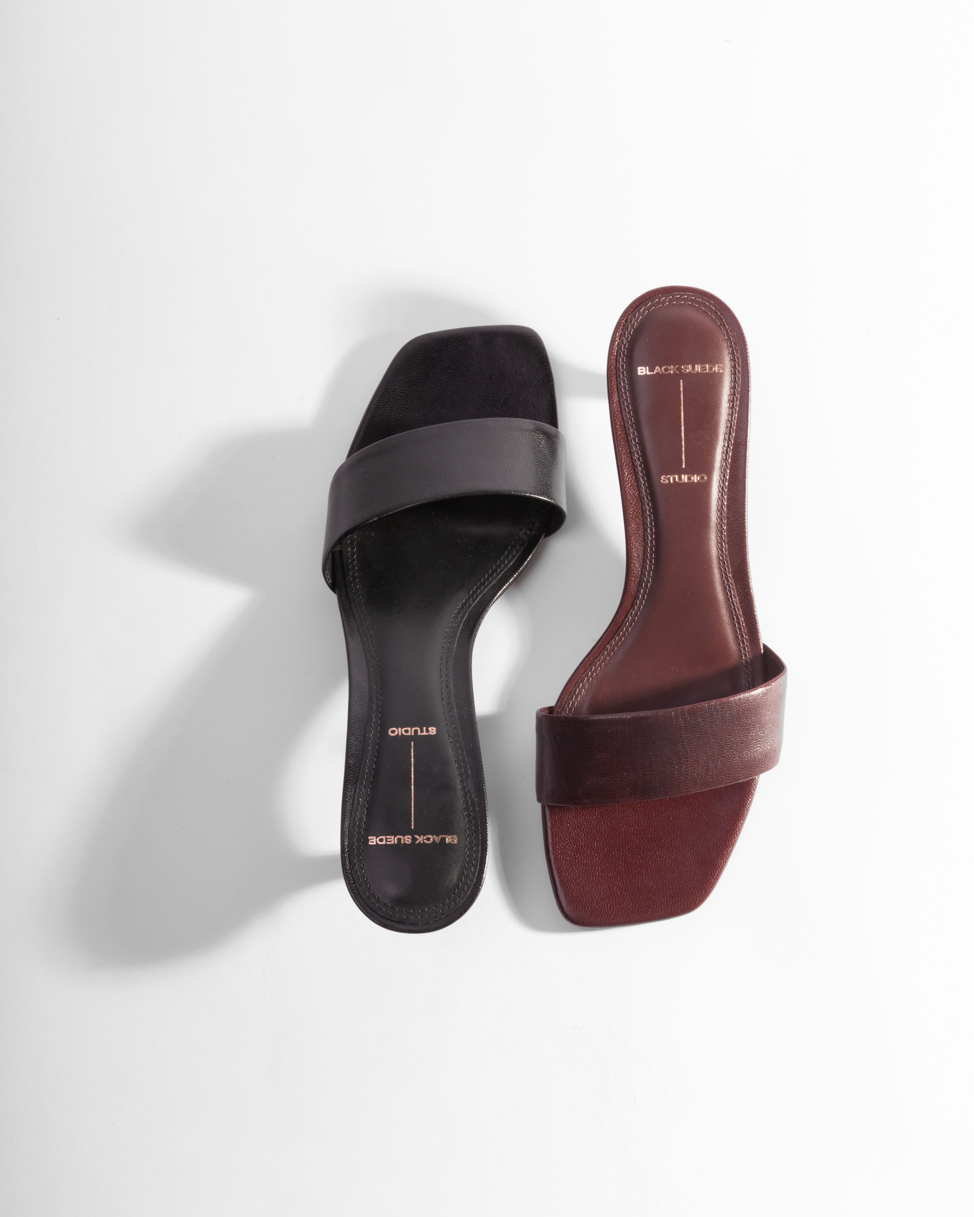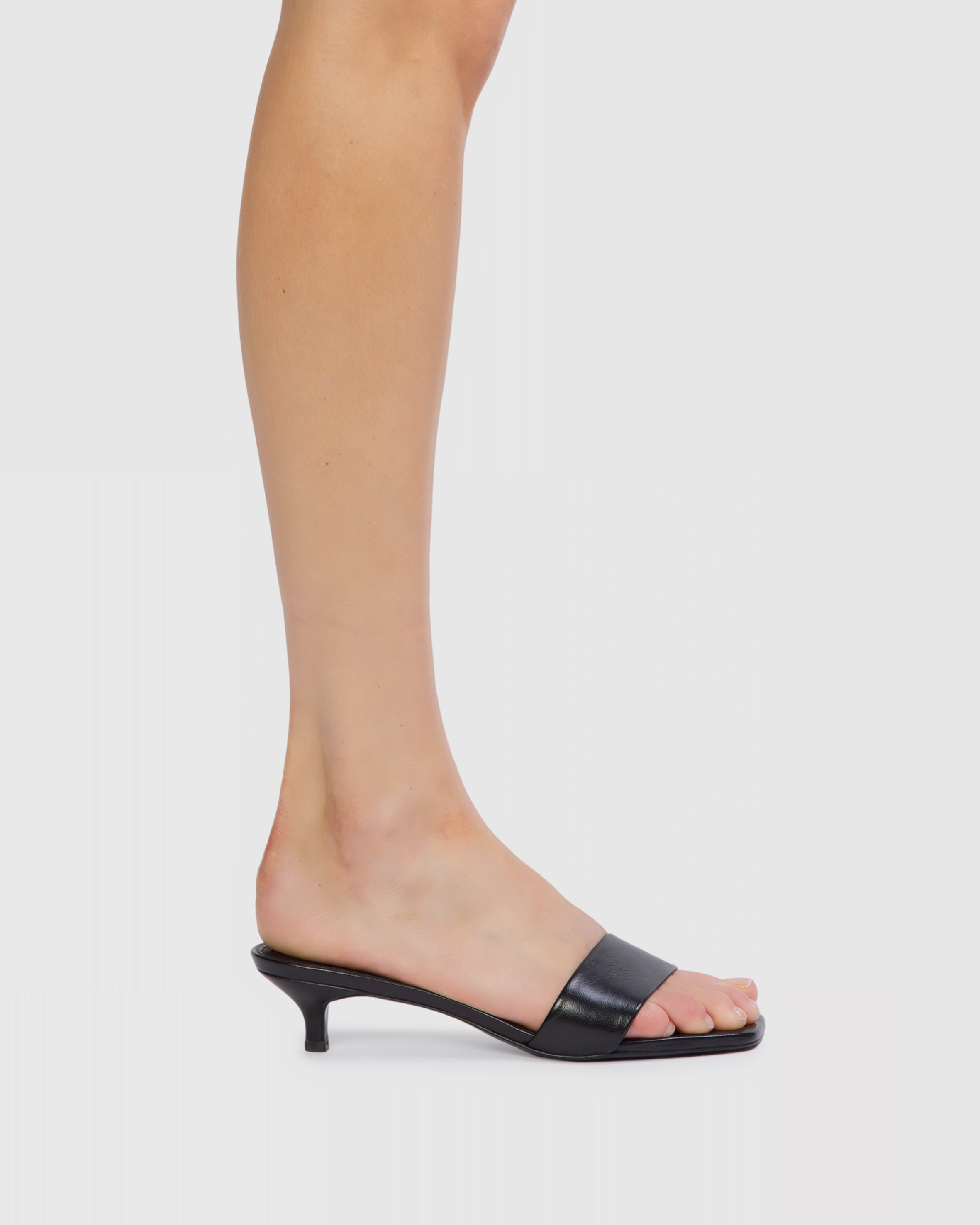 Square toe slipper mule, set on a cone kitten heel. Made with smooth goat leather.