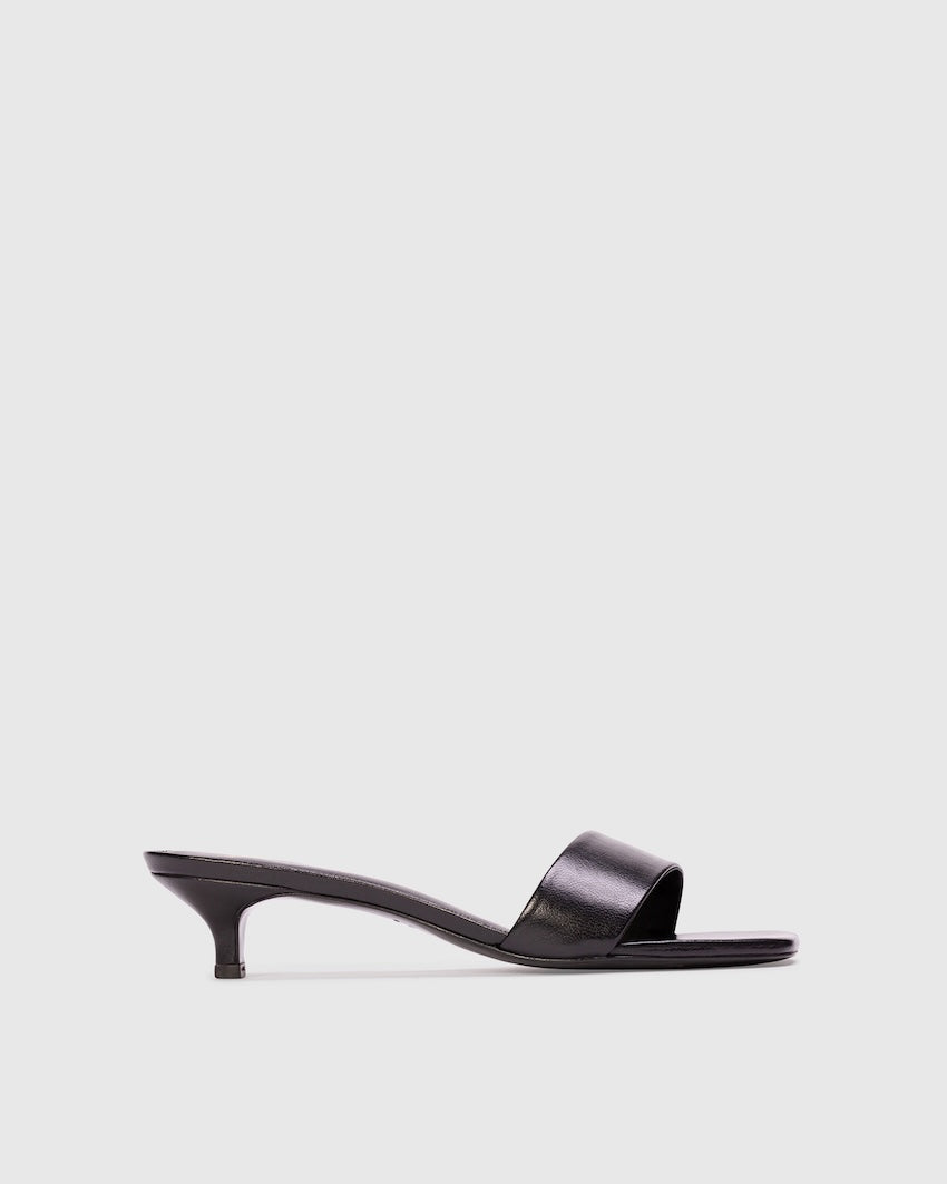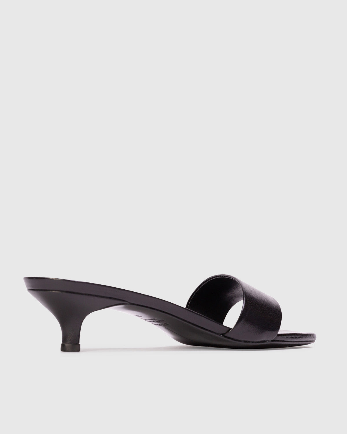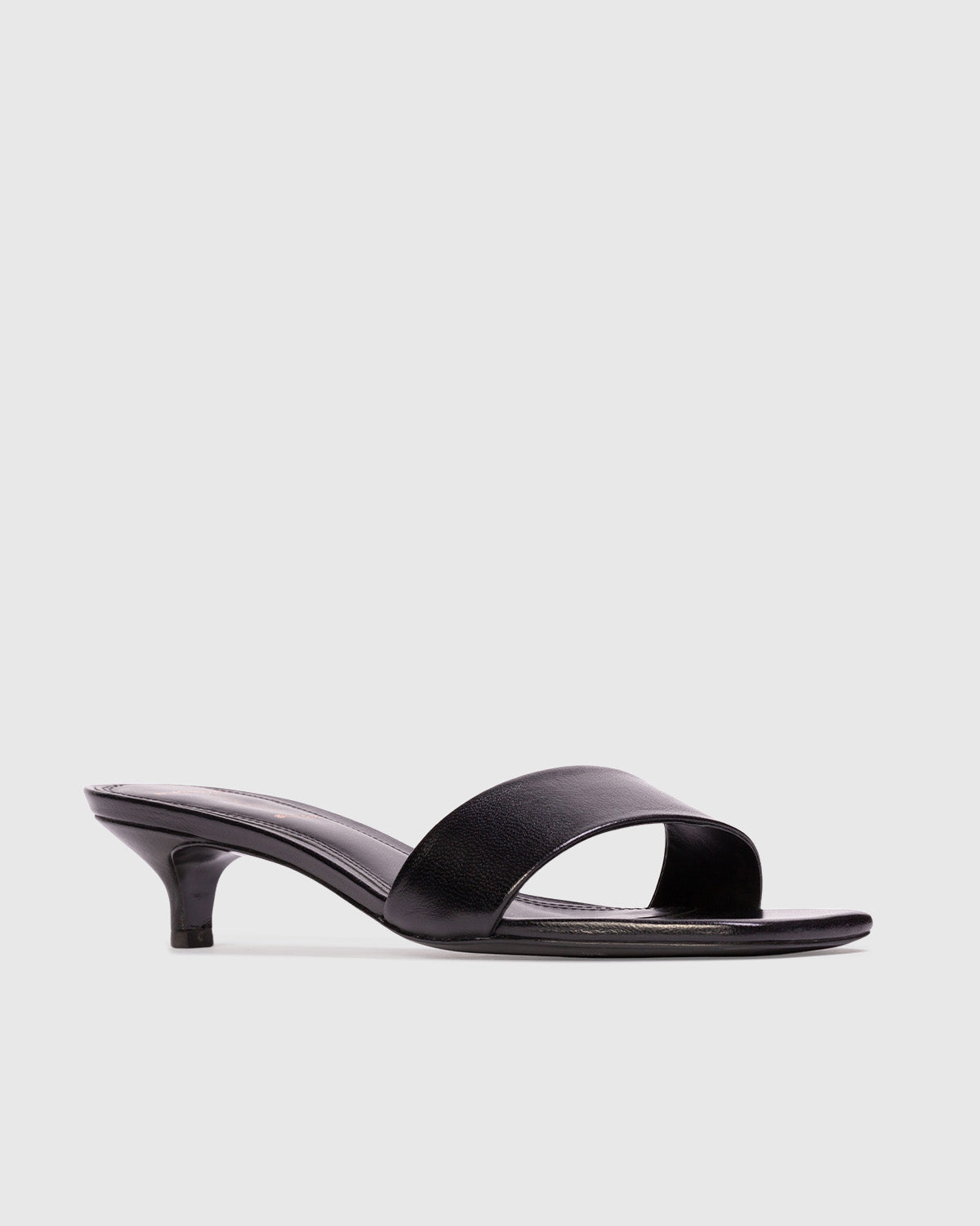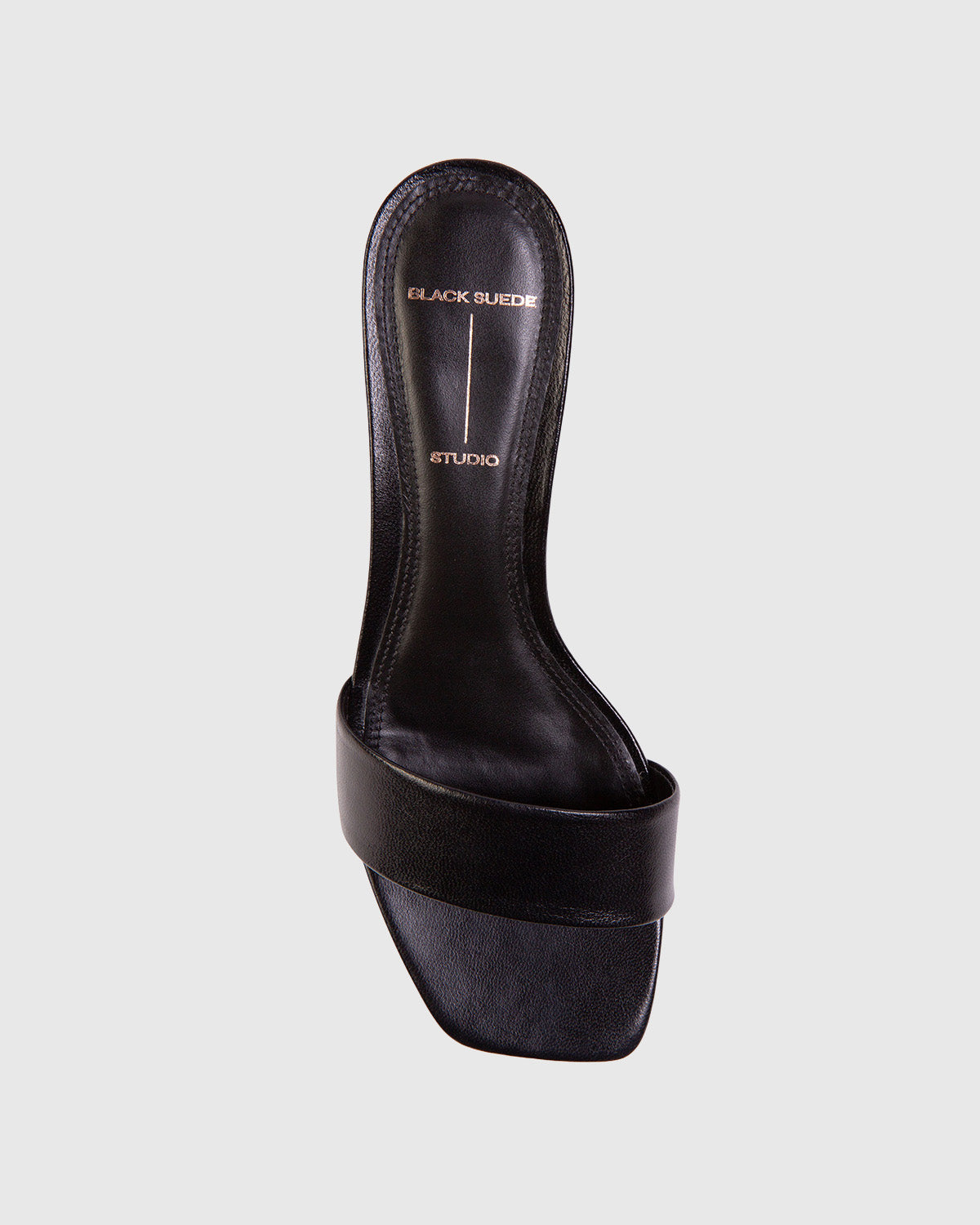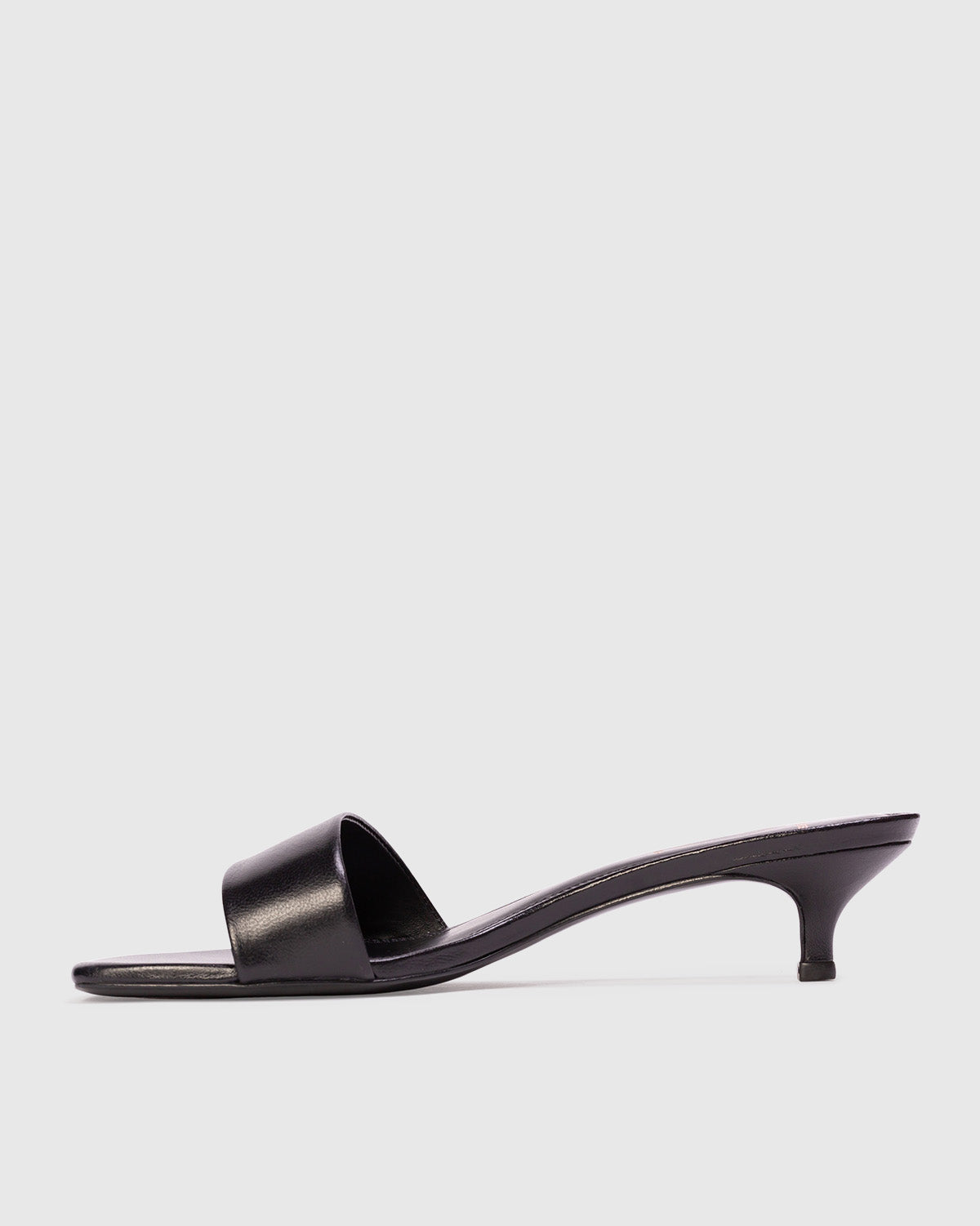 Square to slipper mule, set on a cone kitten heel. Made with smooth goat leather.