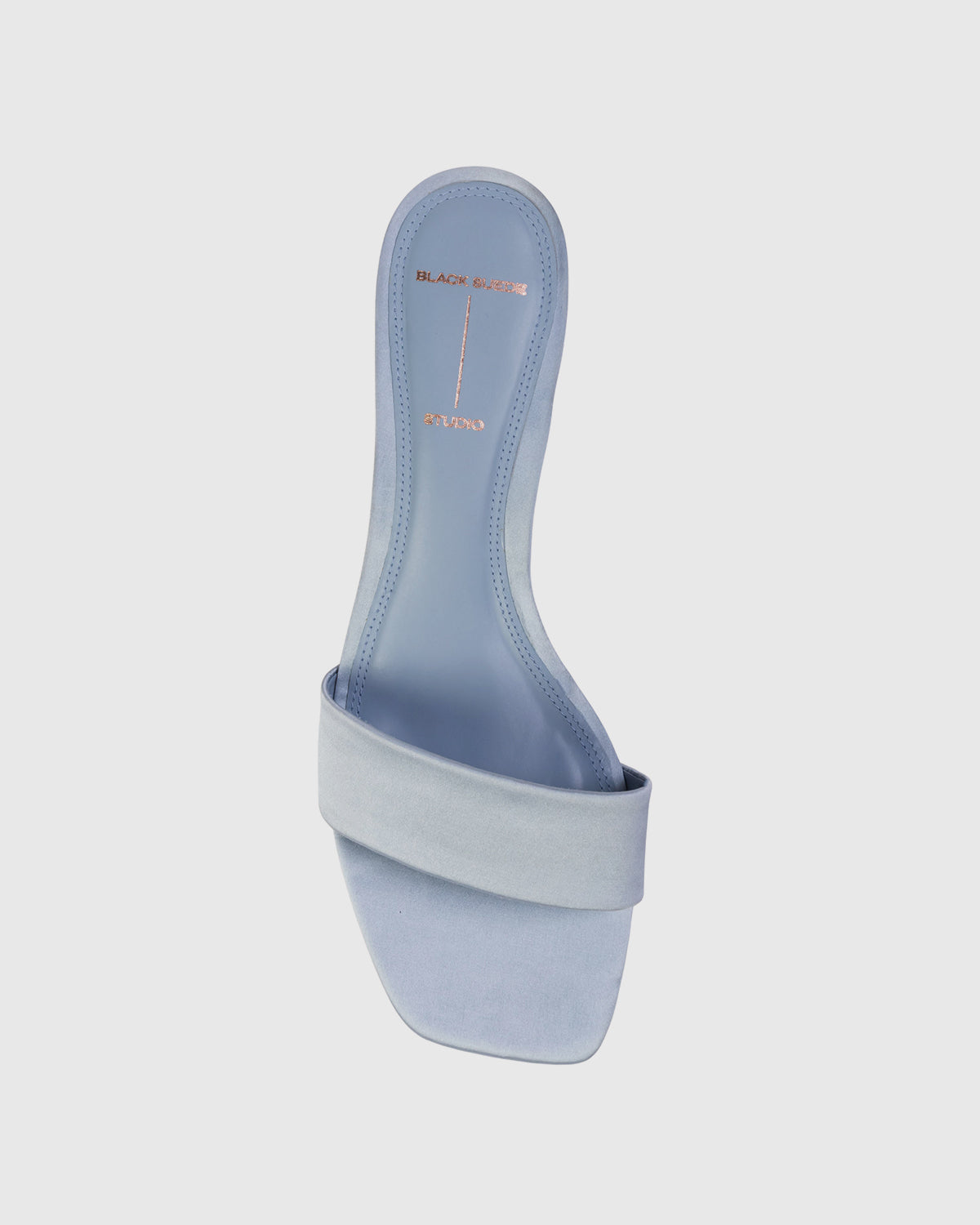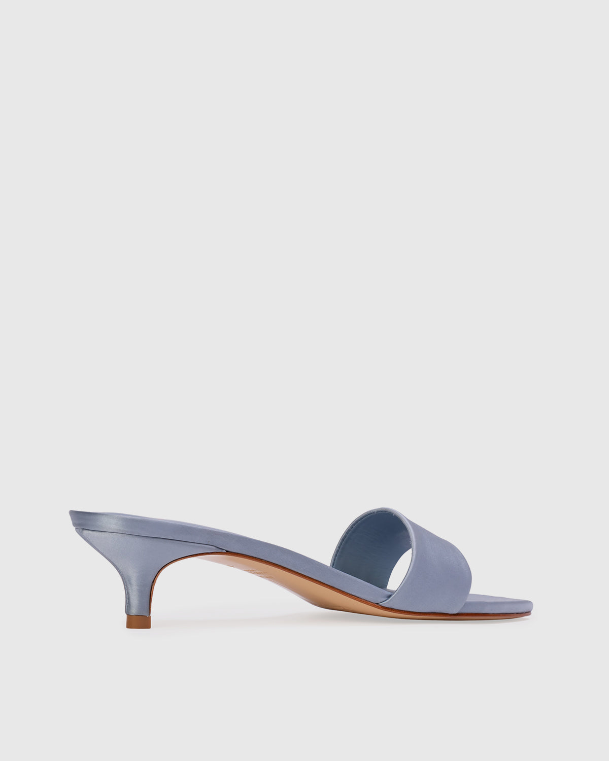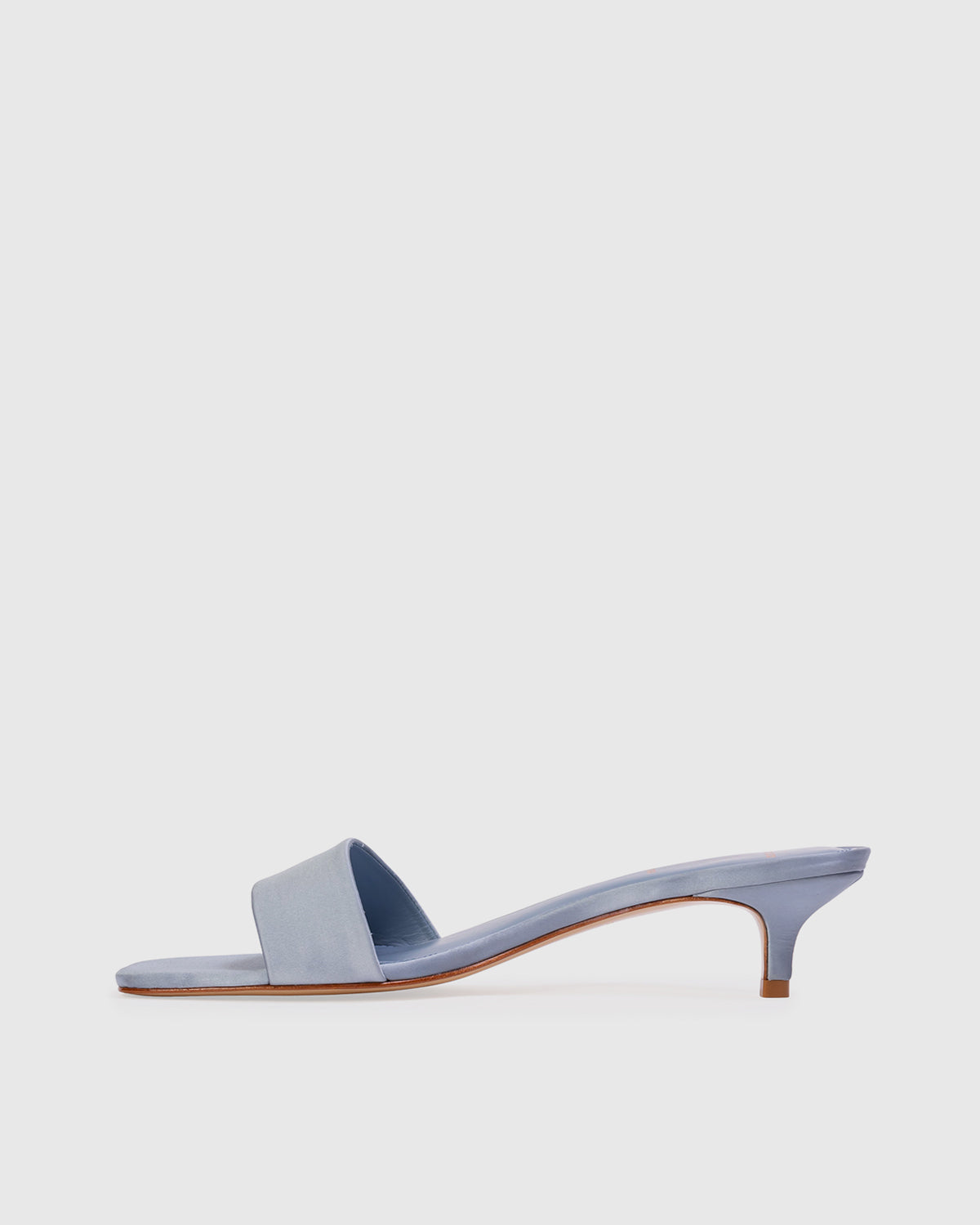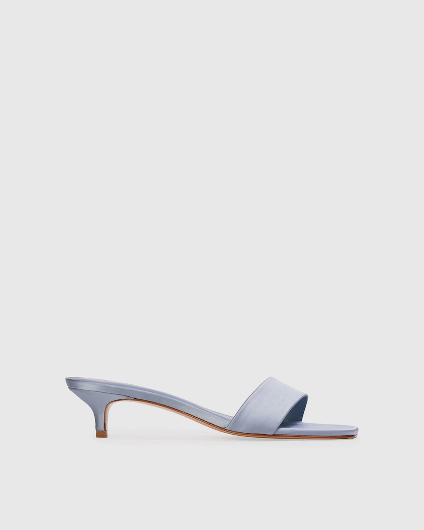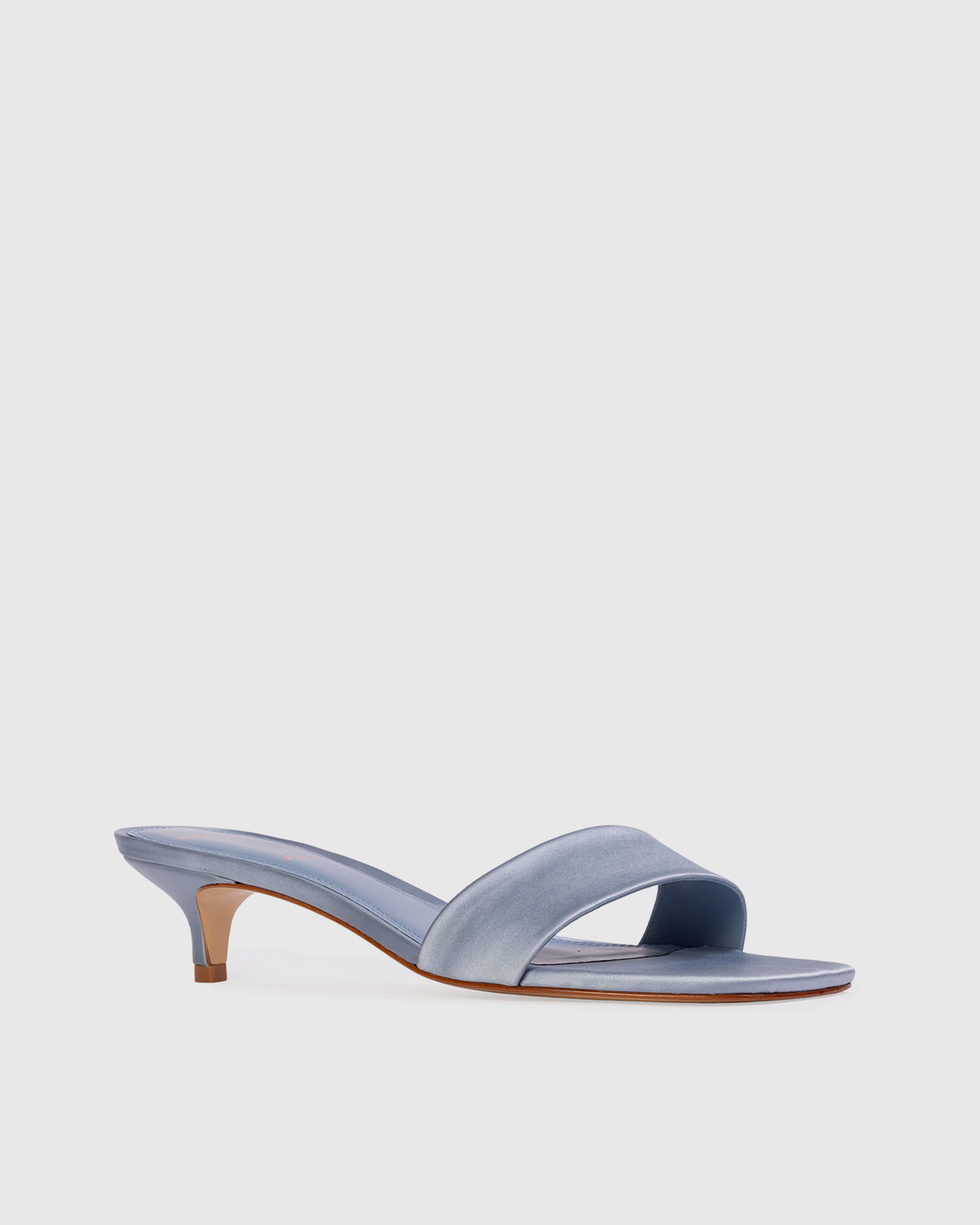 Square to slipper mule, set on a cone kitten heel. Made with satin crepe.