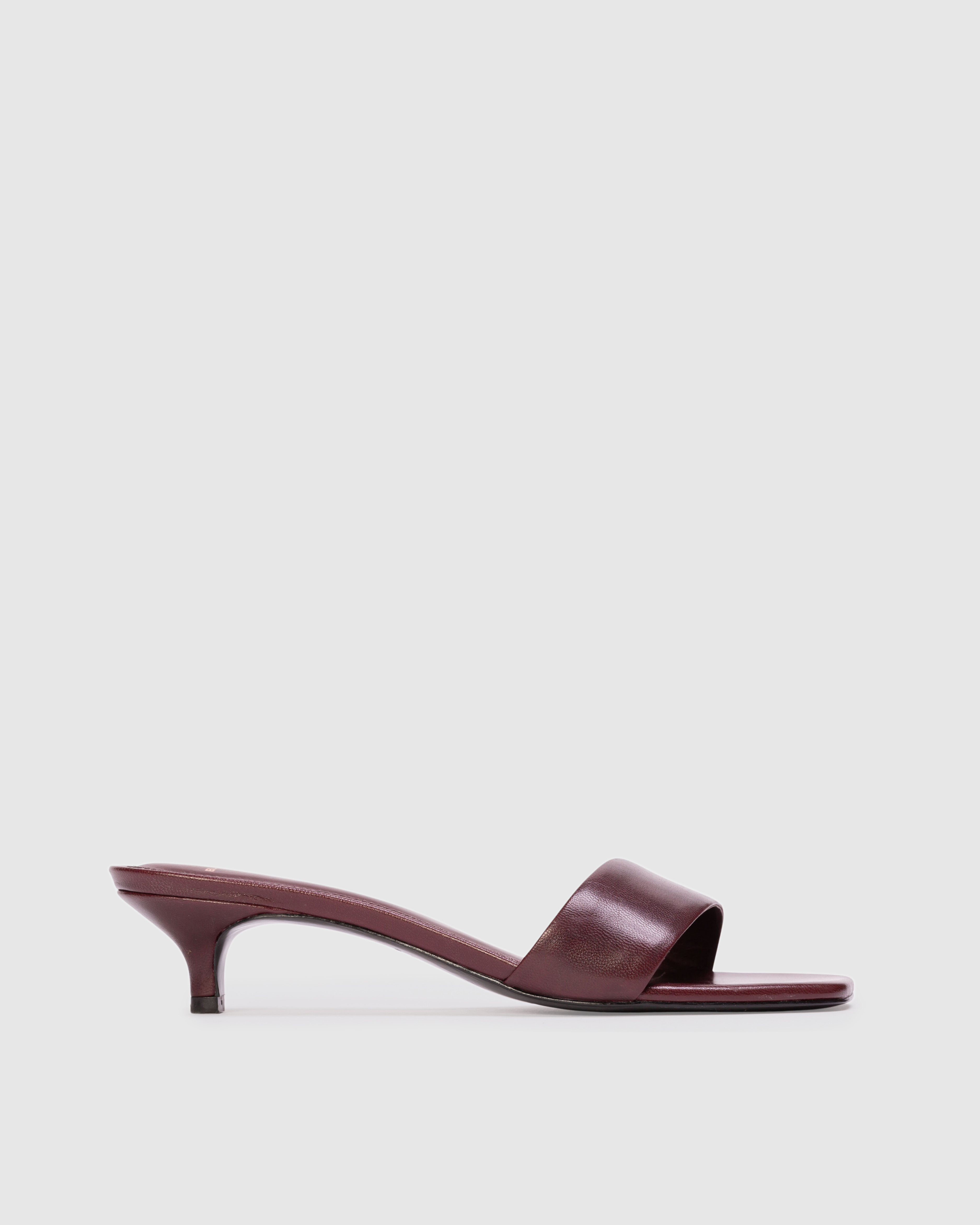 Square to slipper mule, set on a cone kitten heel. Made with smooth goat leather.