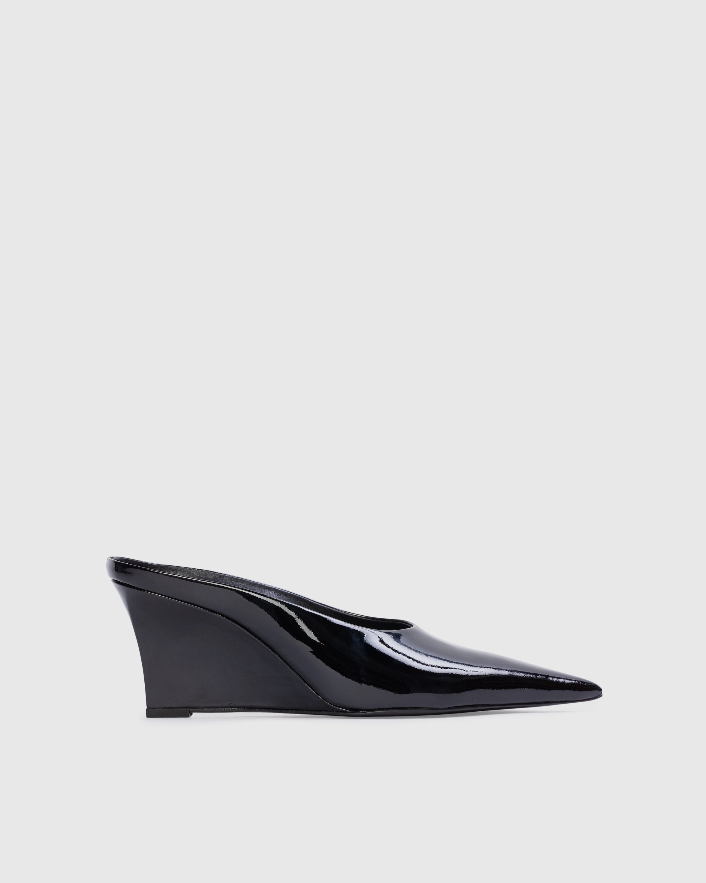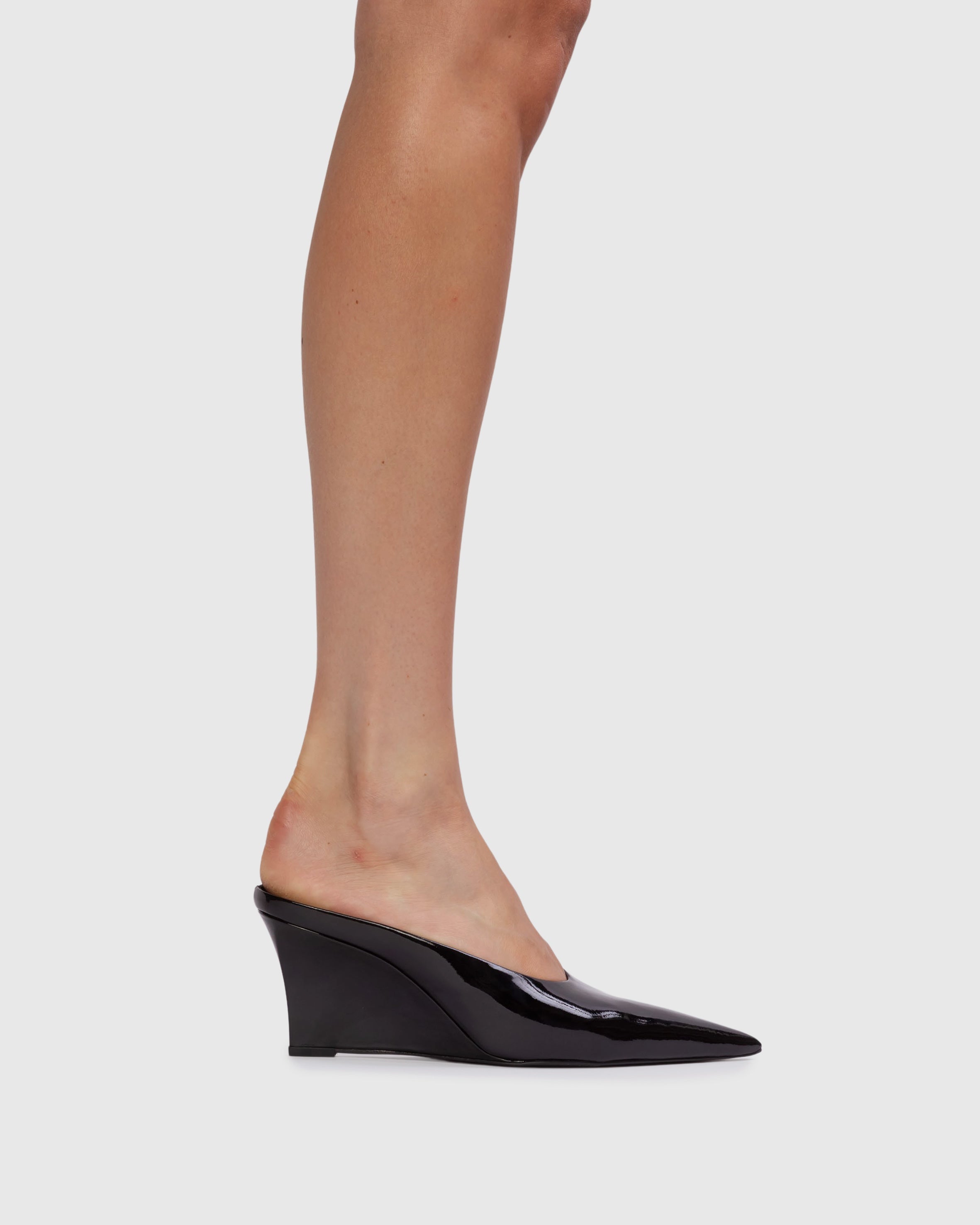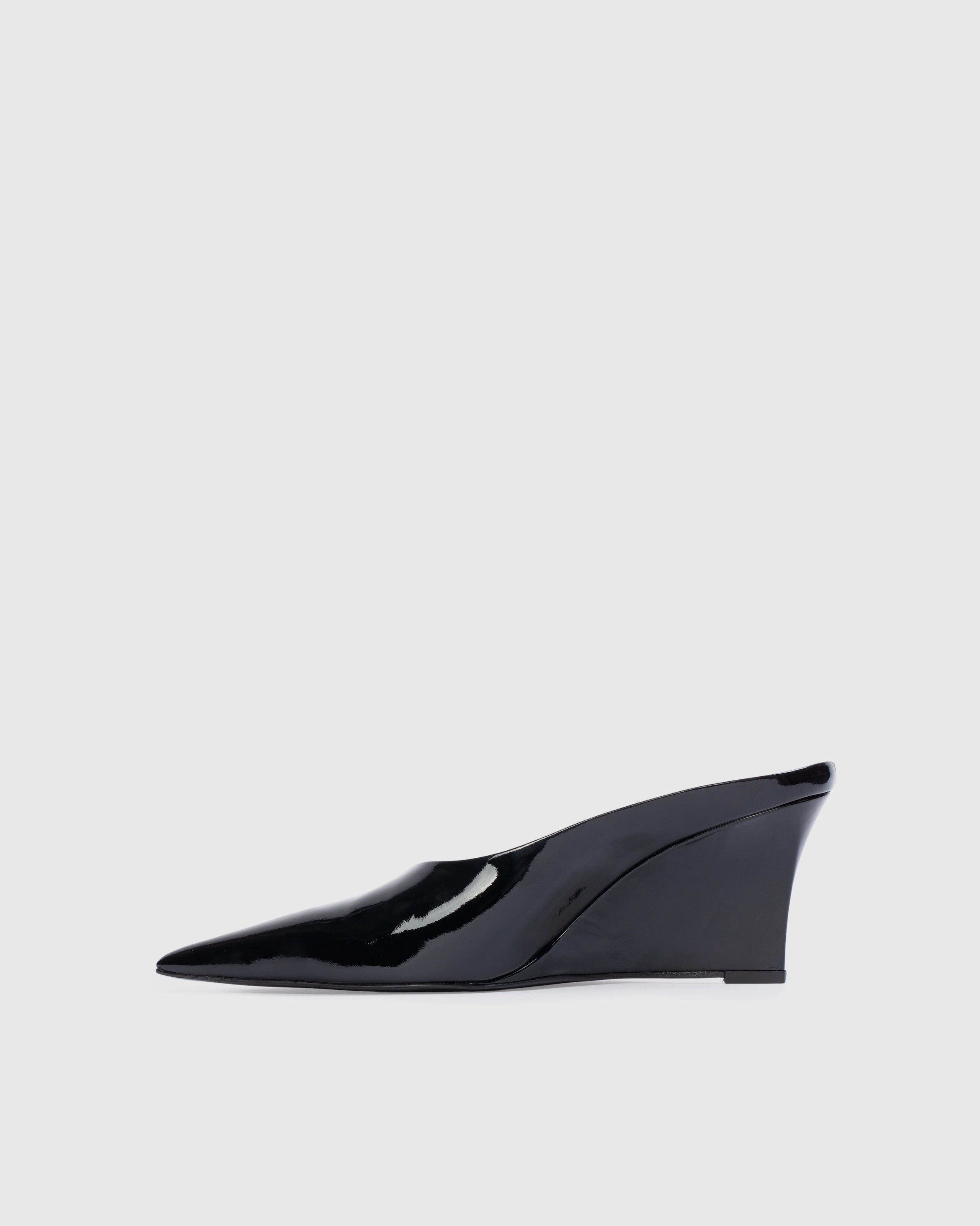 Pointed toe mule, set on a sculpted wedge. Made with smooth patent leather.