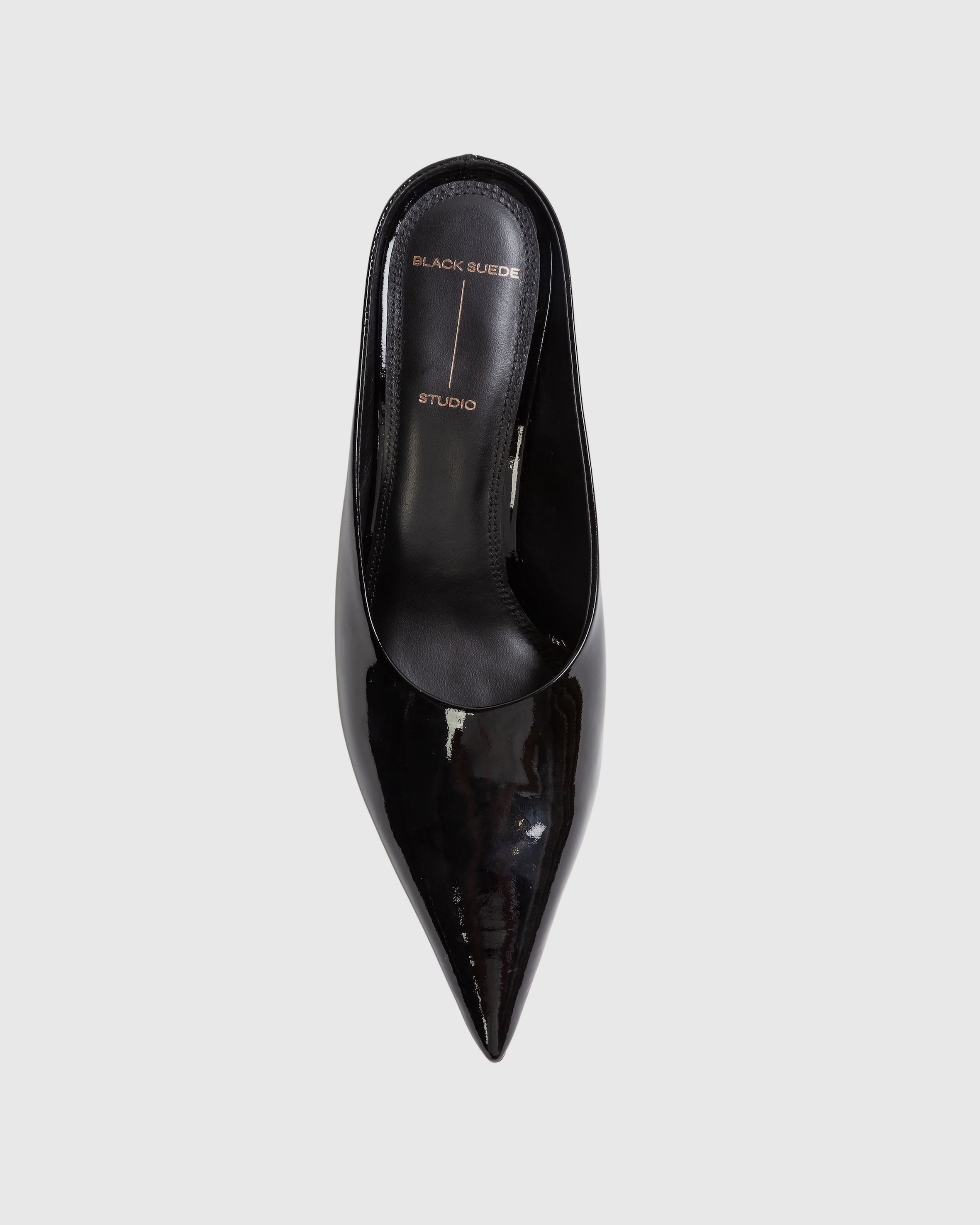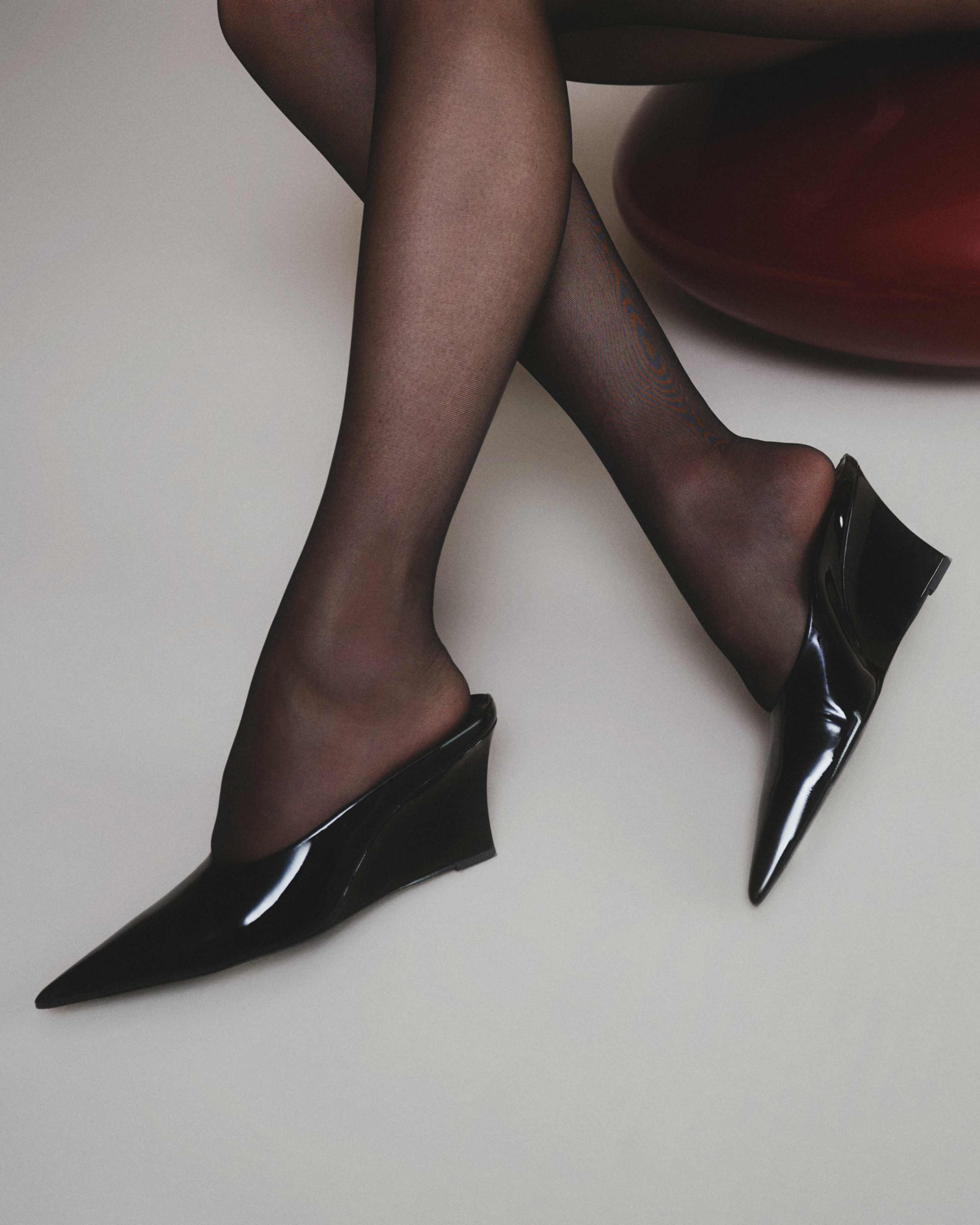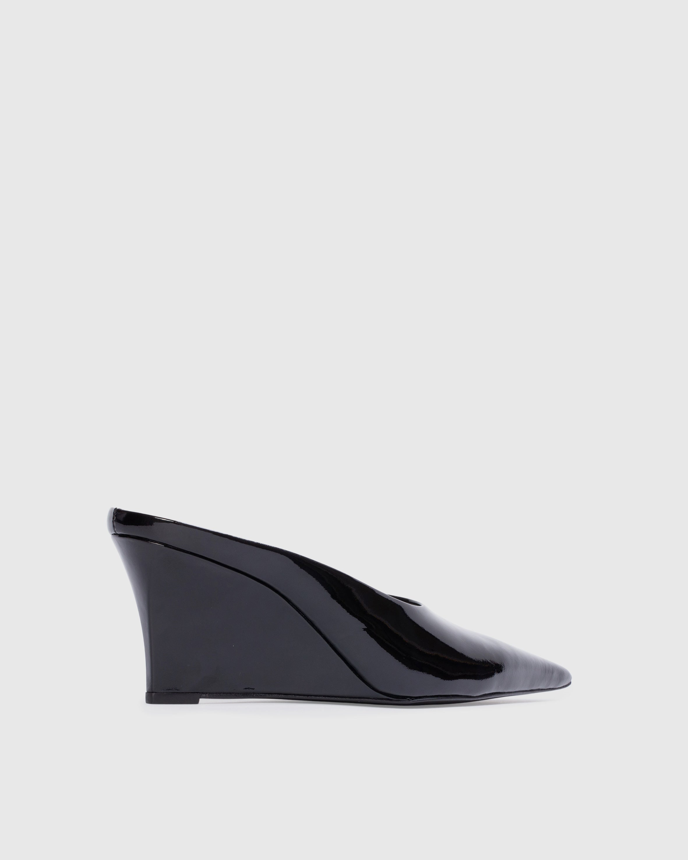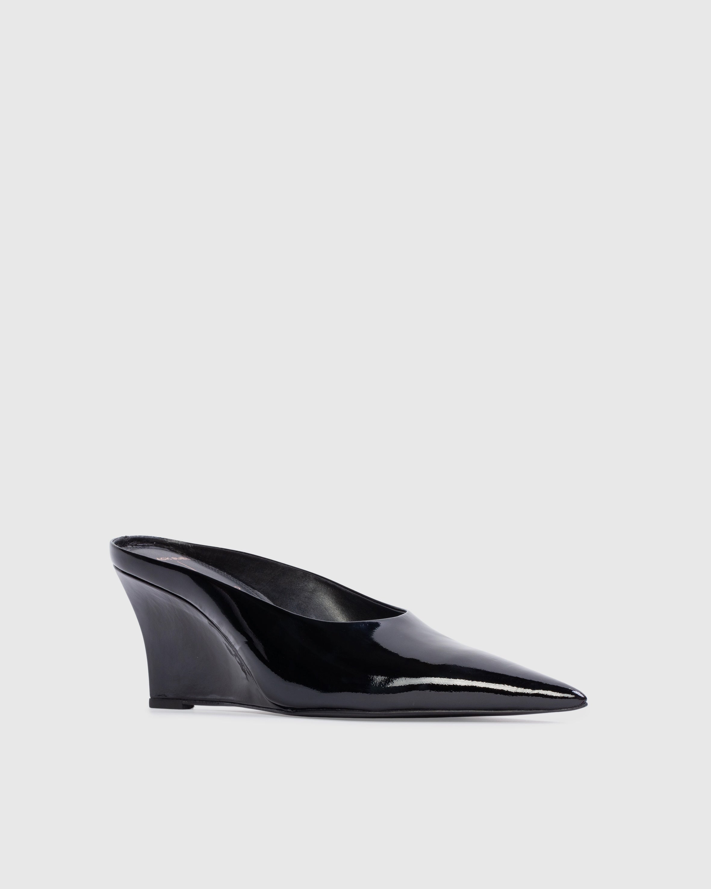 Pointed toe mule, set on a sculpted wedge. Made with smooth patent leather.