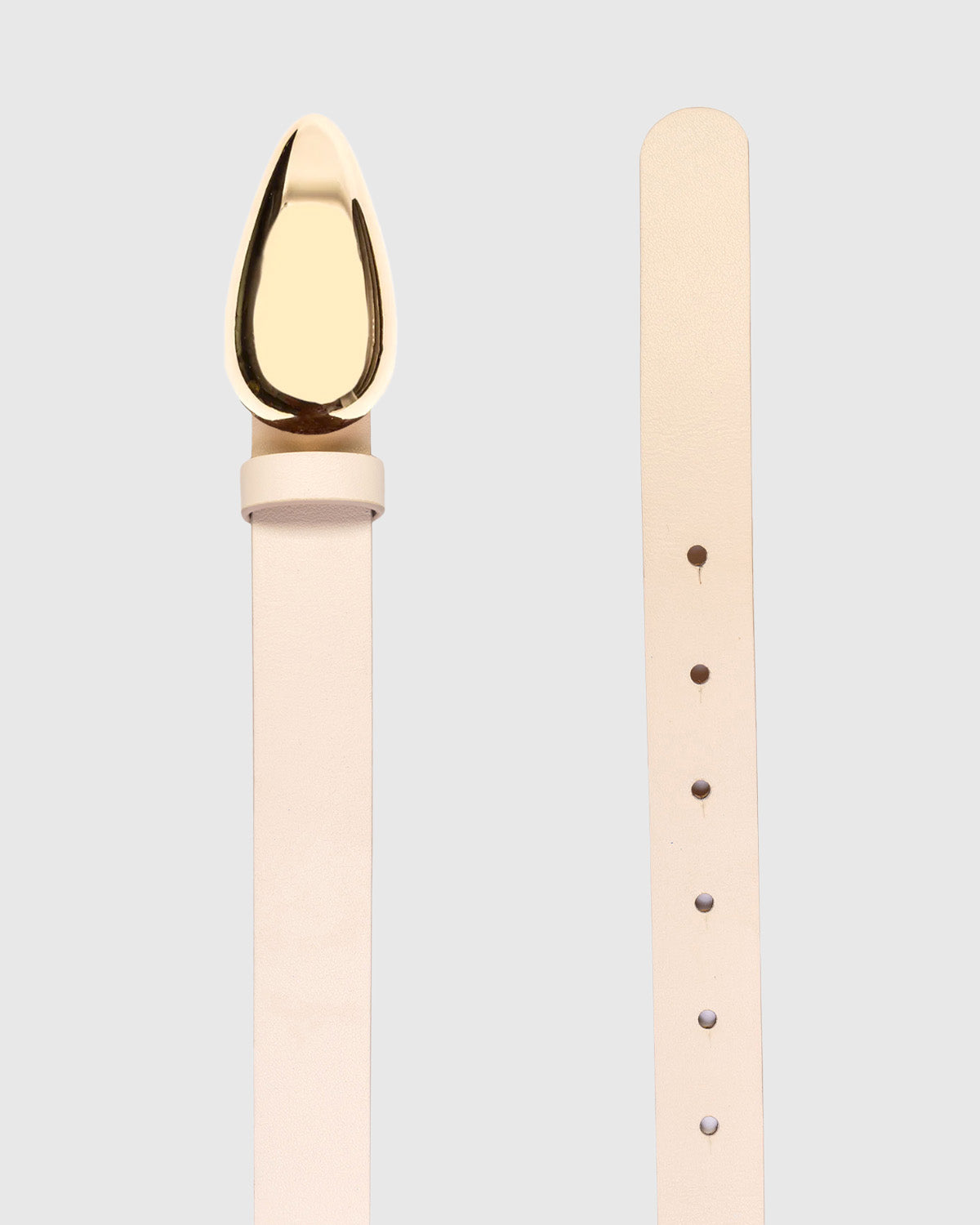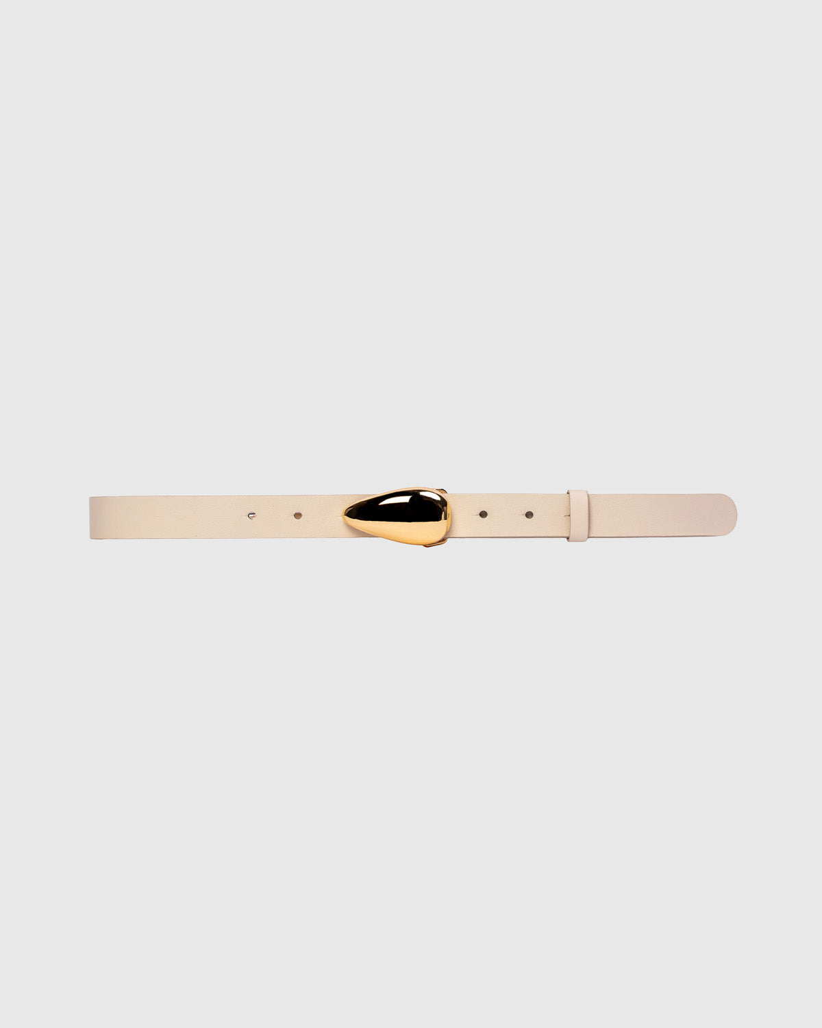 gold plated brass bean shaped buckle. Secured on a smooth buffed leather strap.