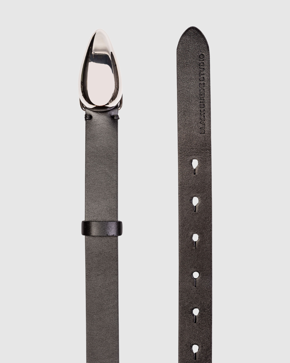 Silver plated bean shaped buckle. Secured on a smooth buffed leather strap.