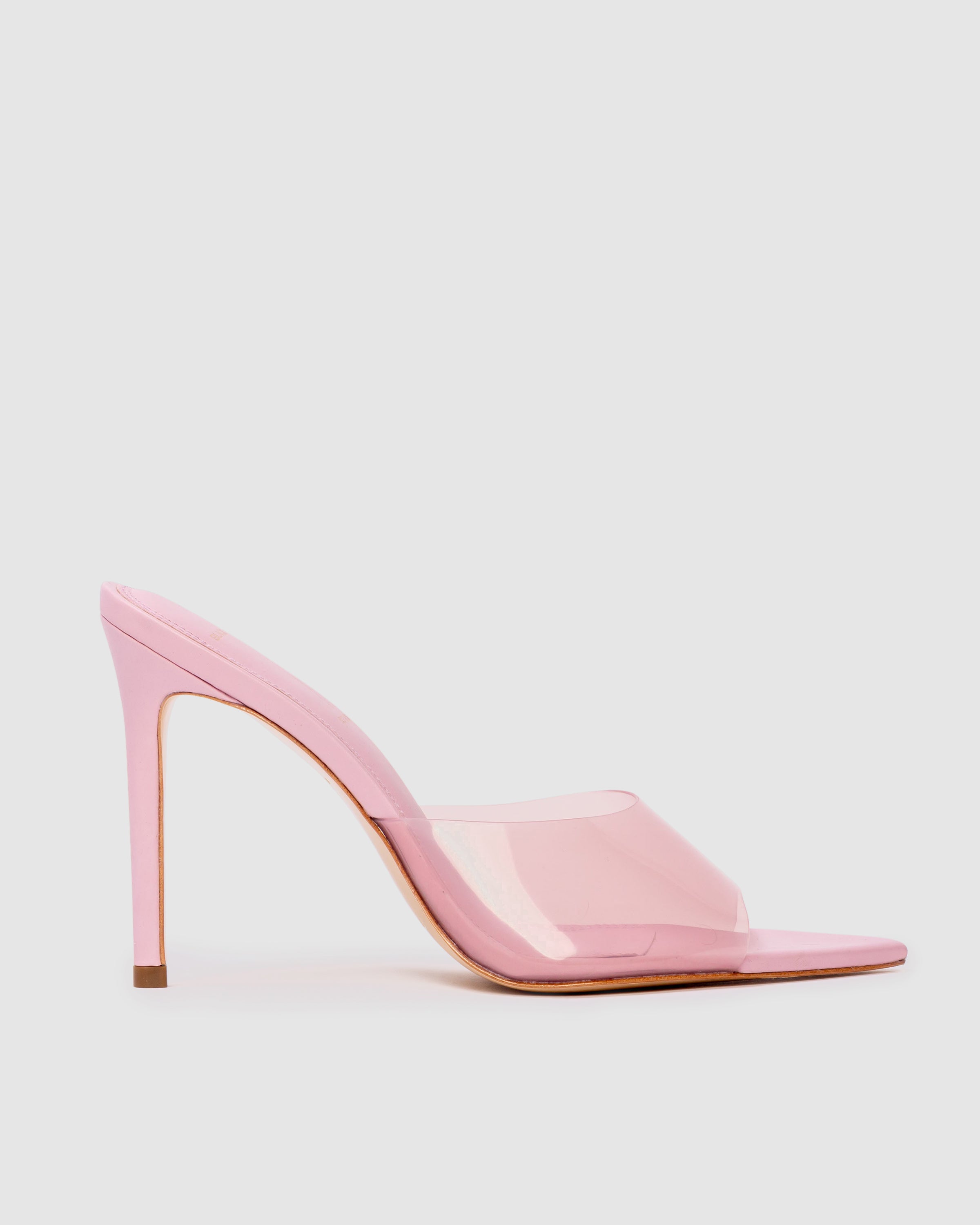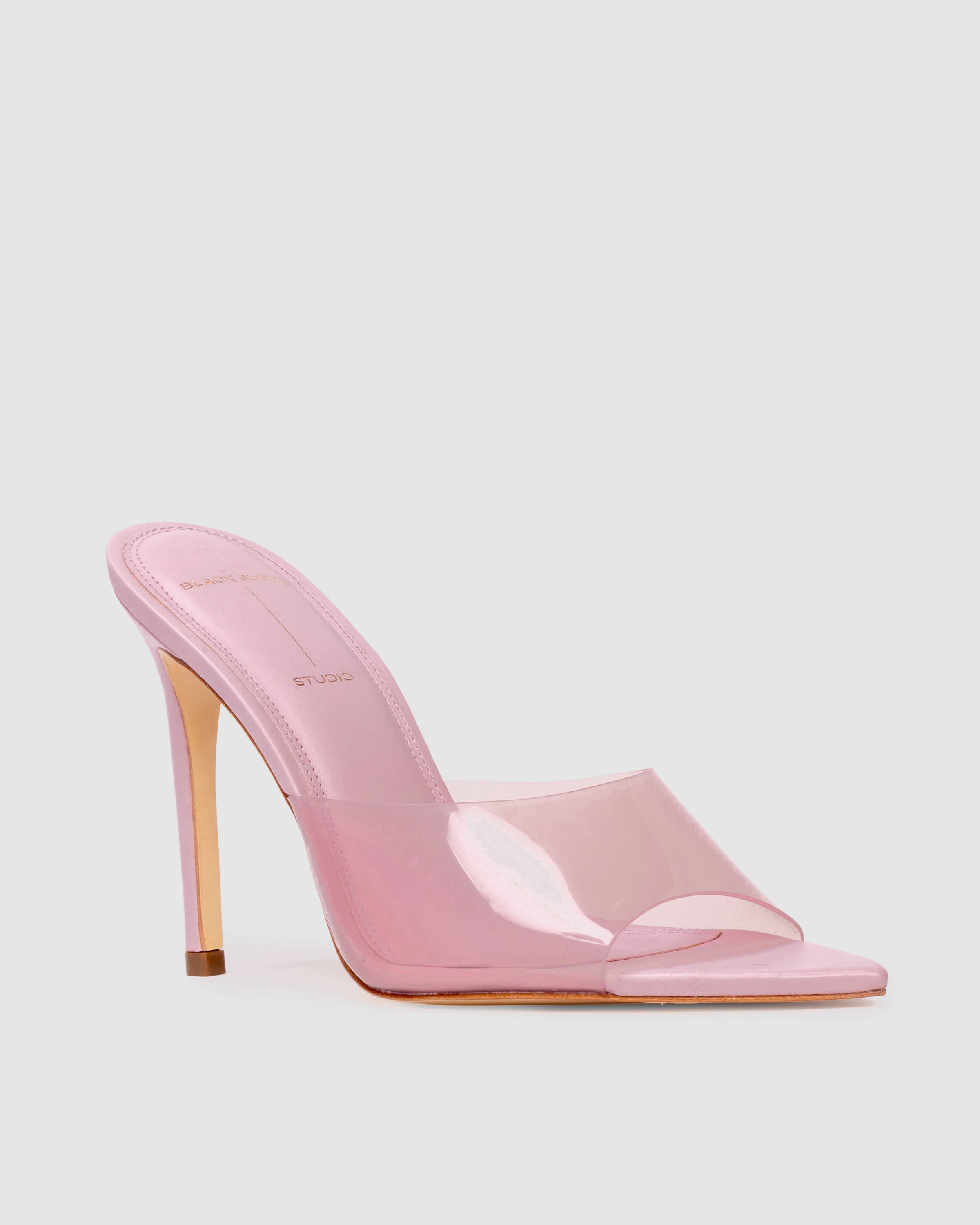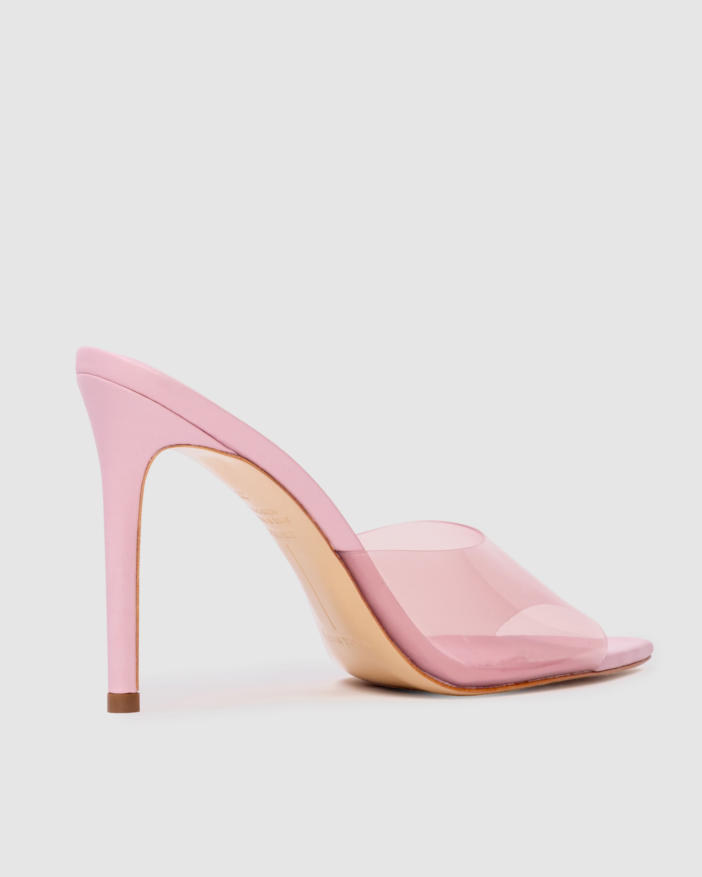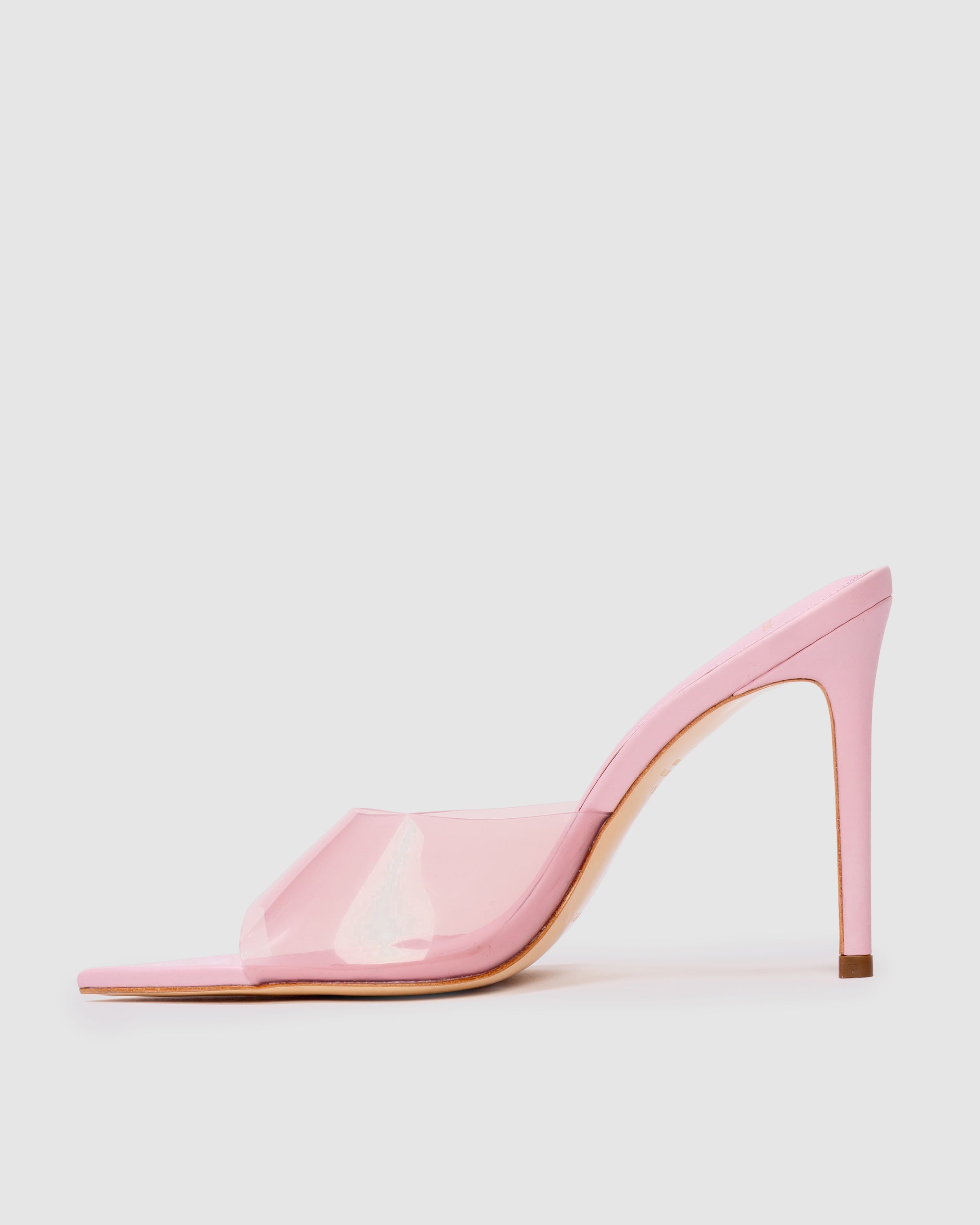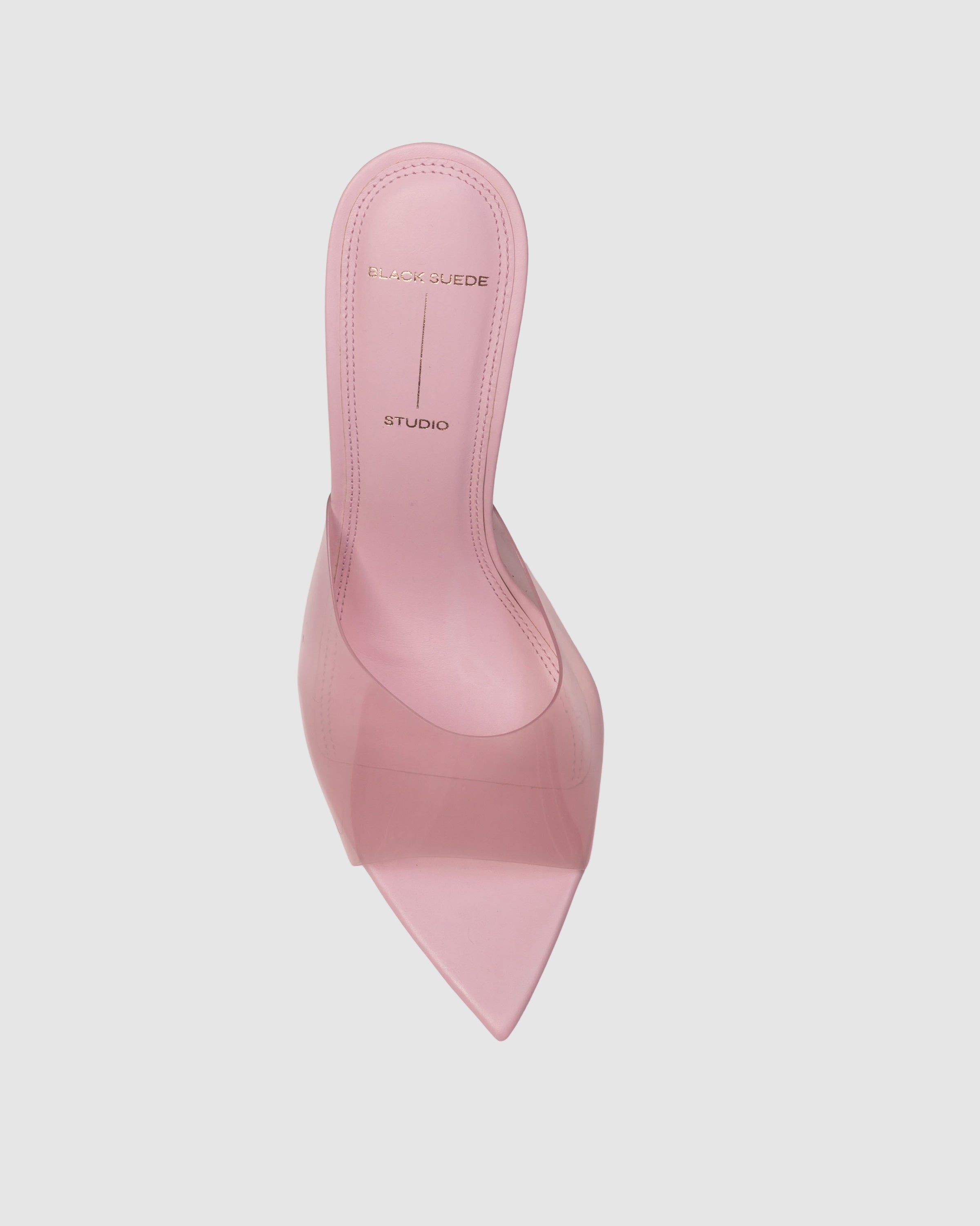 Pointy toe slipper mule with matching PVC upper, set on a straight stiletto heel. made with smooth buffed leather.