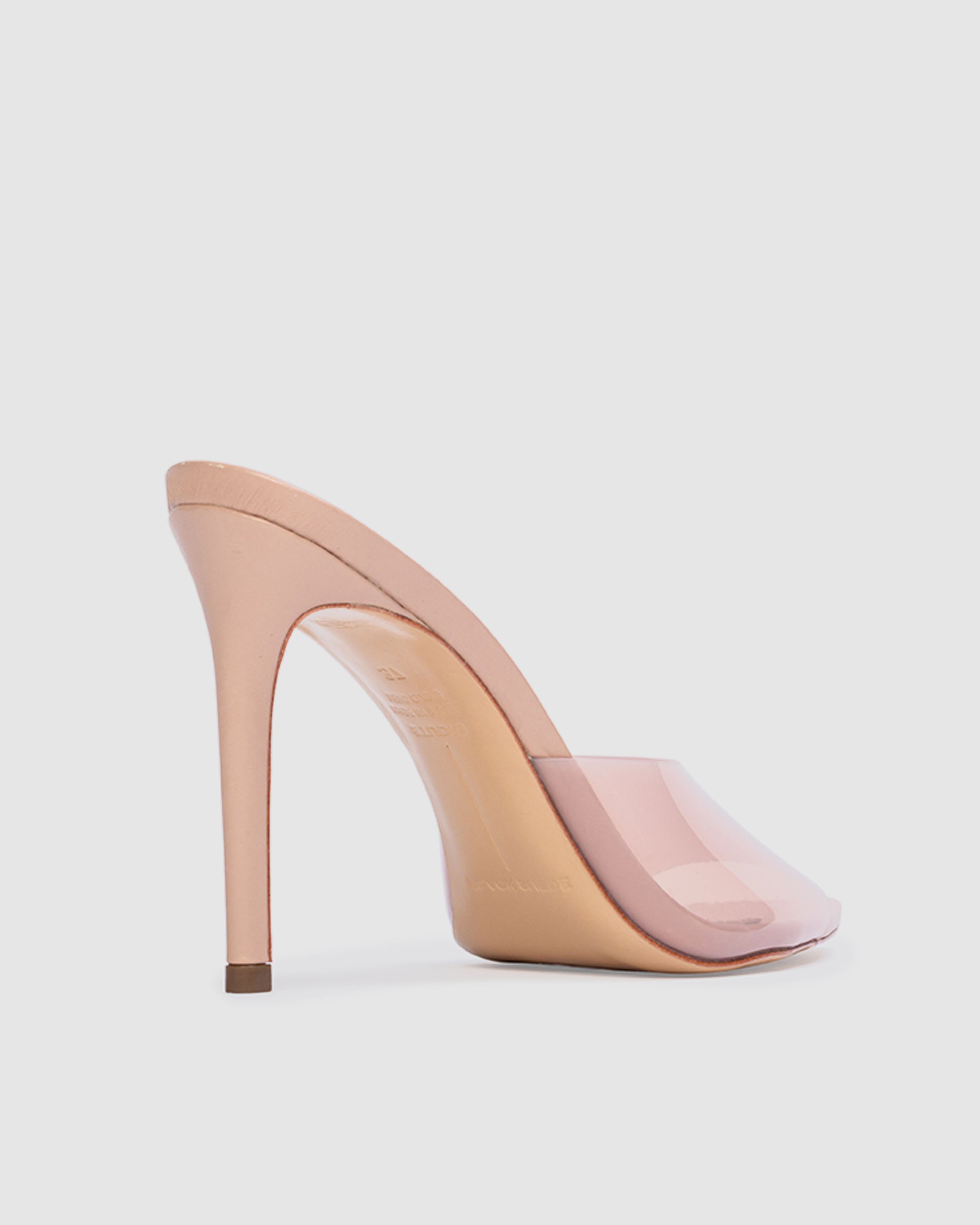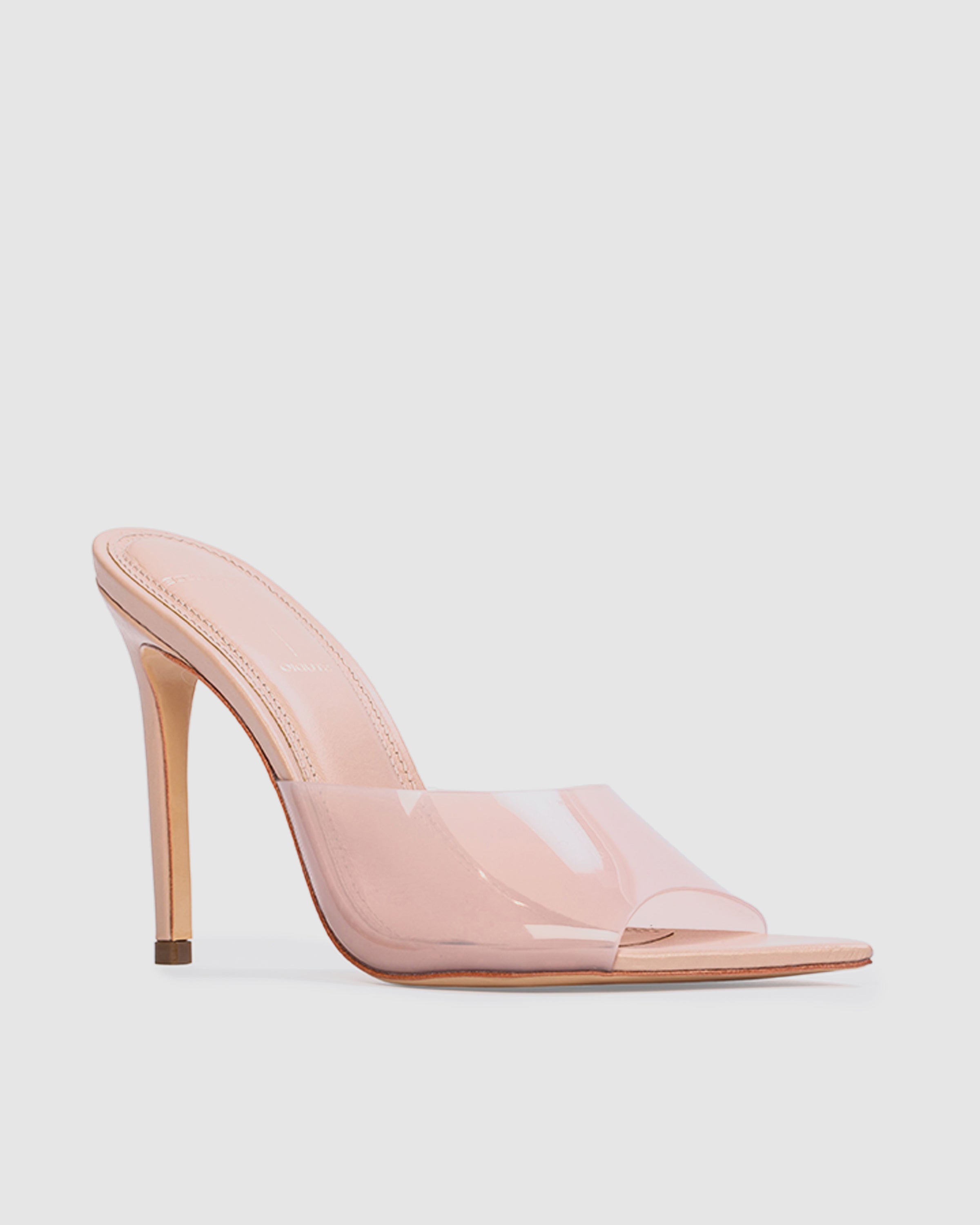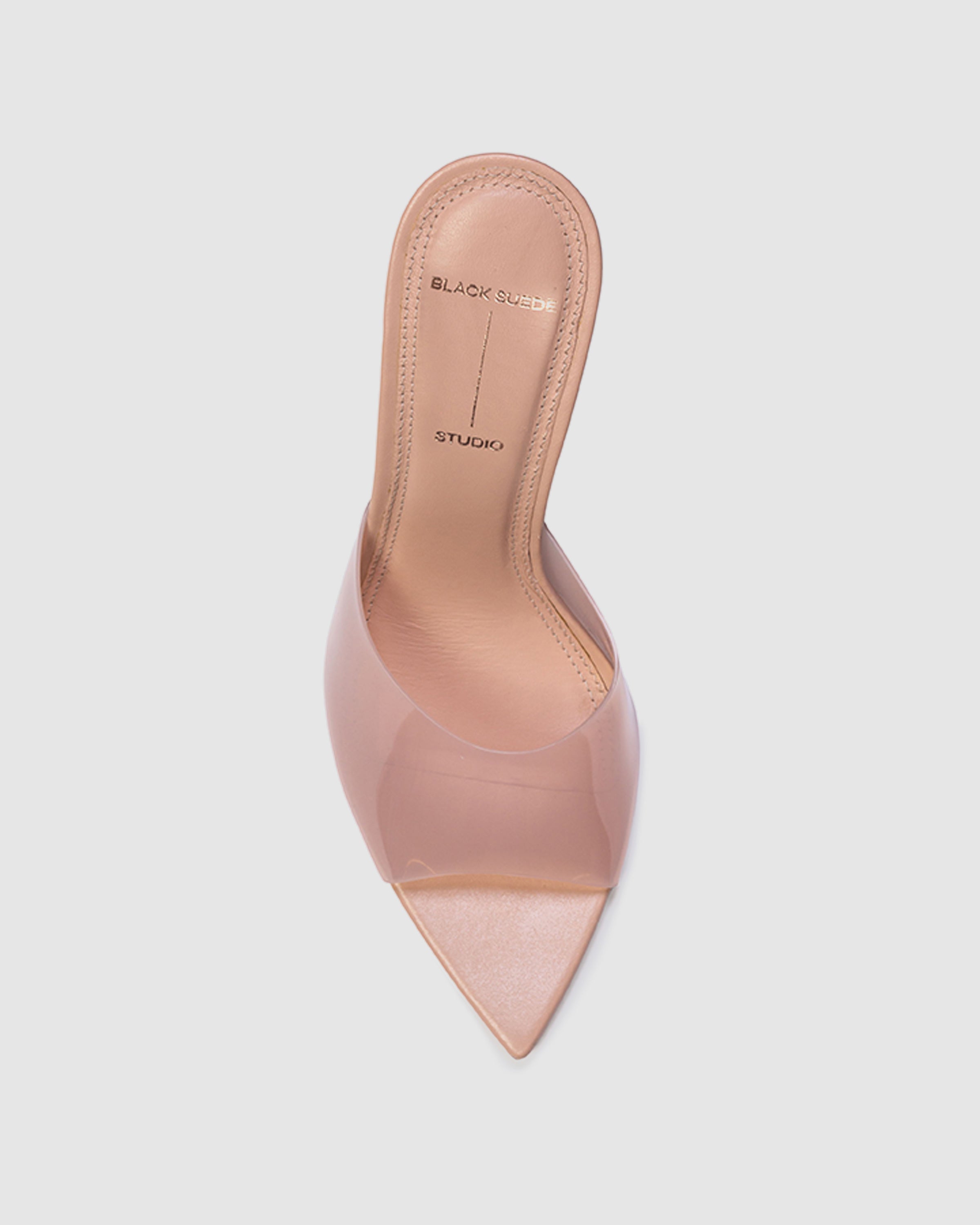 Pointy toe slipper mule with matching PVC upper, set on a straight stiletto heel. Made with smooth buffed leather.