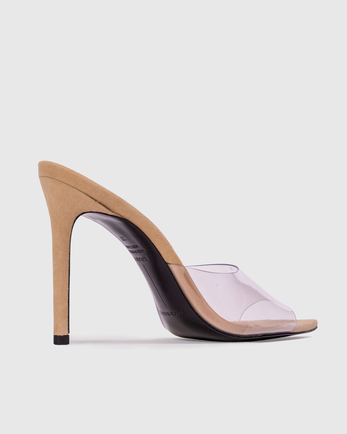Pointy toe slipper mule with matching PVC upper, set on a straight stiletto heel. Made with brushed kid suede.