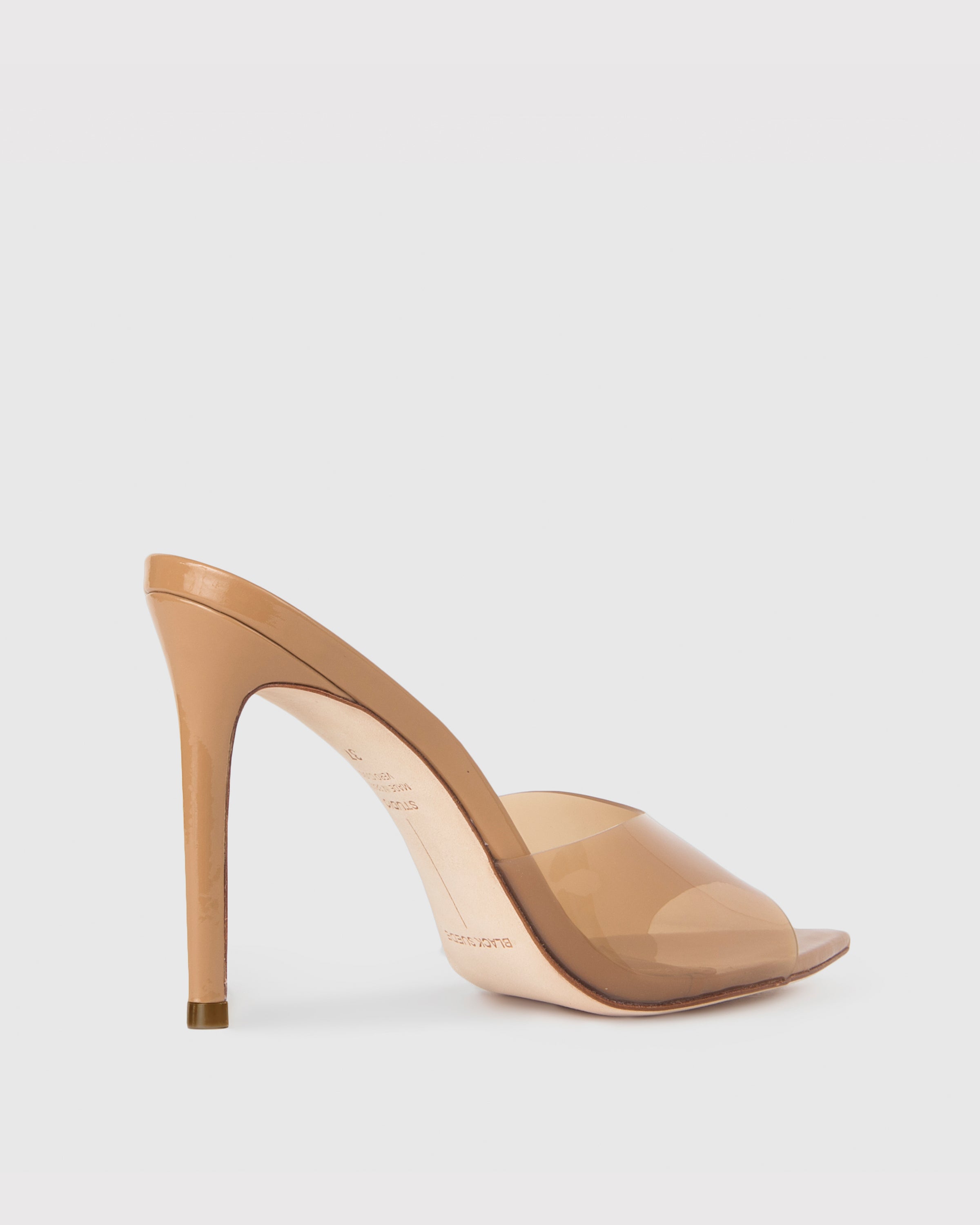 Pointy toe slipper mule with matching PVC upper, set on a straight stiletto heel. Made with smooth buffed leather.