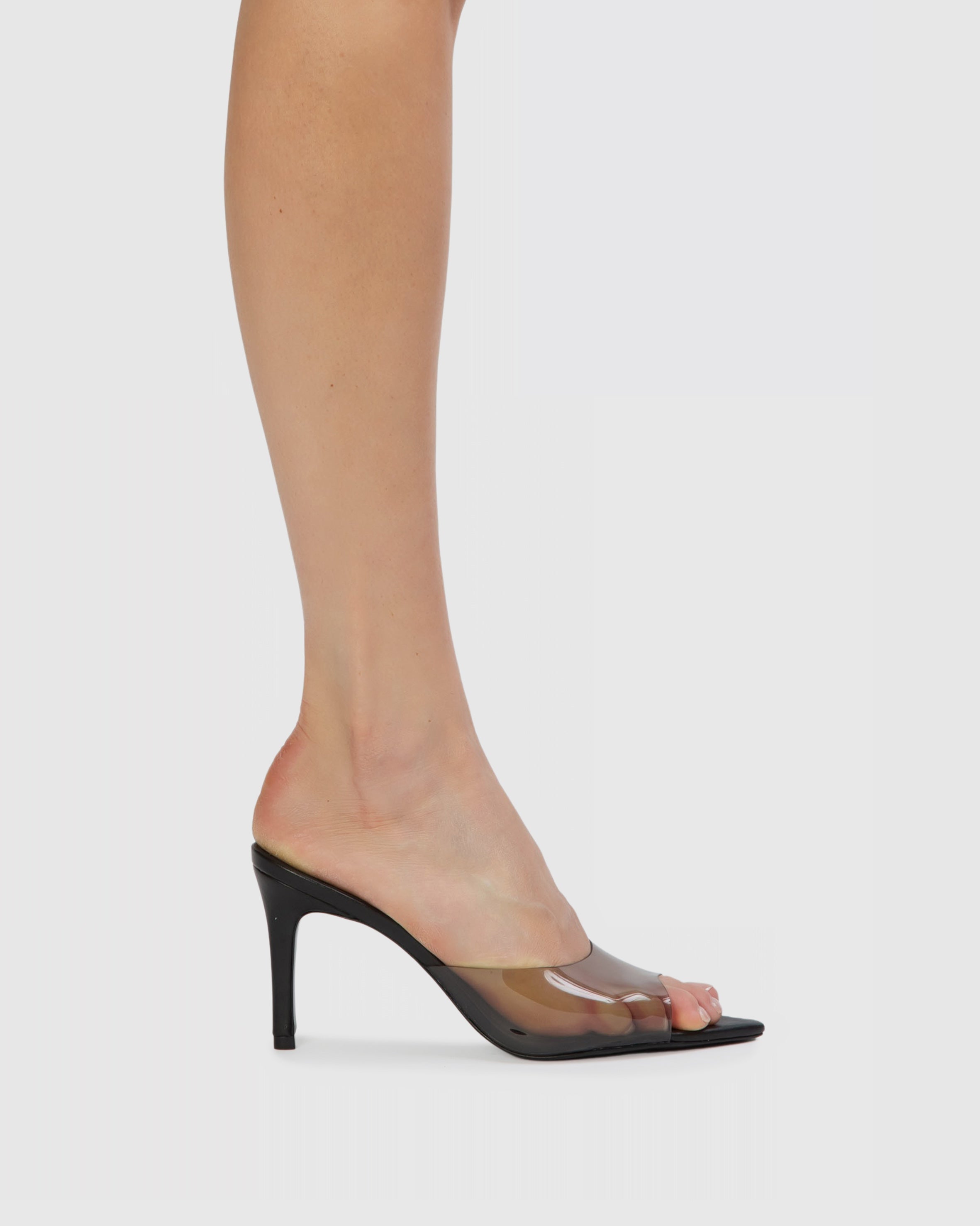 Pointy toe slipper mule with pvc detail, set on a straight high heel. Made with smooth buffed leather.