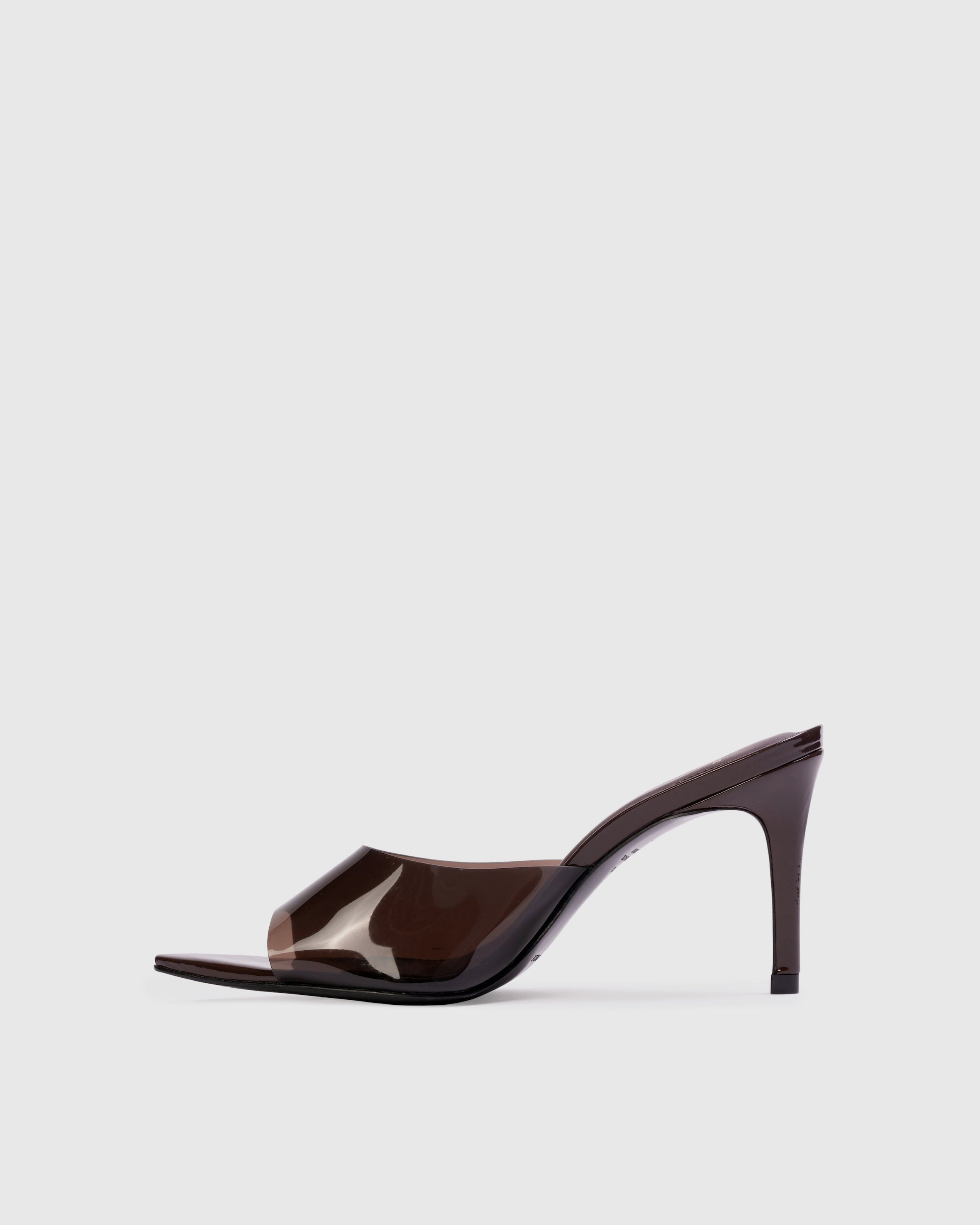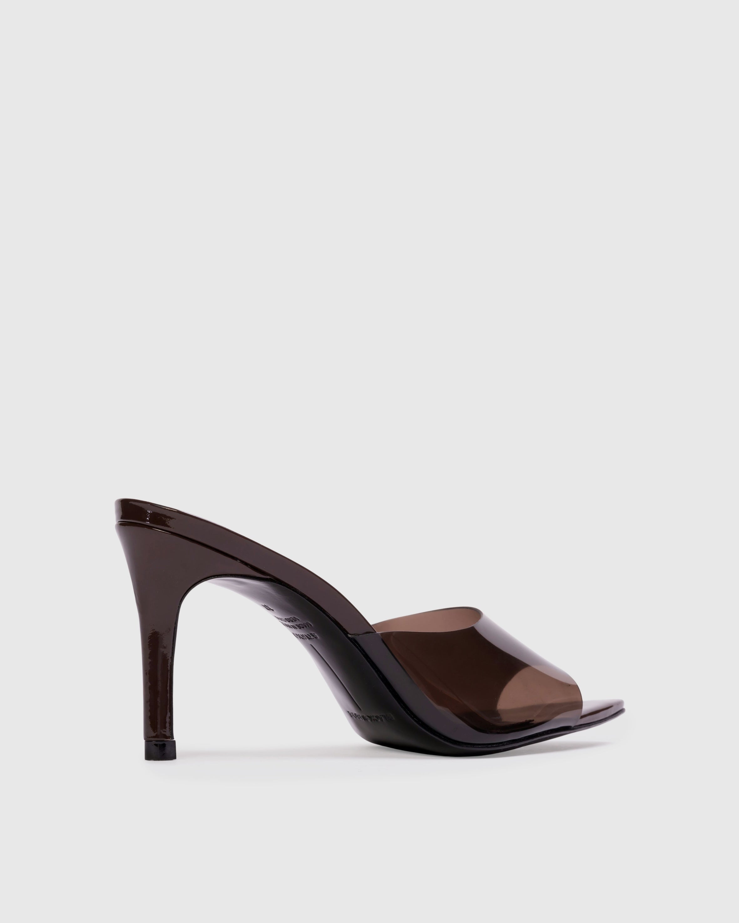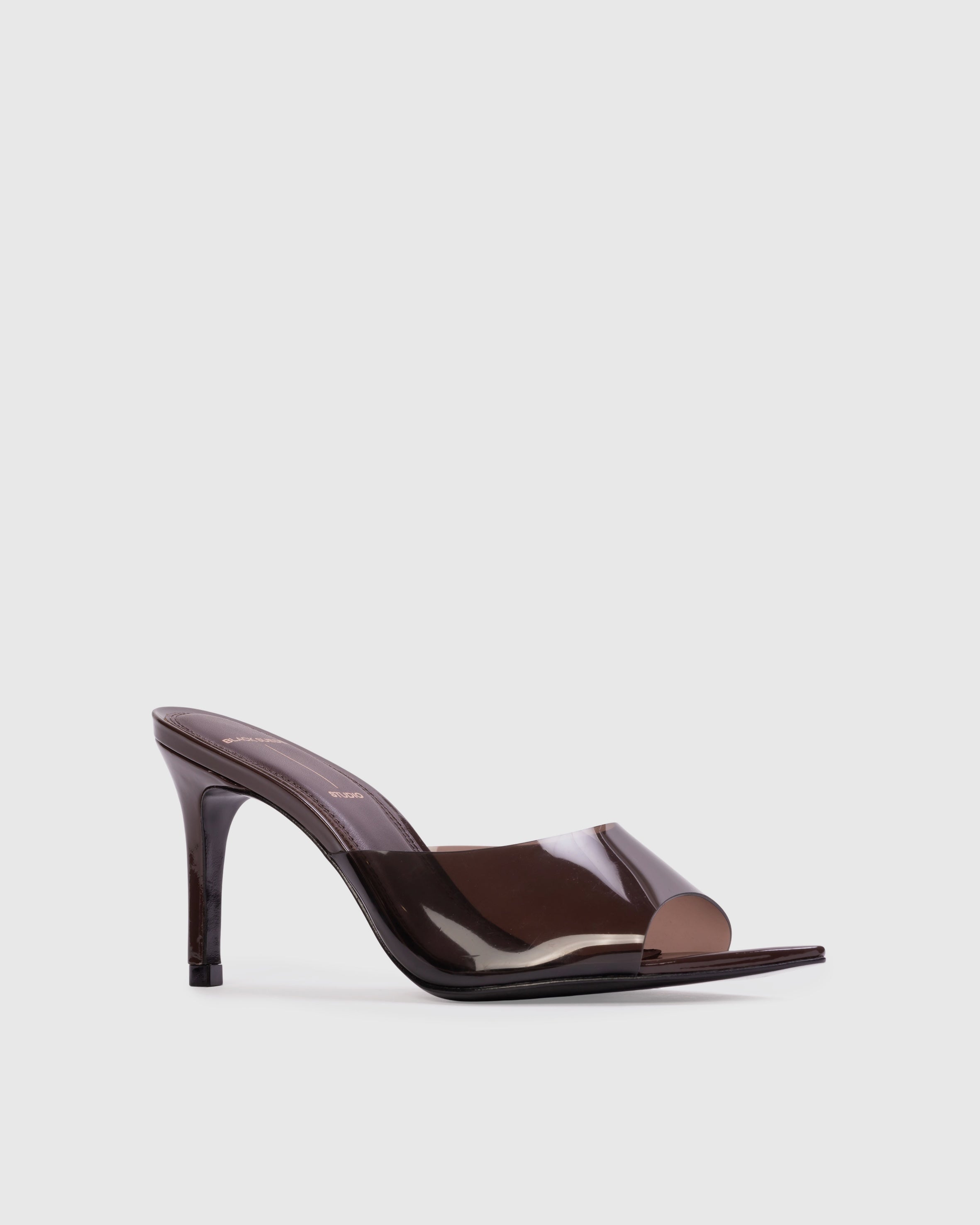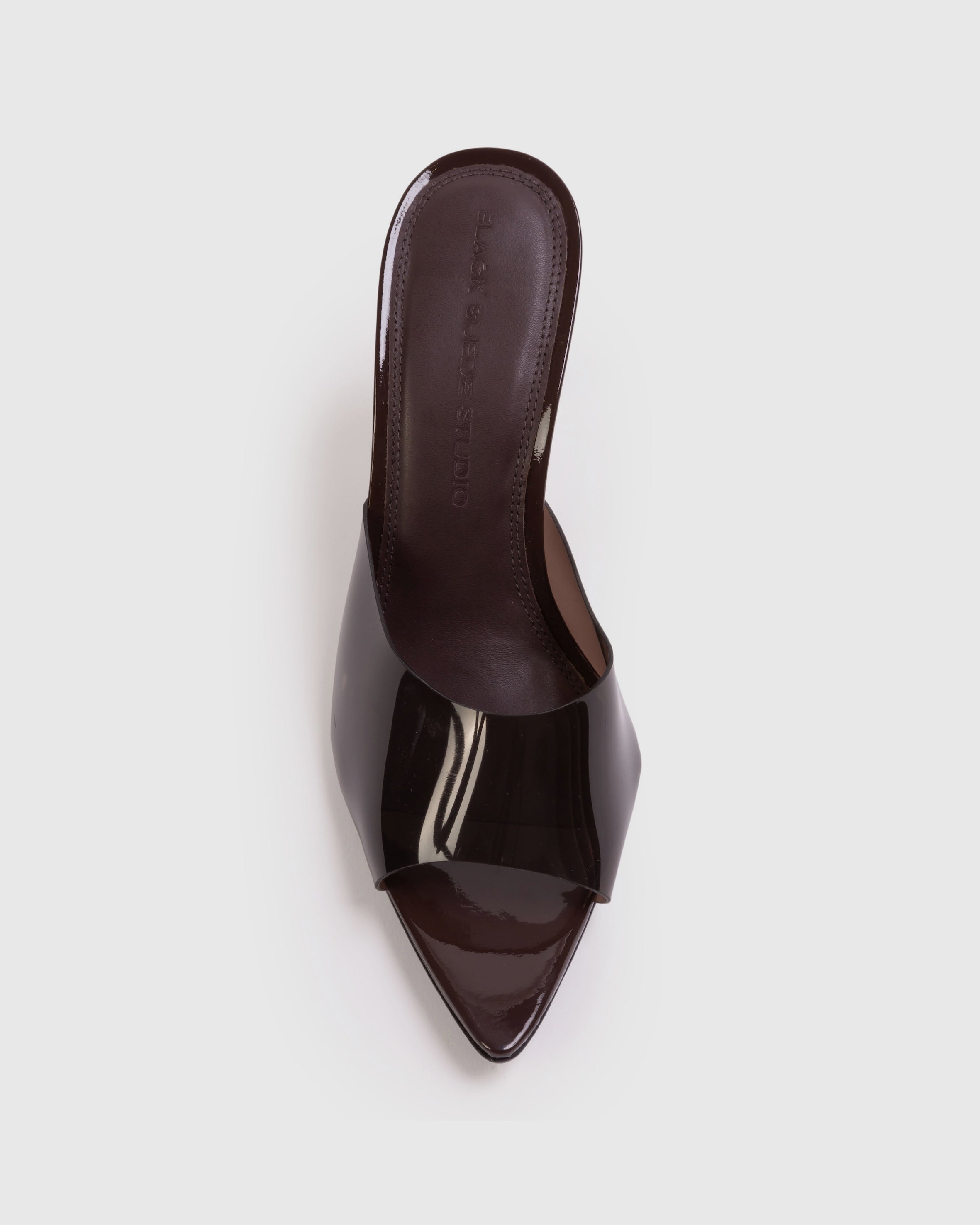 Pointy toe slipper mule with pvc detail, set on a straight high heel. Made with smooth patent leather.