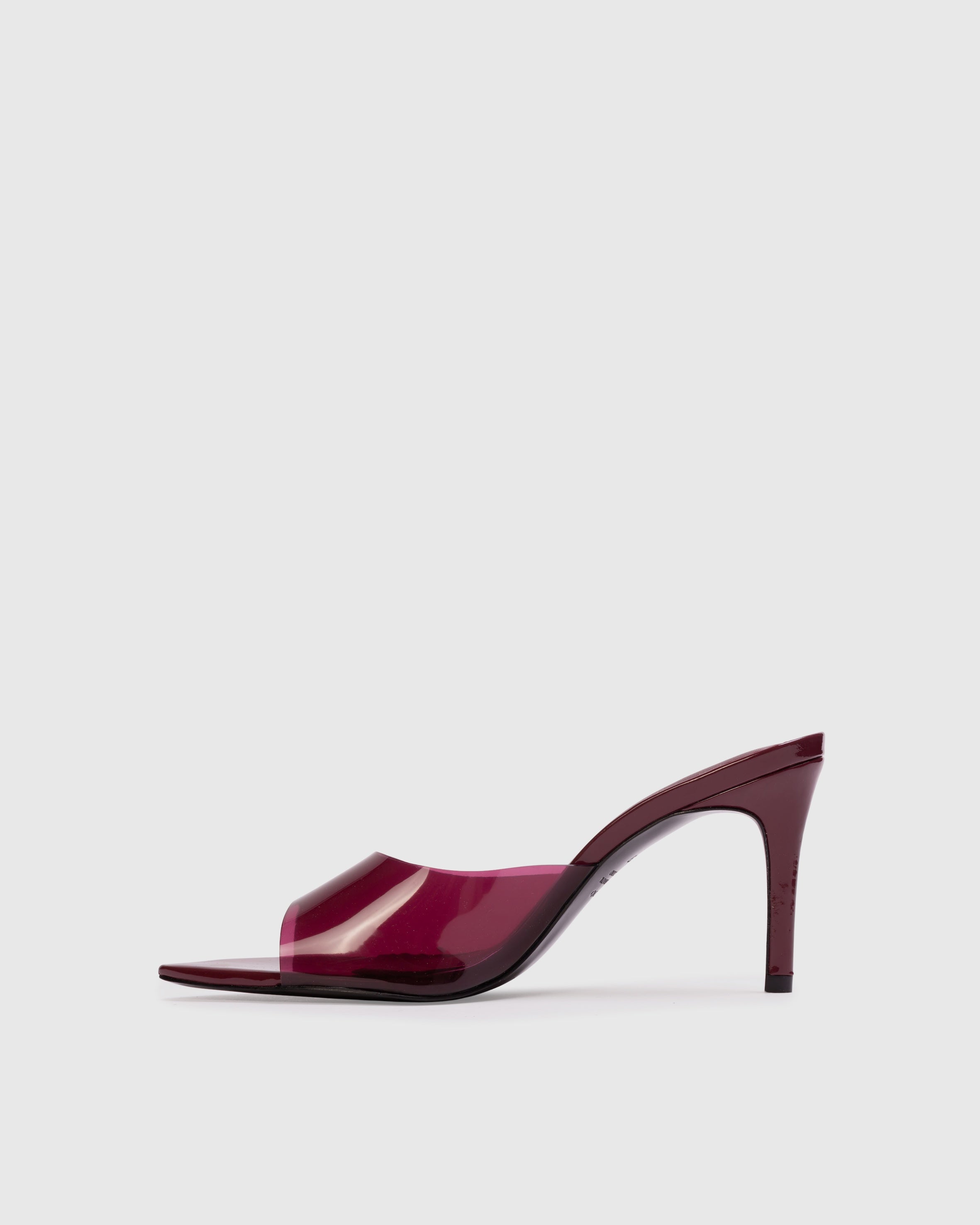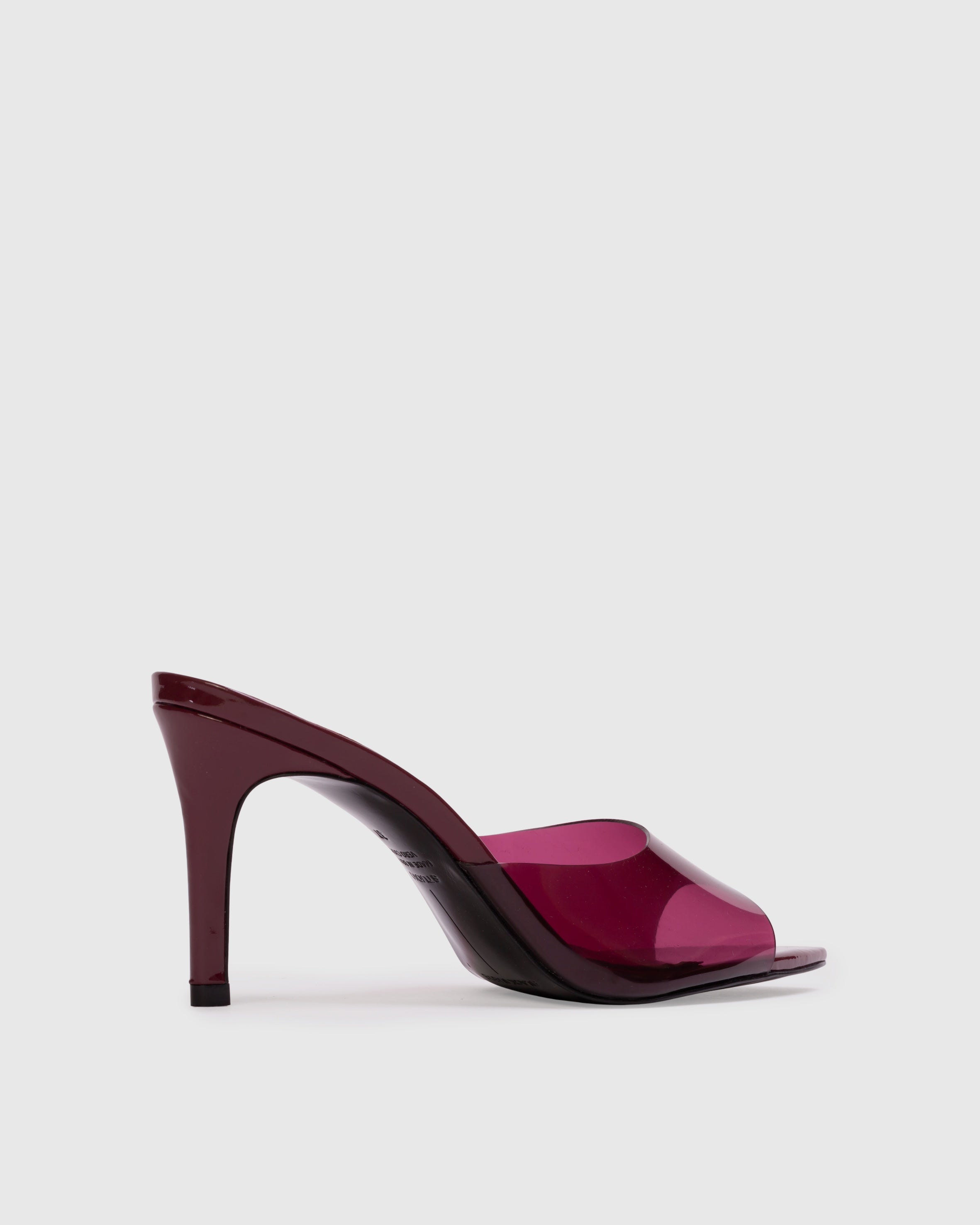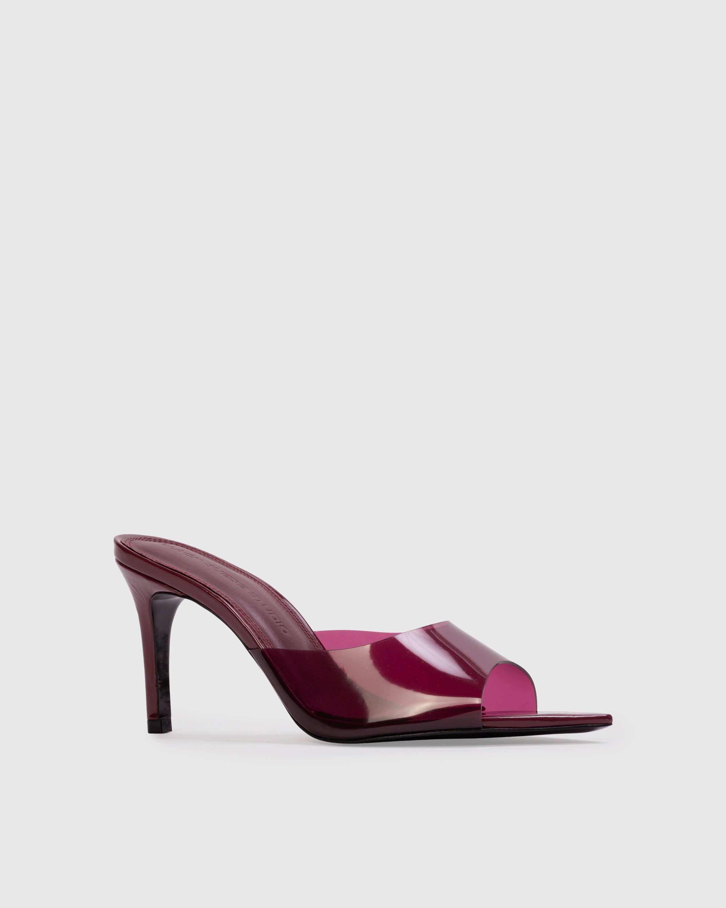 Pointy toe slipper mule with pvc detail, set on a straight high heel. Made with smooth patent leather.