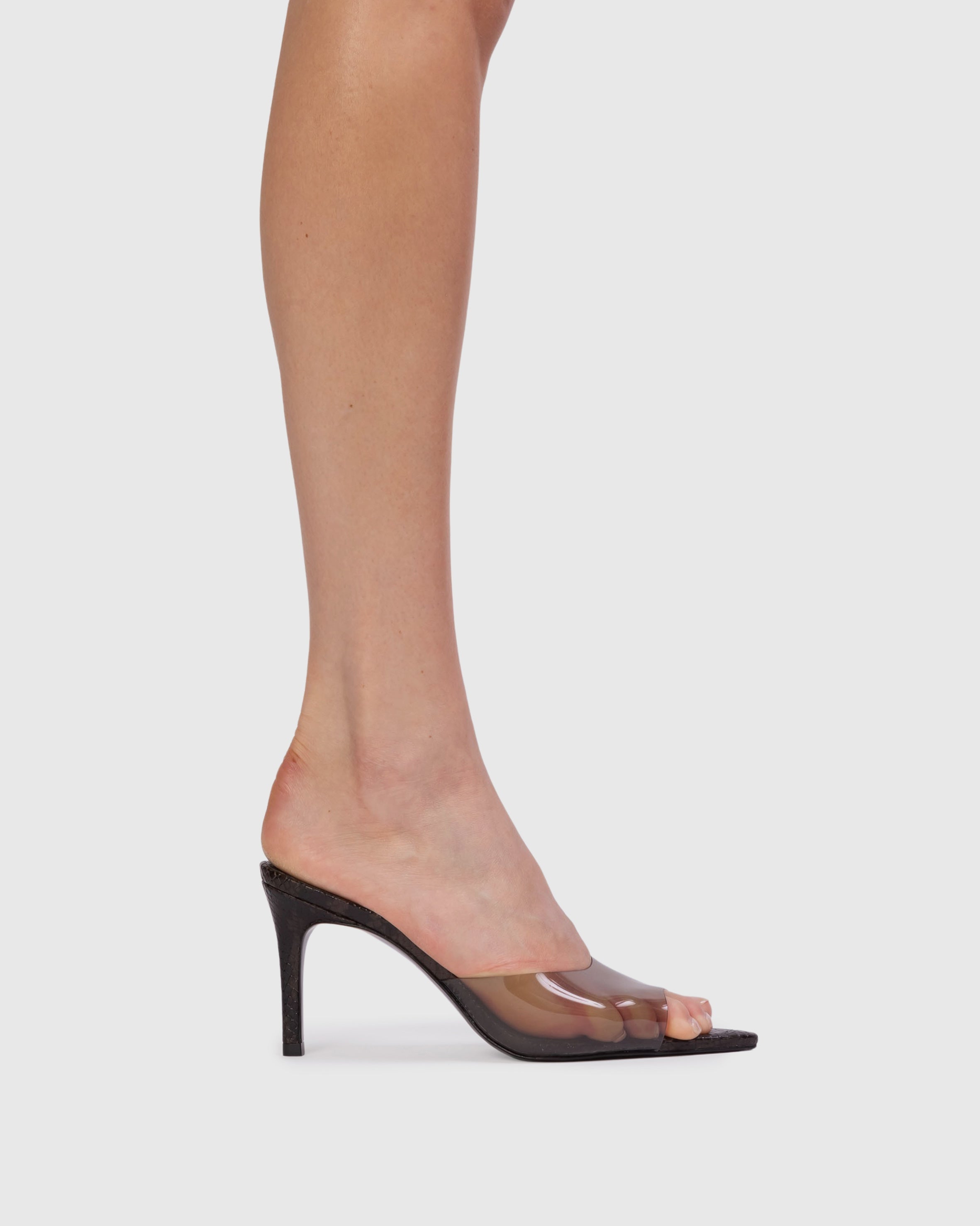 Pointy toe slipper mule with pvc detail, set on a straight high heel. Made with buffed snake printed leather.
