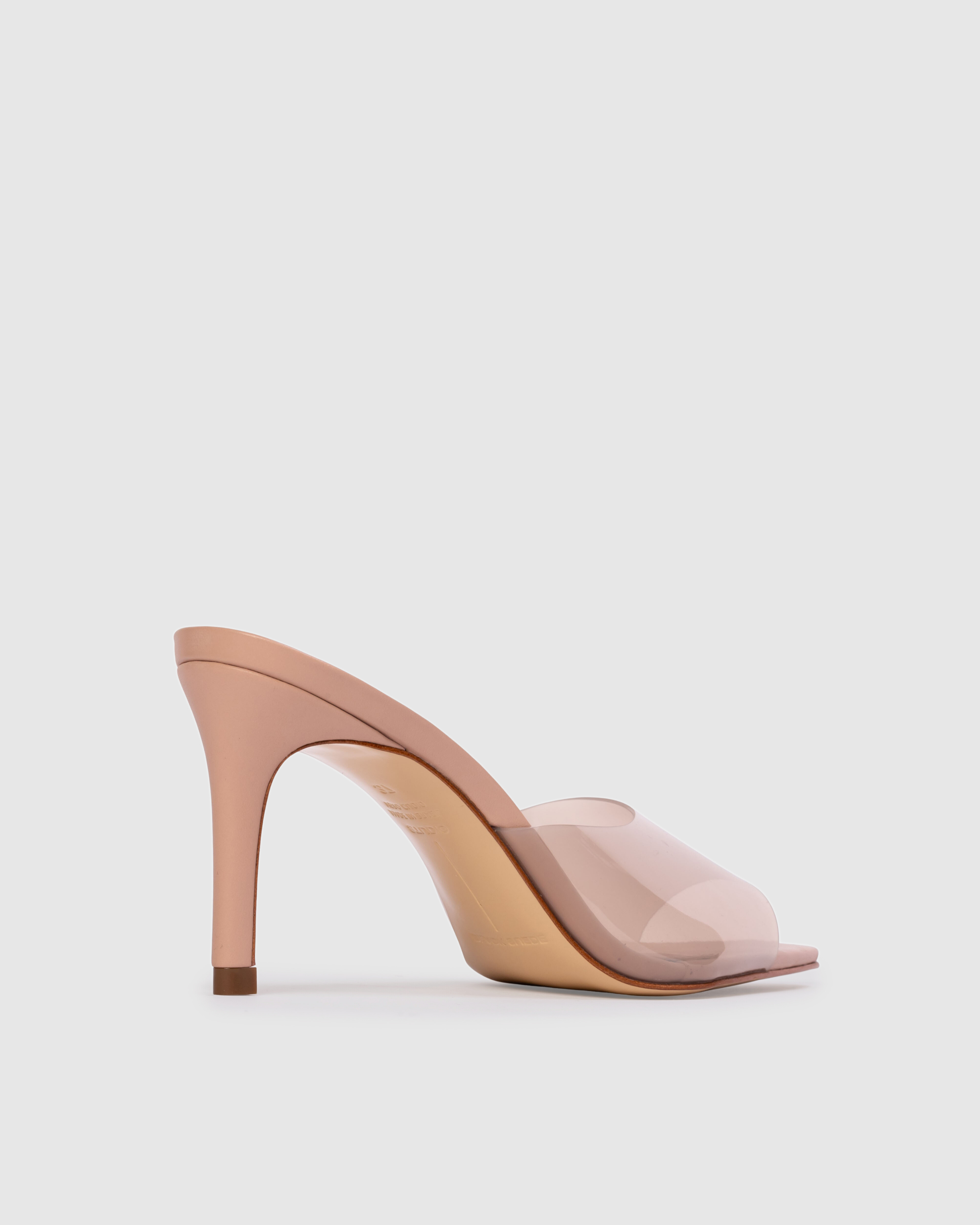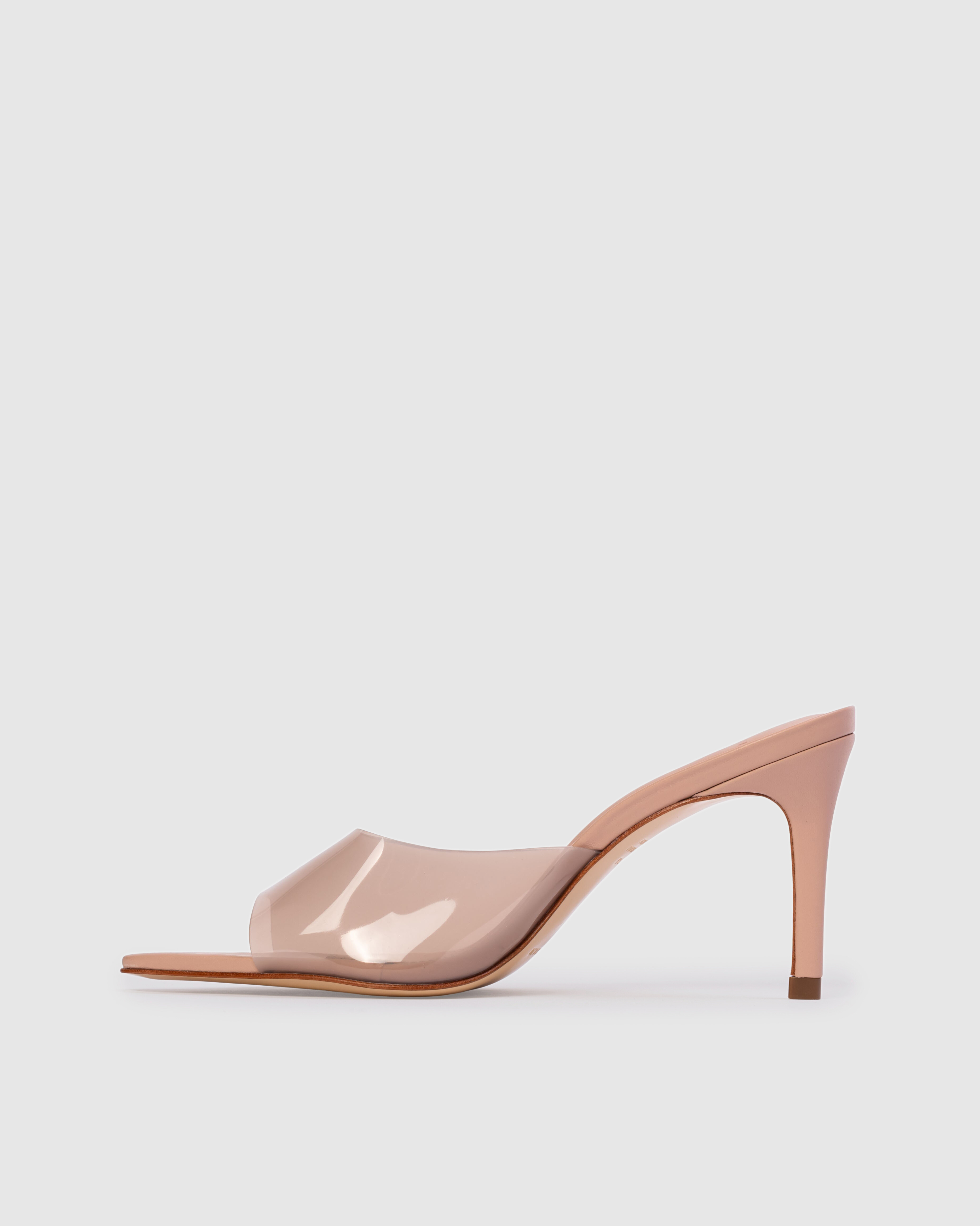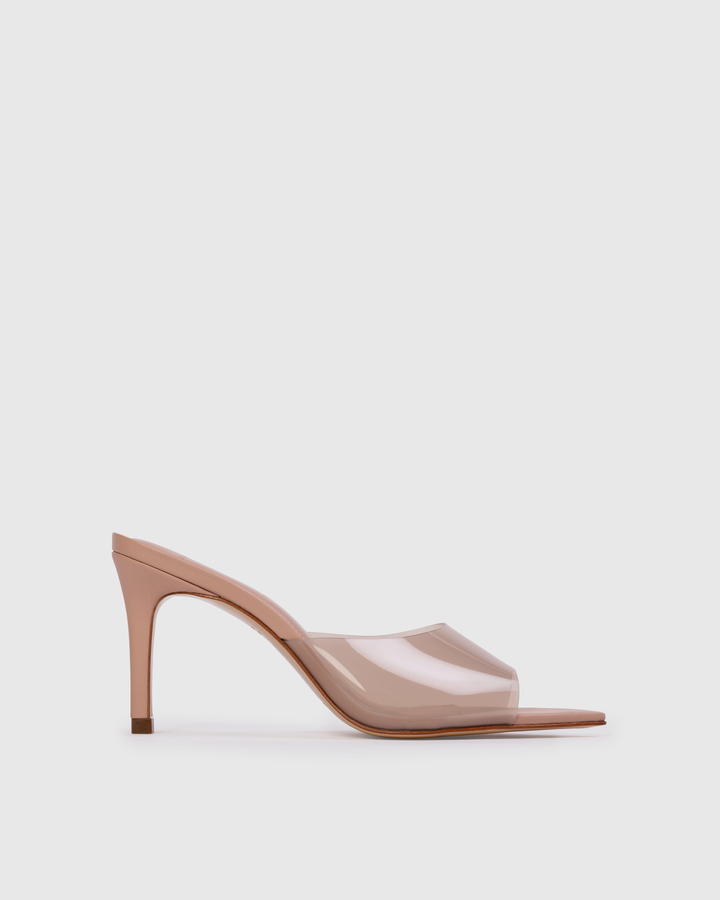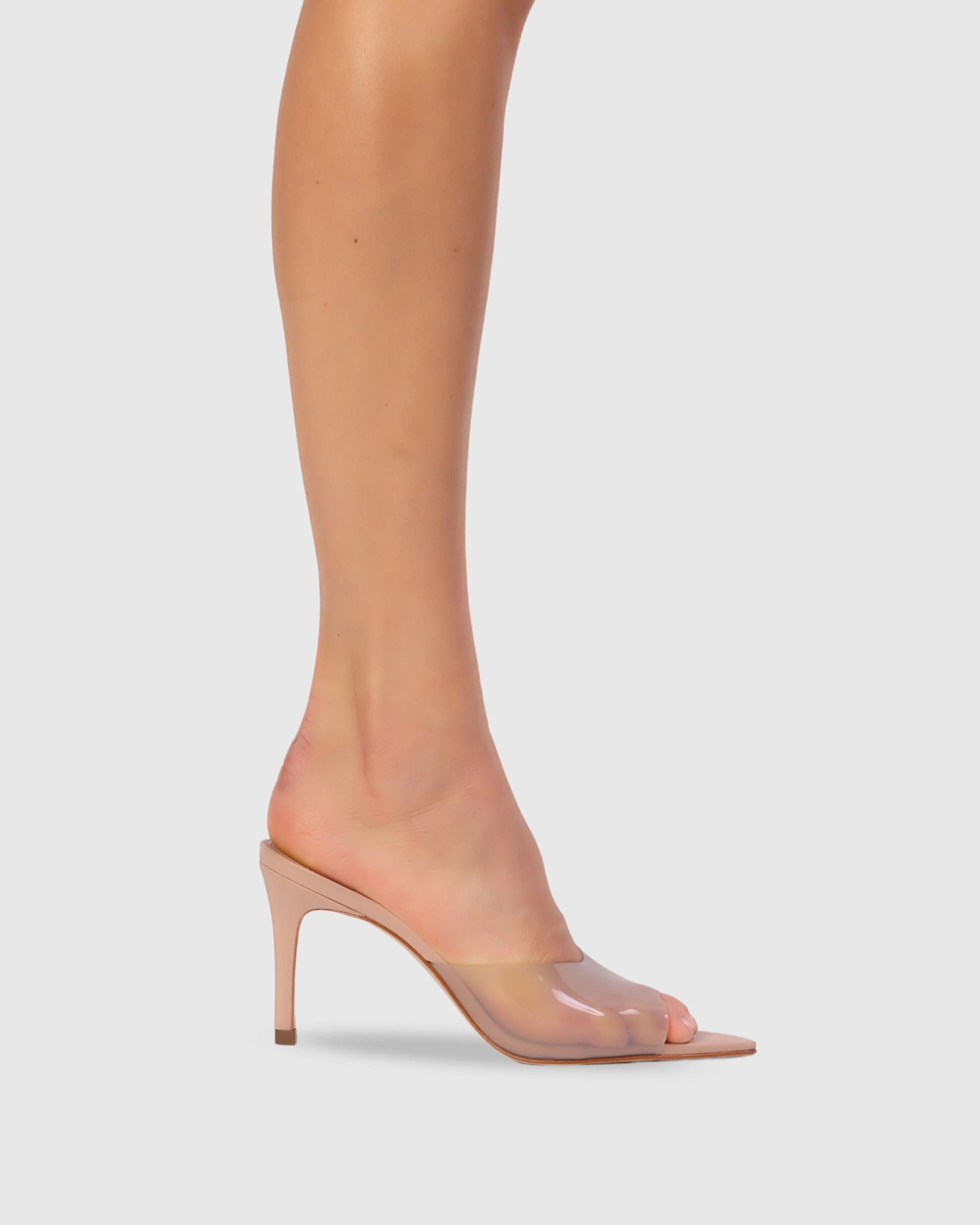 pointy toe slipper mule with pvc detail, set on a straight stiletto heel. Made with smooth buffed leather.