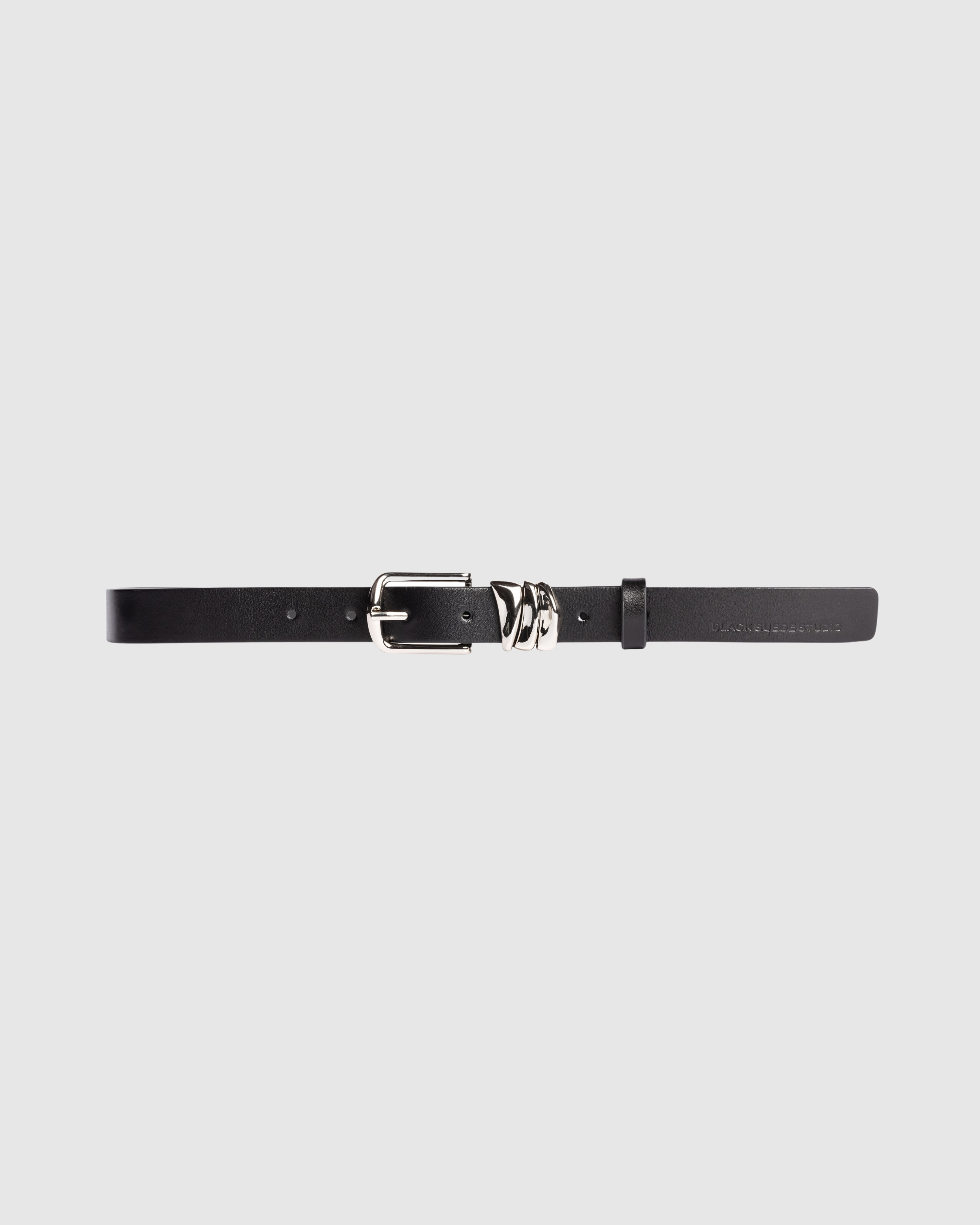 Silver plated brass classic buckle with triple hardware loops. Secured on a smooth buffed leather strap.