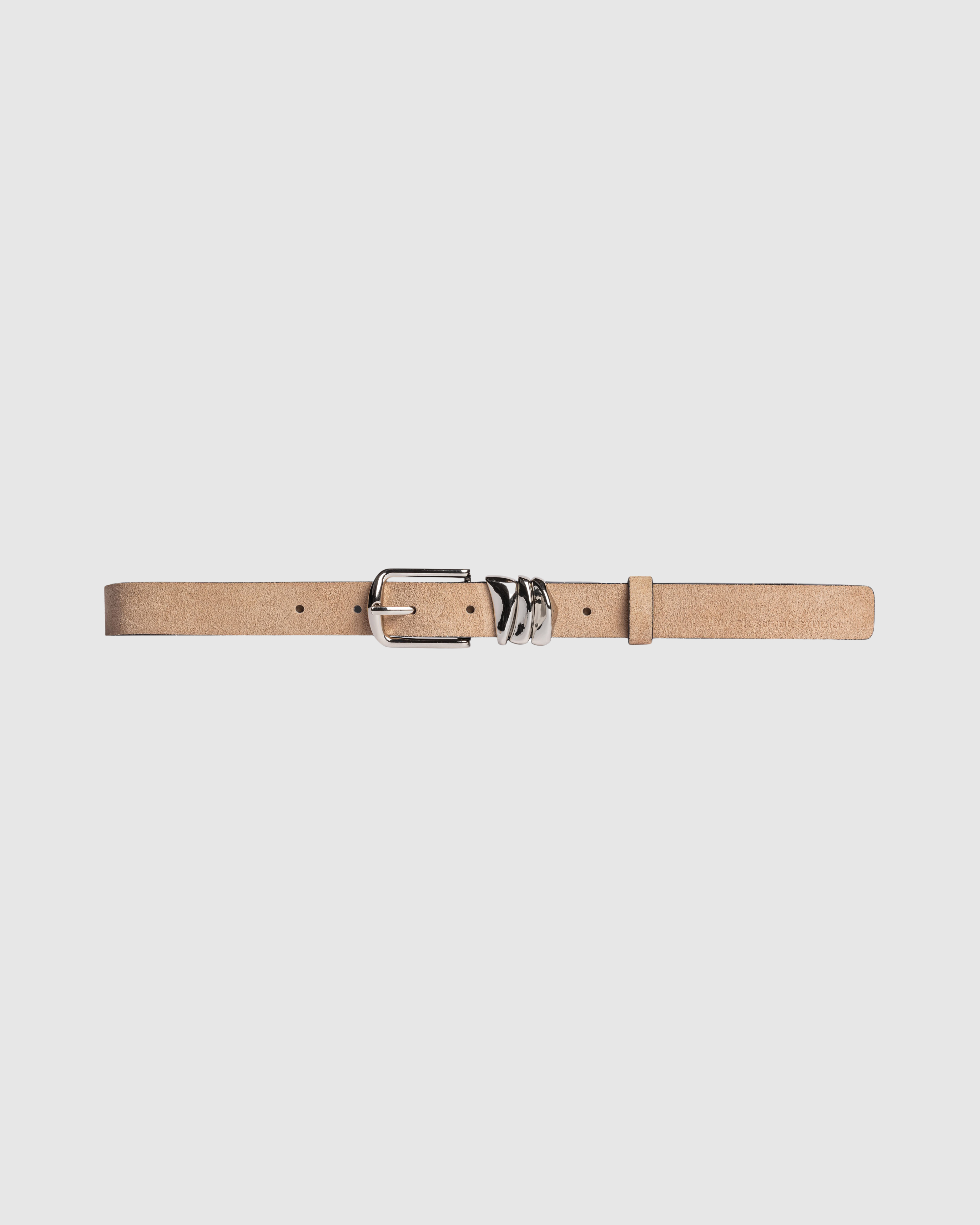 Silver plated brass classic buckle with triple hardware loops. Secured on a brushed kid suede strap.