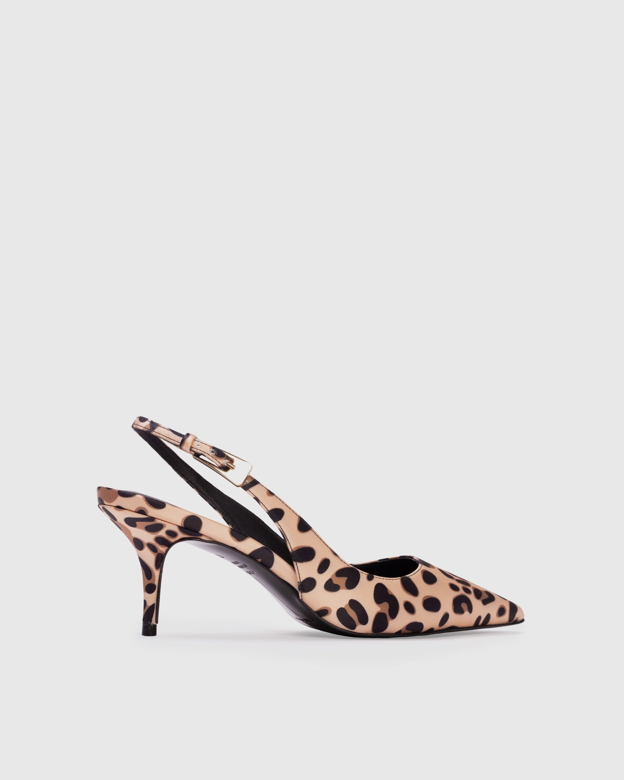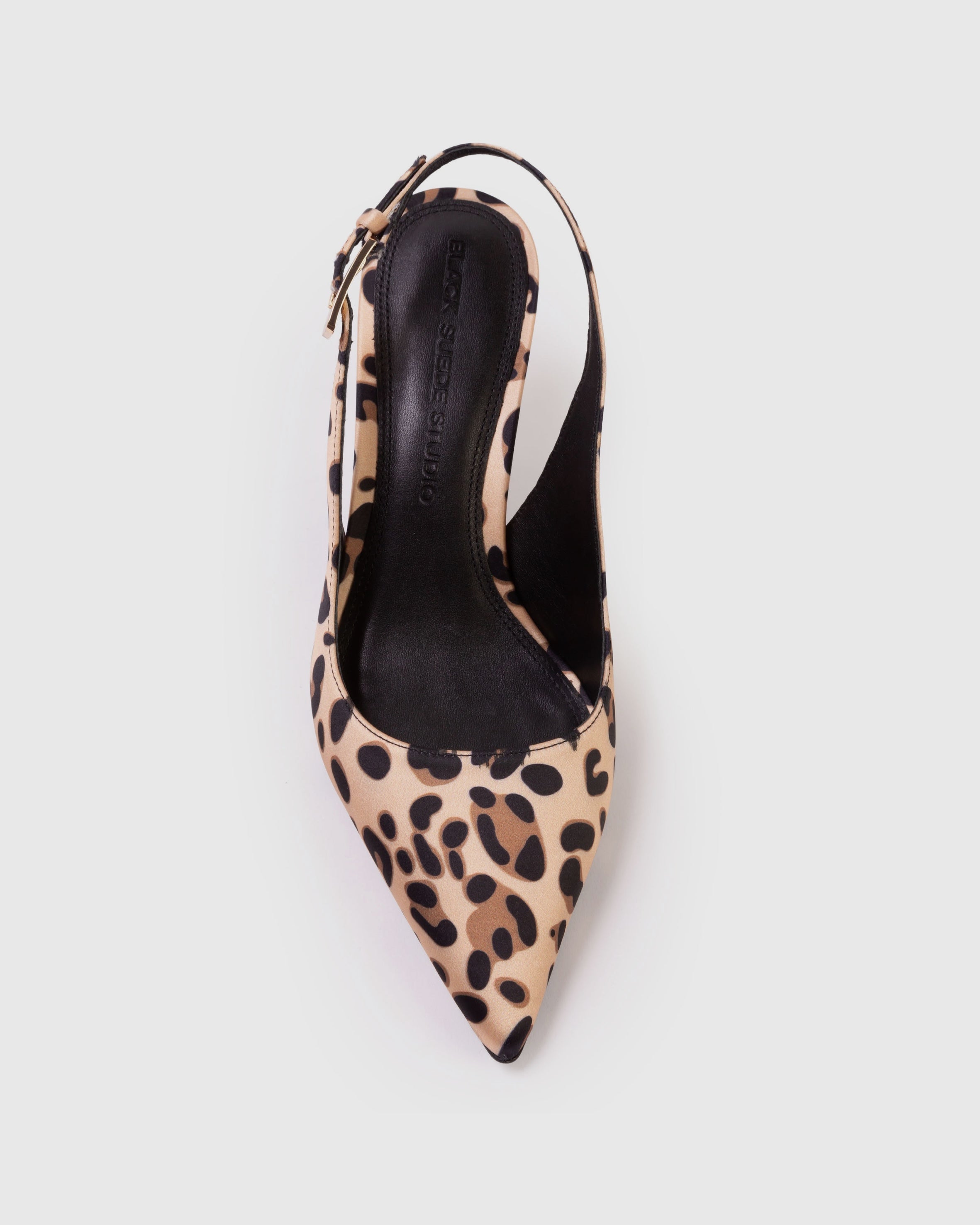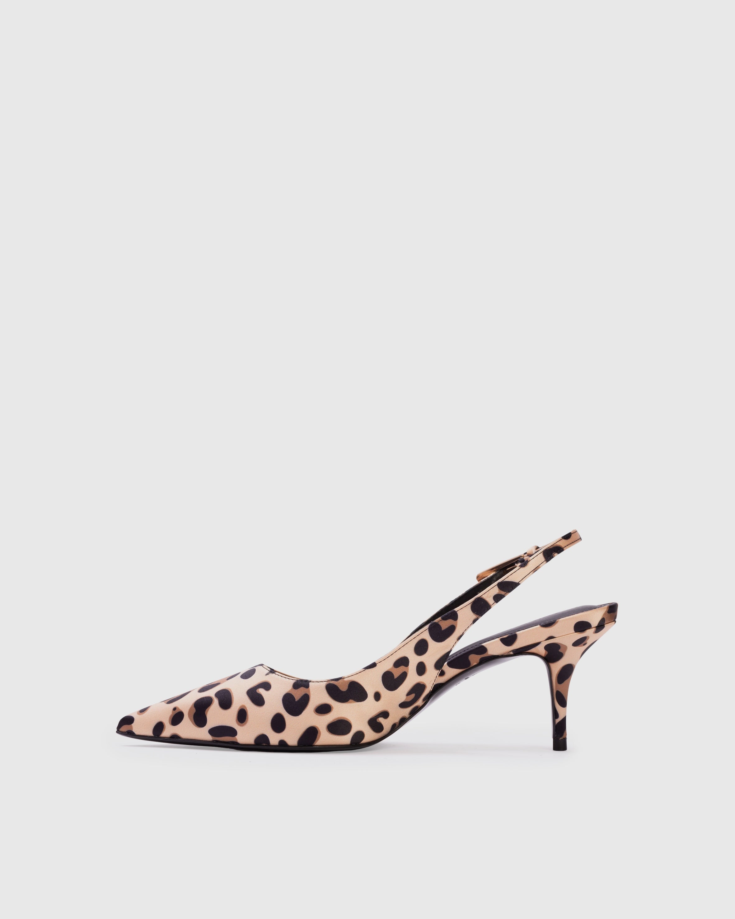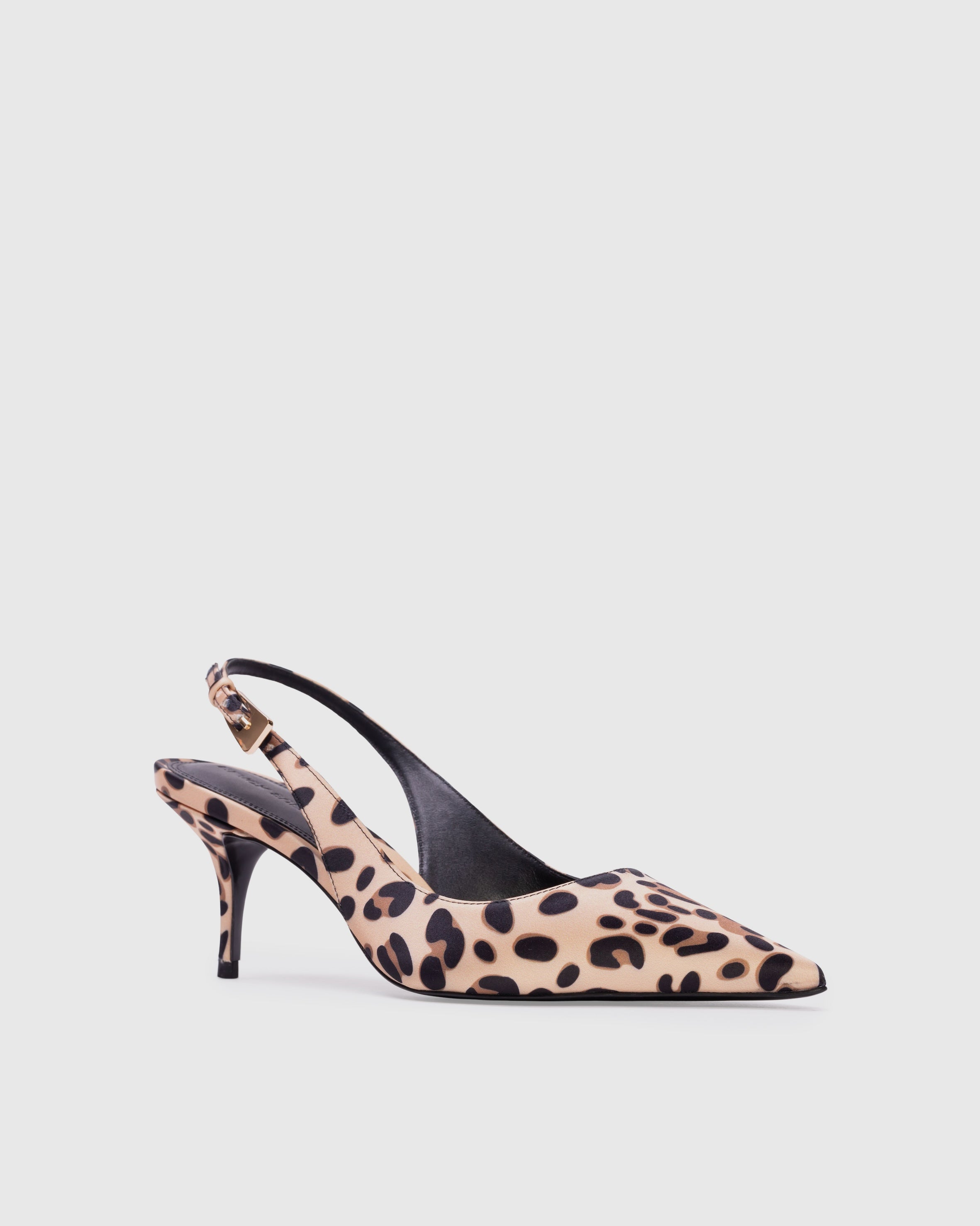 pointy toe sling back pump, set on a curved mid heel. Made with satin crepe.