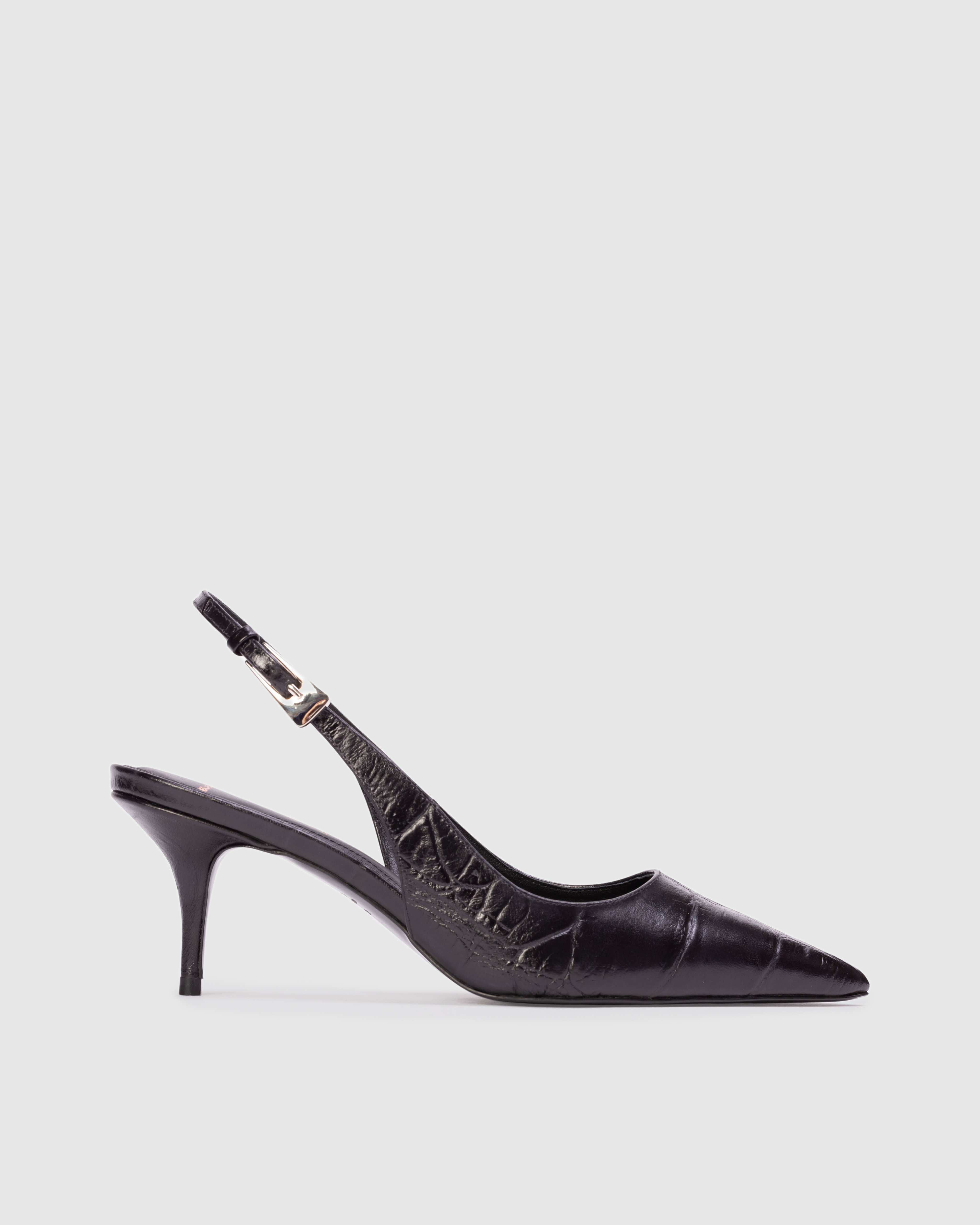 pointy toe sling back pump, set on a curved mid heel. Made with print croc leather.
