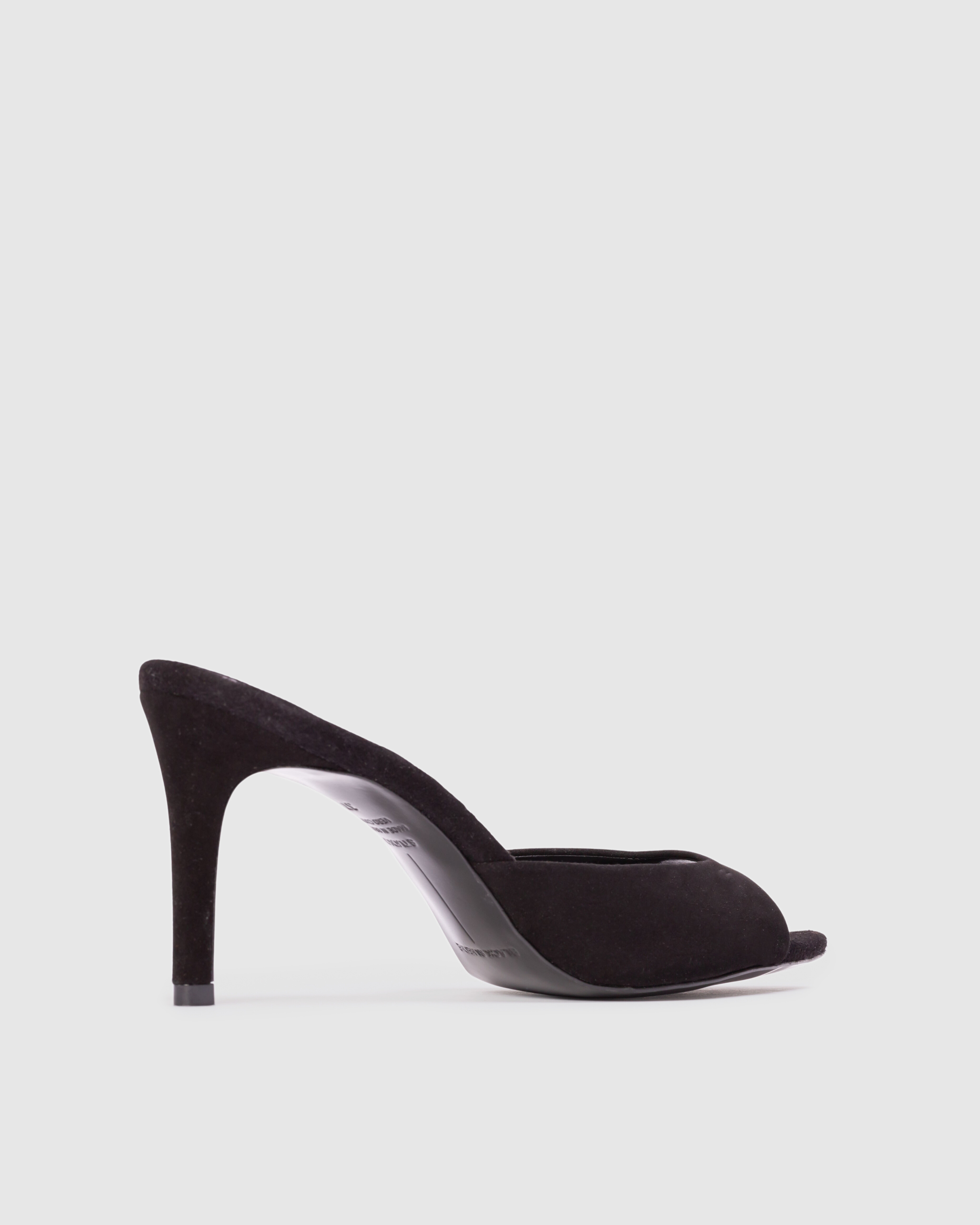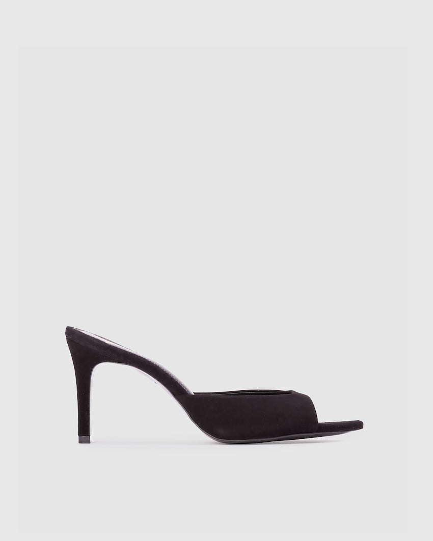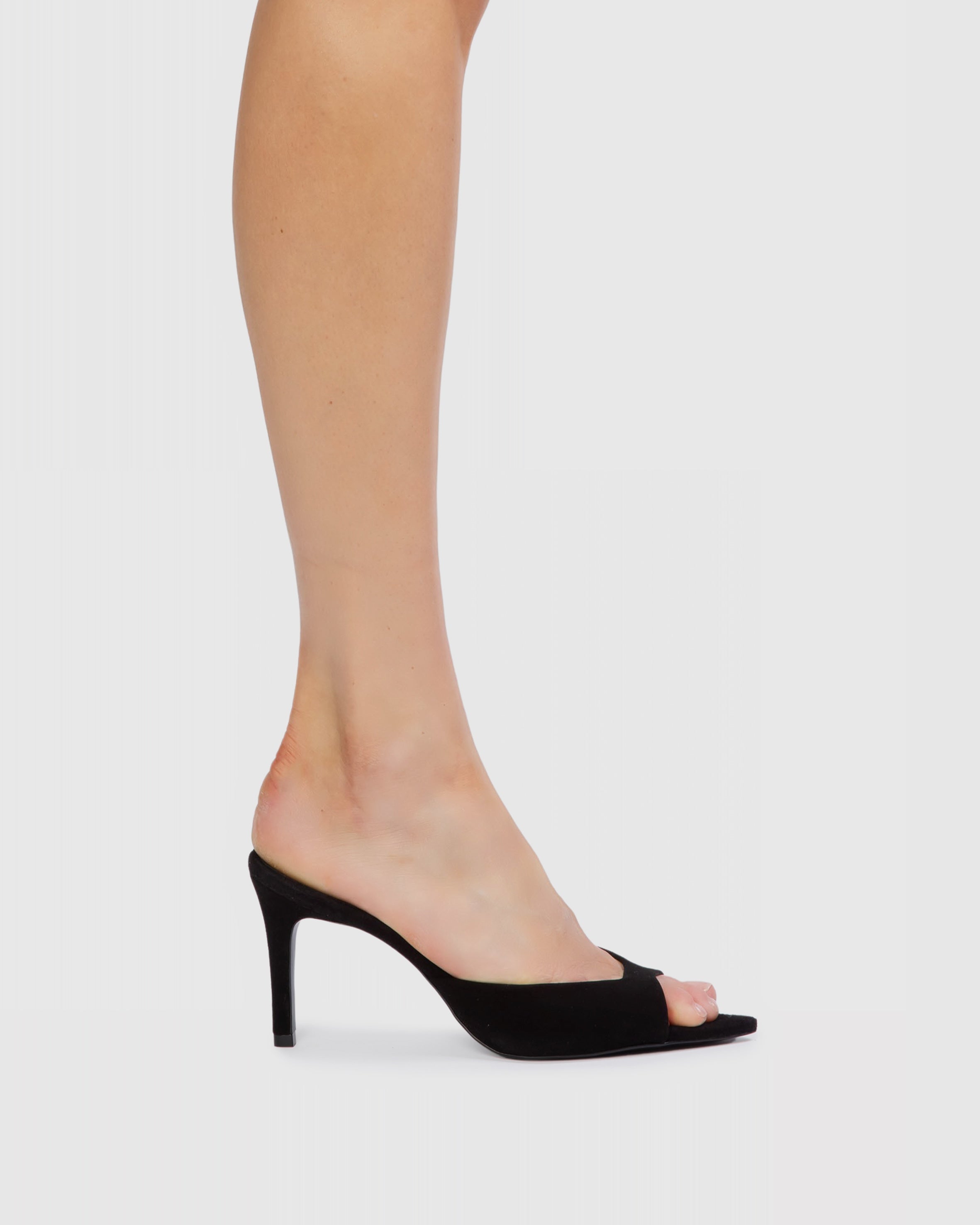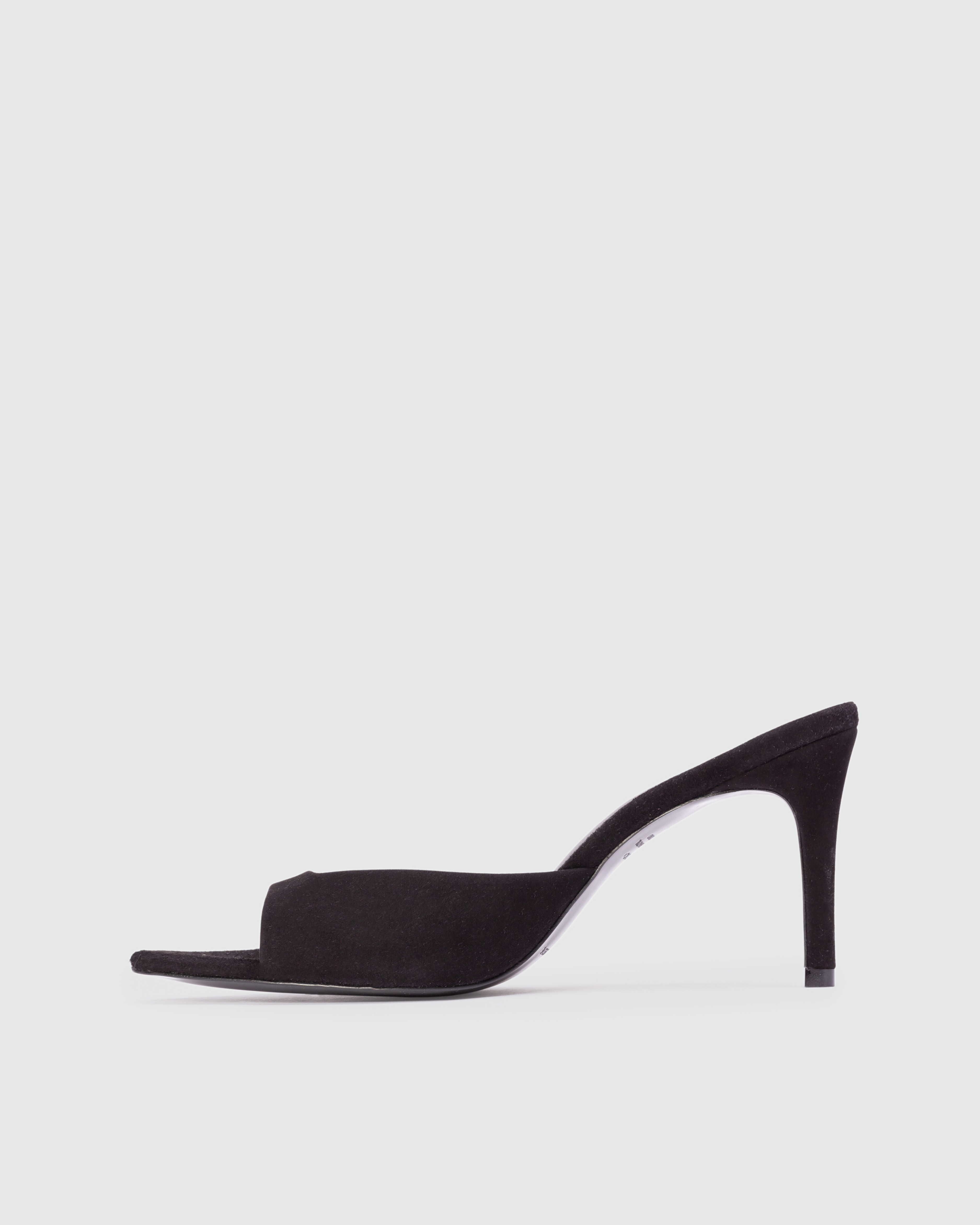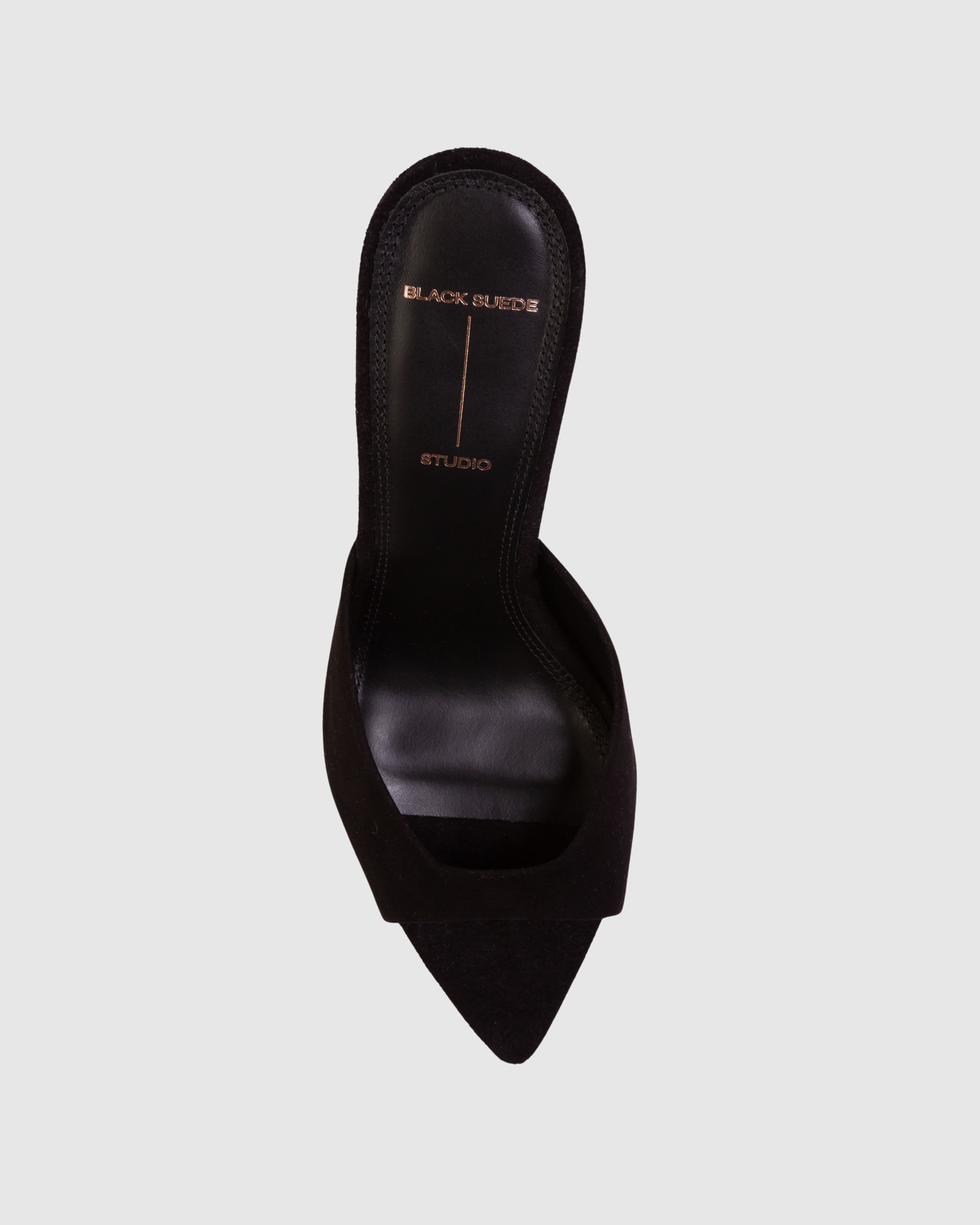 Pointy toe slipper mule, set on a straight high heel. Made with brushed kid suede.