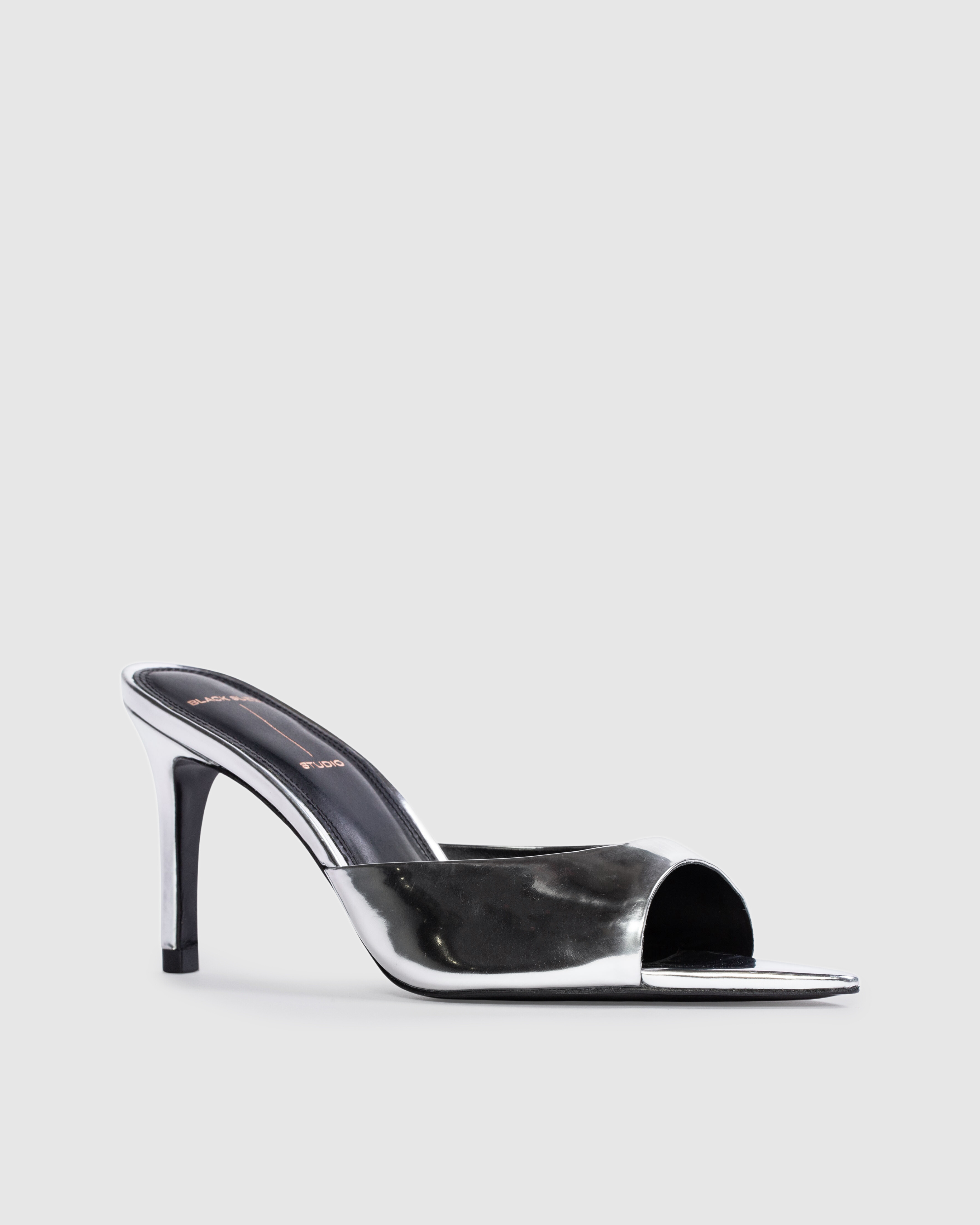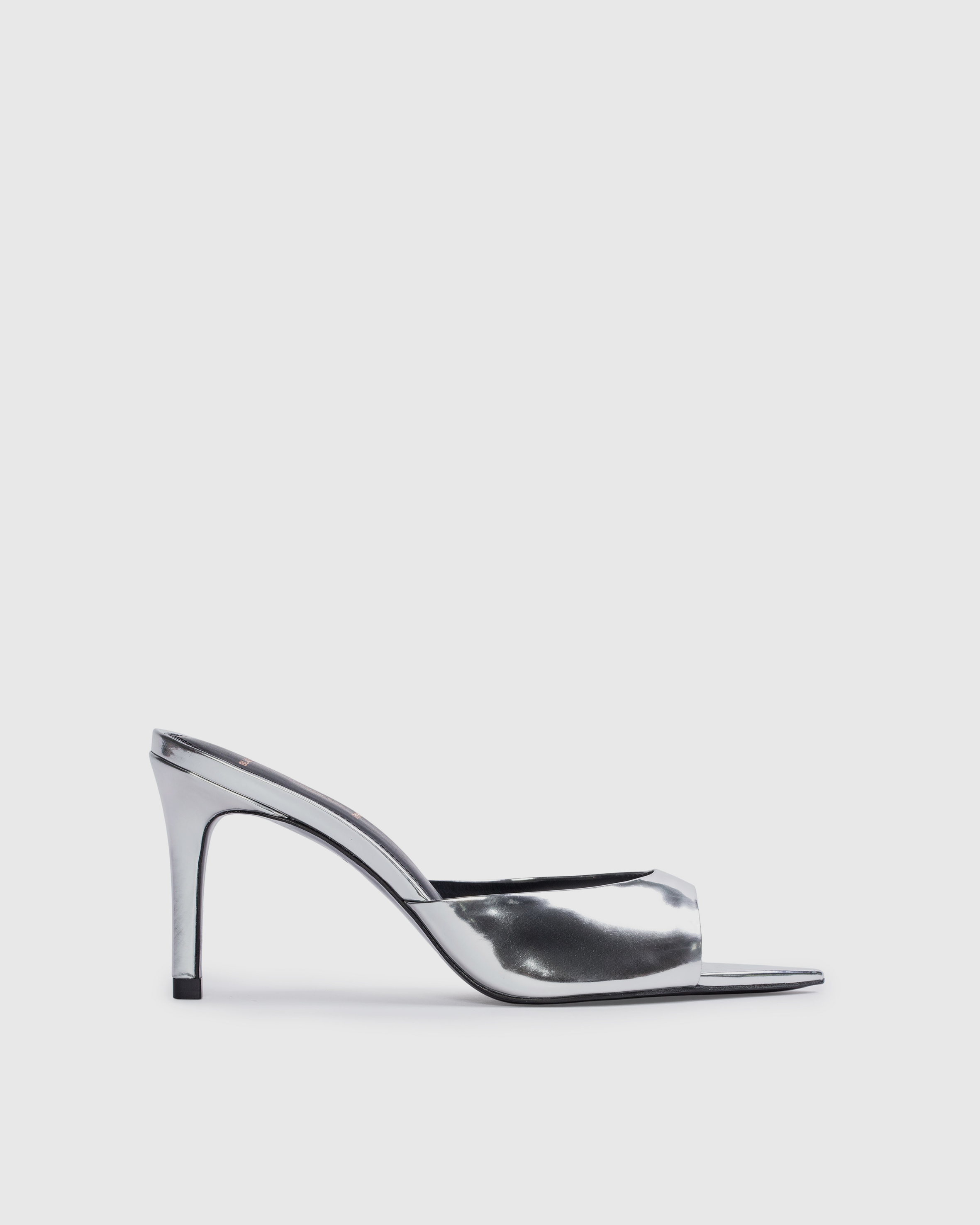 Pointy toe slipper mule, set on a straight high heel. Made with mirror metallic leather.