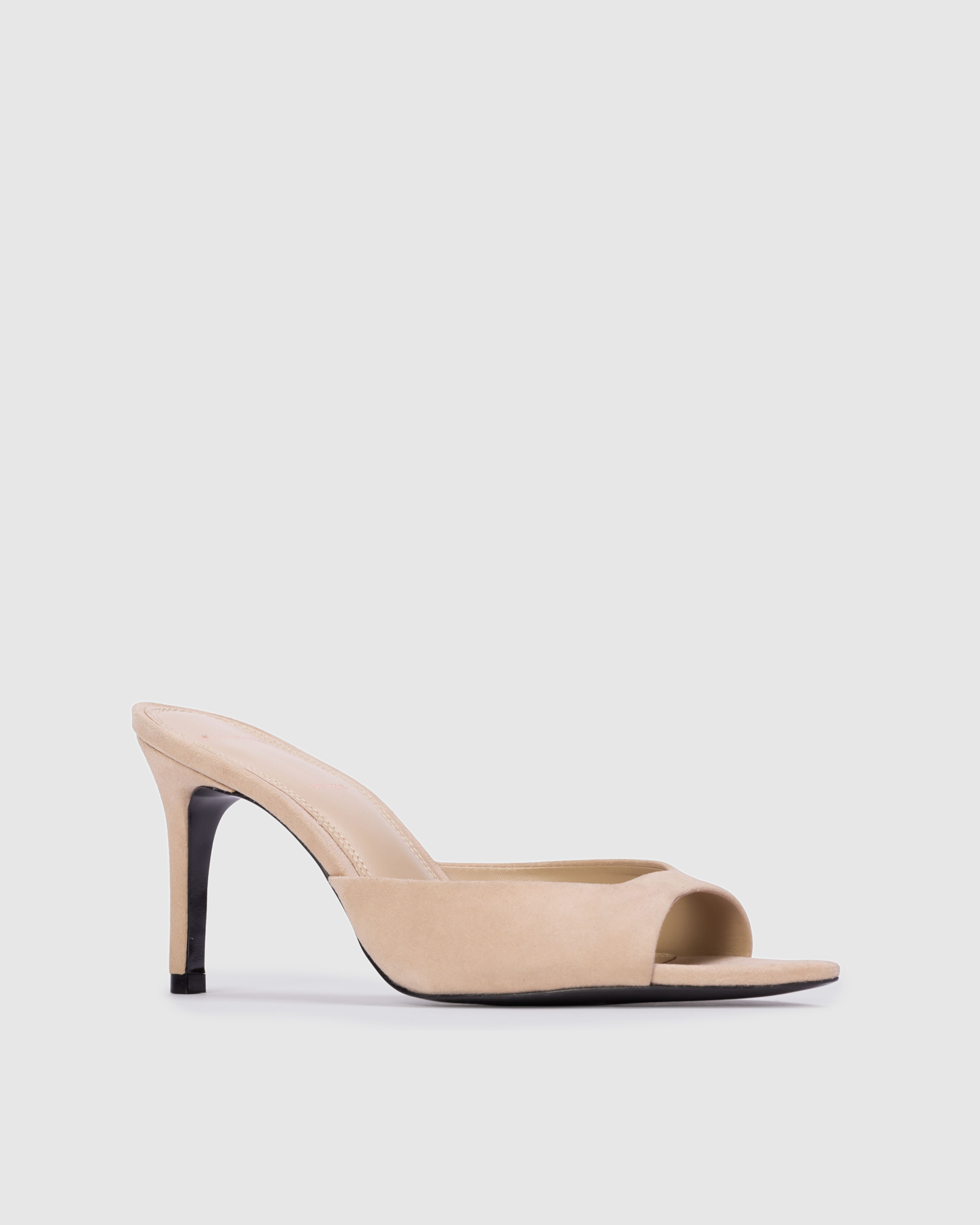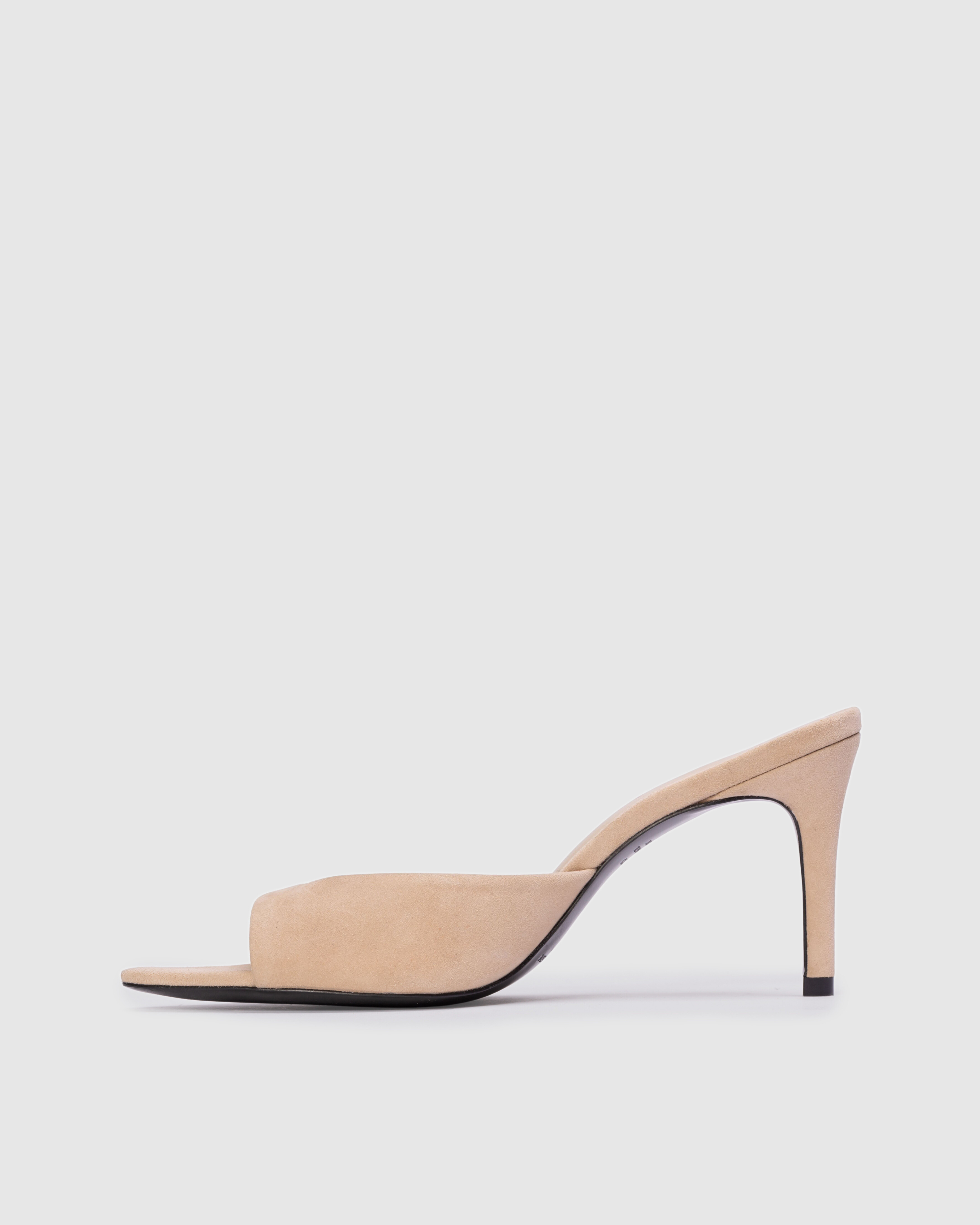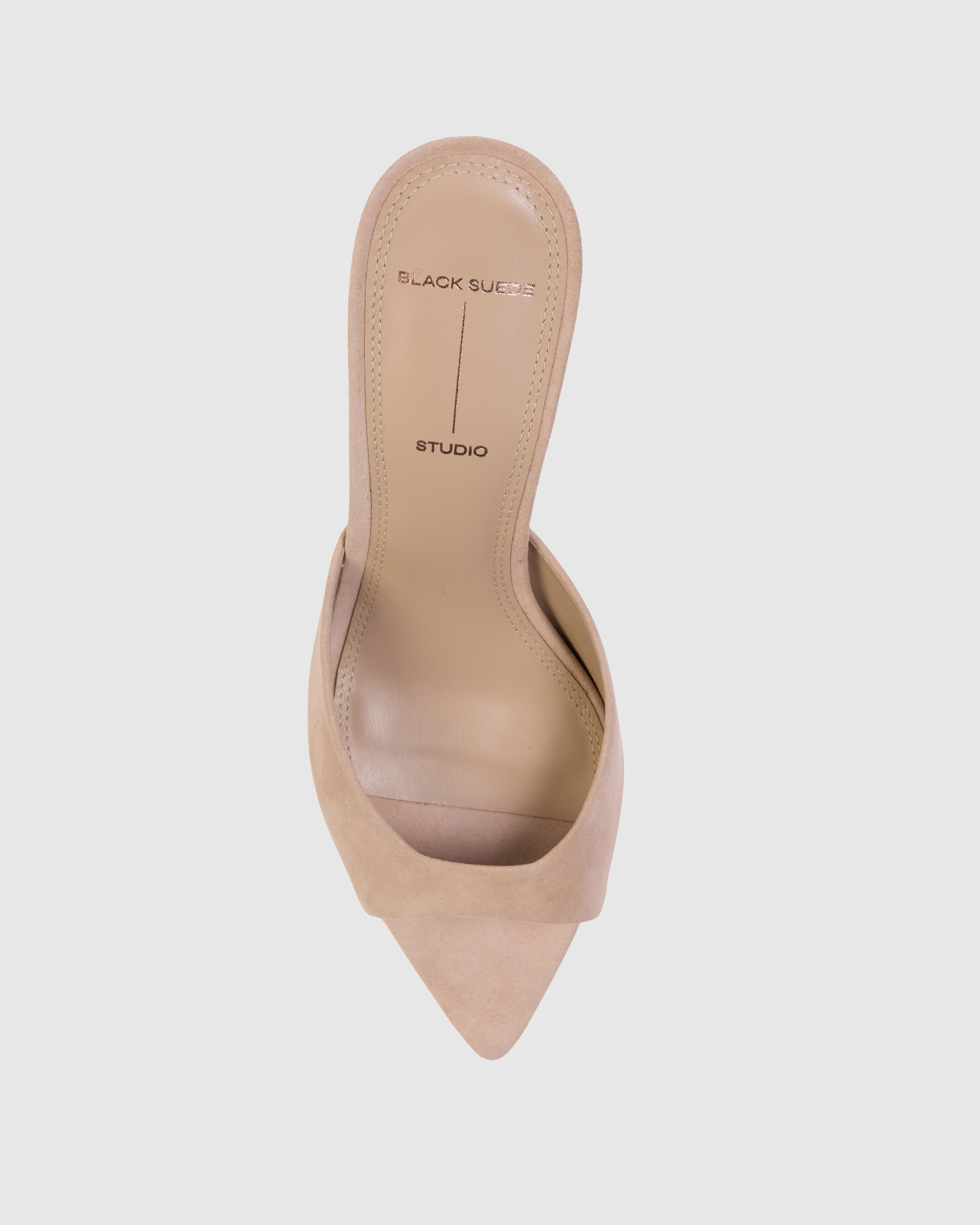 Pointy toe slipper mule, set on a straight high heel. Made with brushed kid suede.