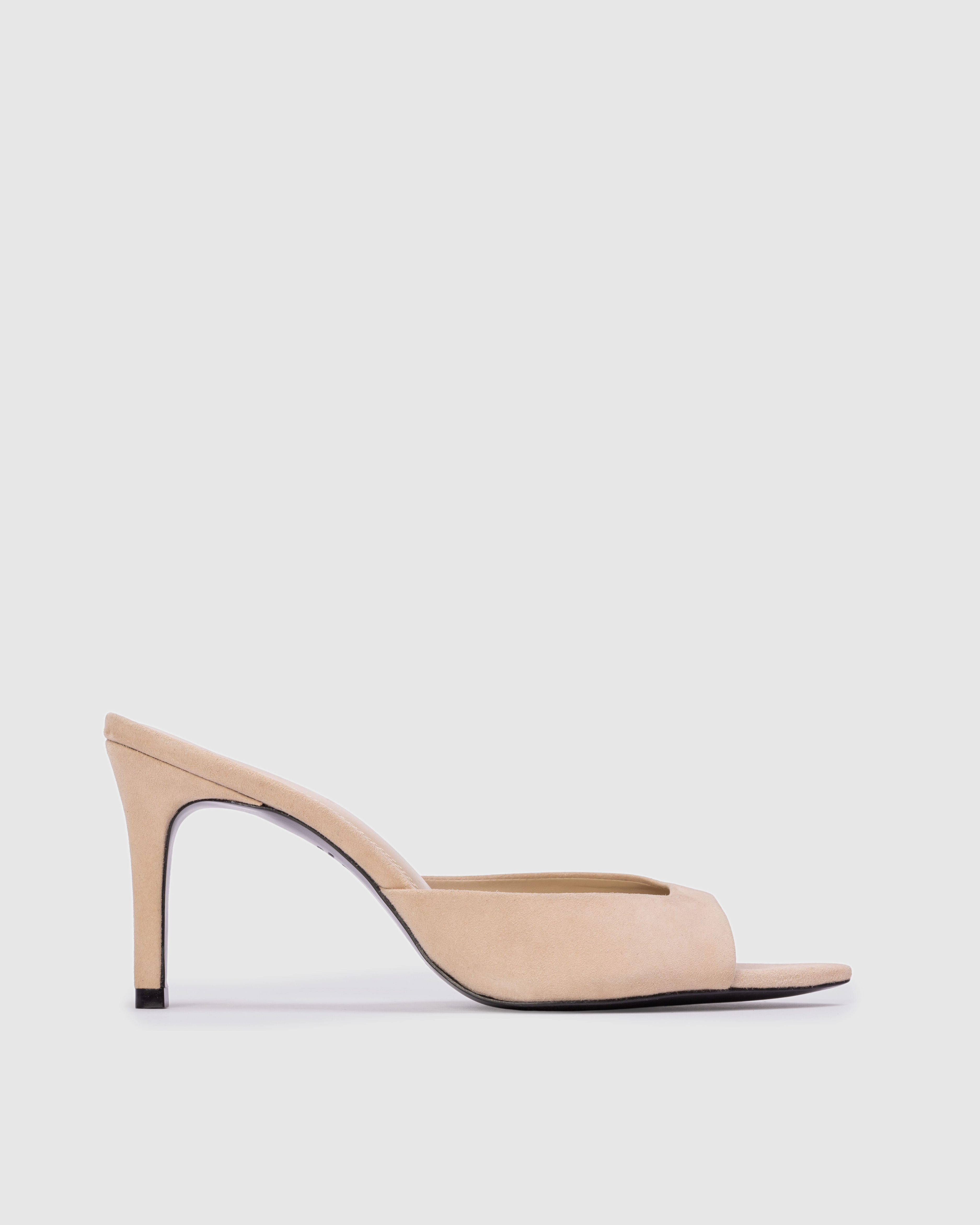 Pointy toe slipper mule, set on a straight high heel. Made with brushed kid suede.